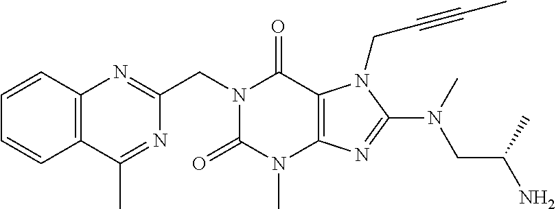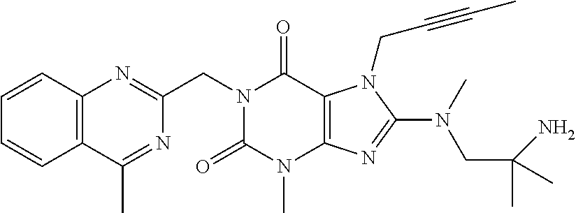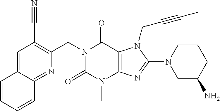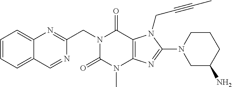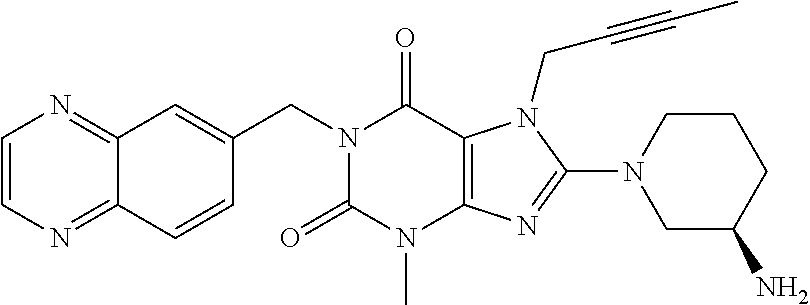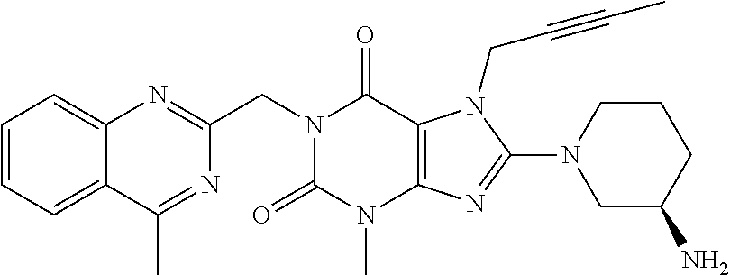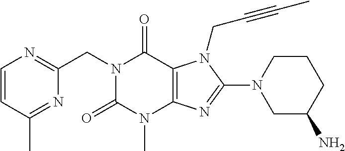 Other aspects of the present invention become apparent to the skilled person from the foregoing and following remarks. A DPP-4 inhibitor within the meaning of the present invention includes, without being limited to, any of those DPP-4 inhibitors mentioned hereinabove and hereinbelow, preferably orally active DPP-4 inhibitors. For example, a DPP-4 inhibitor according to this invention may be such an oral DPP-4 inhibitor, which and whose active metabolites have preferably a relatively wide (e.g. about >100 fold) therapeutic window and/or, especially, that are primarily eliminated via hepatic metabolism or biliary excretion. In more detailed example, a DPP-4 inhibitor according to this invention may be such an orally administered DPP-4 inhibitor, which has a relatively wide (e.g. >100 fold) therapeutic window and/or which fulfils one or more of the following pharmacokinetic properties (preferably at its therapeutic oral dose levels):