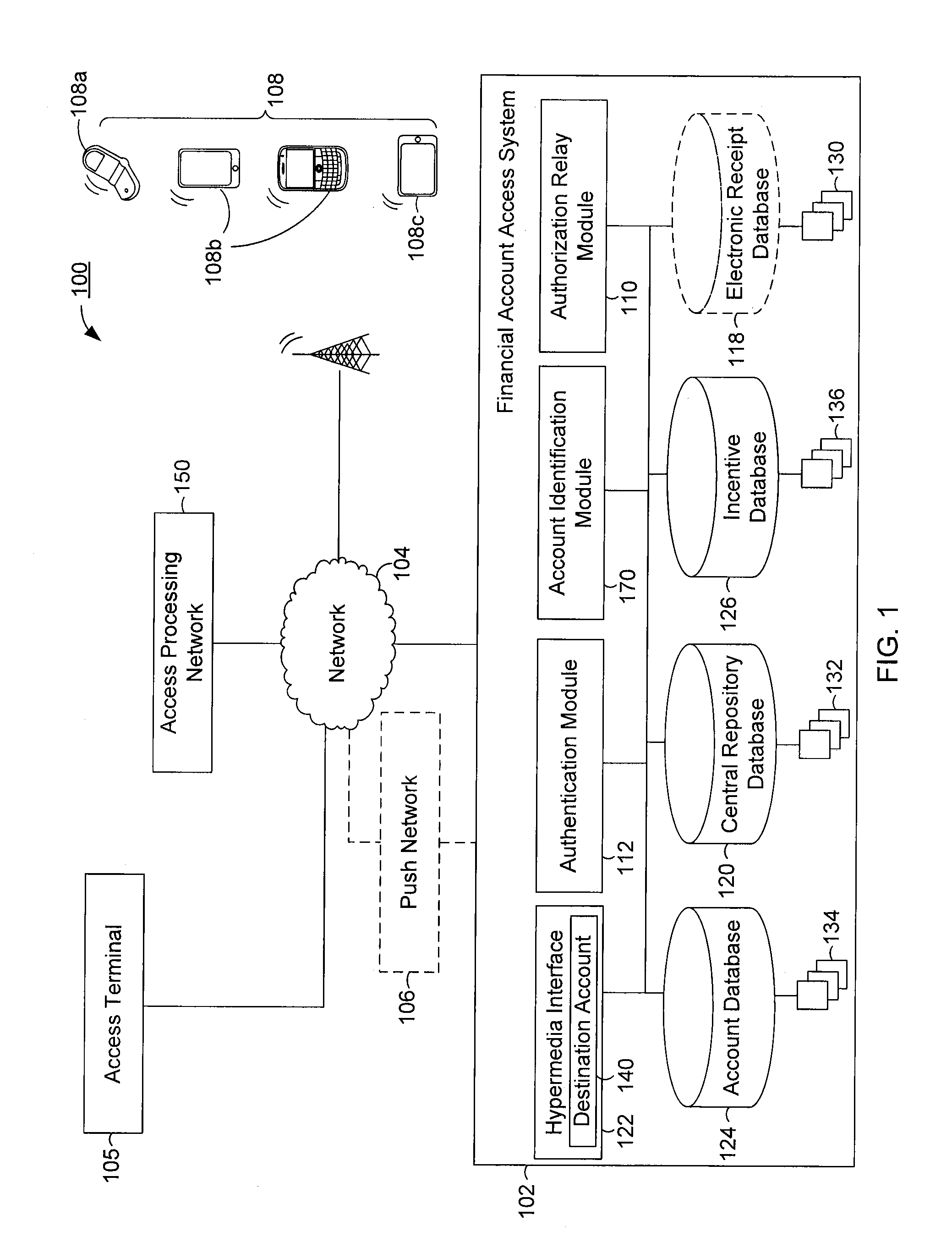 i) receiving financial account information and access data from an access terminal, and ii) identifying a destination account from the financial account information; and (b) an authorization relay module comprising a processor and a memory containing instructions for: