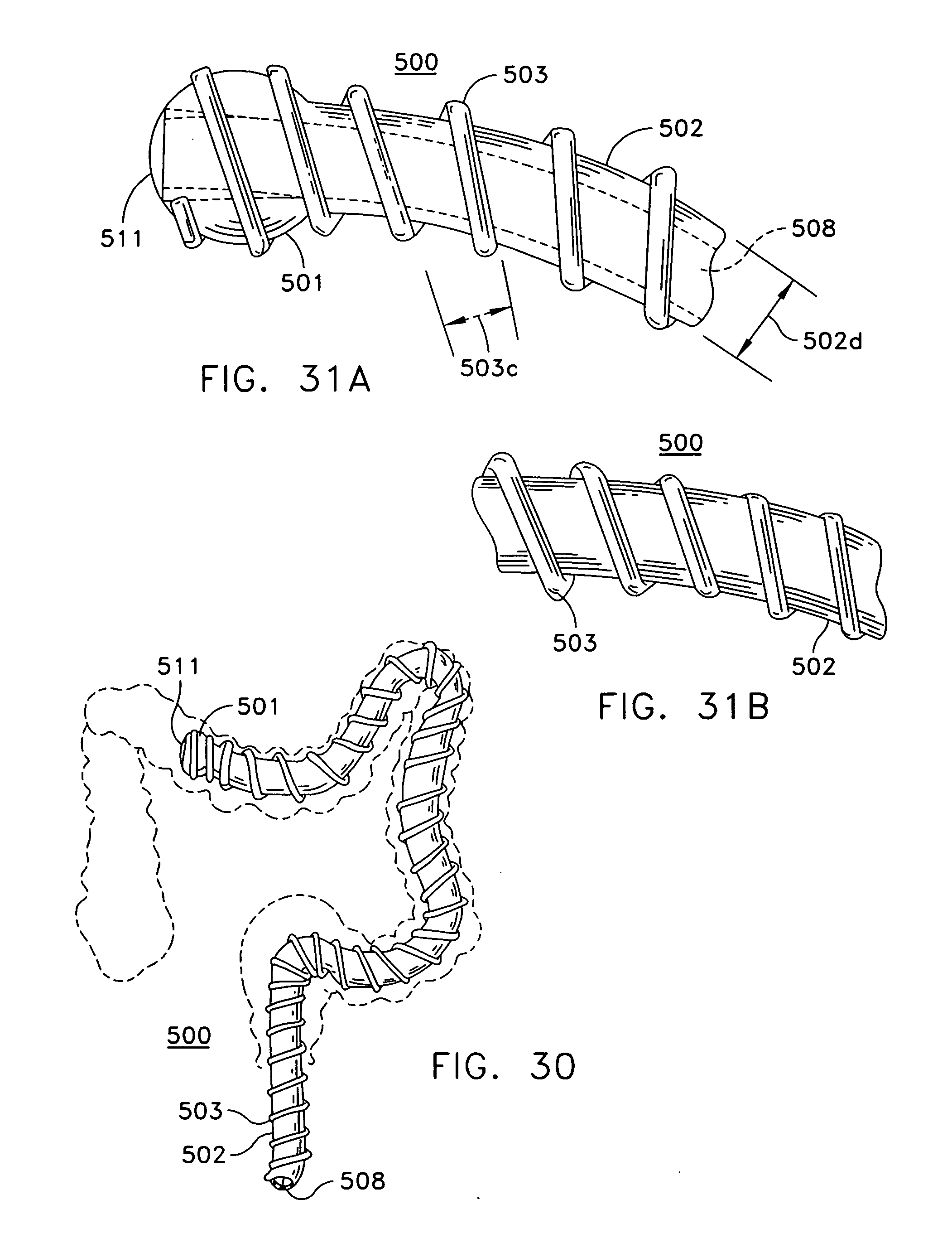 The inner layer of circular muscle is present throughout the colon. The outer longitudinal muscle in the wall of the colon is fused into three bands, the teniae coli. These bands start at the base of the appendix and run in the wall of the colon down to the rectum, where they diffuse into the muscular coat. The three teniae cause the colon to have a triangular appearance endoscopically; this is especially prominent in the ascending and transverse colon. The haustra are outpouchings of the colon, separated by folds. In the descending colon the endoscopic appearance is often tubular. Most experienced colonoscopists use similar endoscopic techniques. Air is introduced to inflate the colon, but as little as possible to prevent overdistension. The pushing pressure on the endoscope is gentle to avoid stretching the colonic wall or mesentery (the connective tissue that holds the colon like a fan) which can cause pain, a vagal episode, or a perforation. The lumen is kept in view at all times; little or none of the examination is performed blindly, because the colonoscopist is pushing a stiff instrument through delicate tissue. A variety of in and out maneuvers are used to “accordian” the colon on the colonoscope, keeping the colonoscope as free of loops as possible. In the difficult colon, special maneuvers such as the creating of an alpha loop in the sigmoid colon are used to pass the sharply angulated sigmoid/descending colon junction. This maneuver may require fluoroscopic guidance and training in the technique. The colonoscope is advanced to the cecum under direct visualization. The detailed examination of the mucosa is usually performed as the colonoscope is slowly removed from the cecum. To inspect the whole length of the large intestine requires a highly skilled practitioner, which makes the procedure costly. Even still, the procedure can be very painful for the patient, making sedation necessary. This is due to the inherent deficiencies in the “push-to-advance” design. In summary, there are problems in making present push-in catheters, dilators, and occluders stiff enough for penetration and flexible enough to make the turns without undue risk of trauma to the wall of the passageway when being pushed in; and once installed, comfortable enough to wear for an extended period of time. The problems with stent encrustation and removal are well known. Self-administration is inhibited by all of the short-comings of the prior art. Further injury, infection and discomfort can result from unskilled or improper technique. The problems with colonoscopy have been previously described. The long history of push-in catheters/dilators and occluders has gradually crystallized into an industry-wide, self-perpetuating, fundamental assumption that catheters are to be mainly pushed through bodily passageways, albeit with some rotational easing. This “fact” is so widely perpetuated and pervasive in the commercially-available products and medical practices as to have stifled original thinking in this art. This, in spite of the well-recorded shortcomings of pain, trauma, risk of rupture, and failed, aborted or incomplete procedures, and the need for skilled practitioners and special equipment for monitoring and safeguarding against the inherent problems. For the purposes of this disclosure, including the appended claims, the terms “distal”, “distally”, and “distal end”, as they relate to the devices and methods described herein, refer to the end of the device further from, or in the direction away from, a practitioner who might be applying the device or method to the subject. Stated otherwise, the aforementioned terms refer to the end of the device closer to, or in the direction towards, the subject's interior. The terms “proximal”, “proximally”, and “proximal end”, as they relate to the devices and methods described herein, refer to the end of the device closer to, or in the direction towards, the practitioner who might be applying the device or method, rather than to the subject. Objects of the invention include providing and employing screw-based means for rotational advancement and anchoring of catheters, probes, occluders, stents, and dilators into genitourinary and gastrointestinal passageways such as the urethra, ureter, esophagus and fallopian tube, and for the emplacement of suprapubic catheters for draining genitourinary organs such as the bladder, whereby the subject device is applied through a natural body orifice or surgically created opening and is drawn through the passage by the longitudinal pull of a helix on the walls of the passage or organ as the device is rotated. This technology is a radical departure from the 4000 year old traditional “push-to-advance” methodology previously discussed. Flexible, thin-wall indwelling and intermittent catheters and related devices and delivery stylets, made possible by this rotate-to-advance form of emplacement, are less traumatic and easier for the medical practitioner or patient to use. The catheter of the invention eliminates the problems of conventional devices by using helix or rotational technology that provides controlled insertion and flexibility to negotiate the urethra. The helix design accomplishes a pre-dilatation of the passageway at a steady rate that relaxes the sphincter and lessens or prevents spasm. Once placed, the device is anchored by the radial displacement and close pitch of the helix, preventing longitudinal migration due to body movement or fluid flow. In another embodiment, the helix is located on the shaft under a Foley-type balloon and disappears when the balloon is inflated. The flexible, reinforced shaft need be only about half the wall thickness of conventional Foley catheters, which means a smaller outer diameter (OD) catheter can be used. The helix advances the shaft and dilates the urethra as the catheter is inserted. Once the bladder is reached, the balloon is inflated with sterile wa