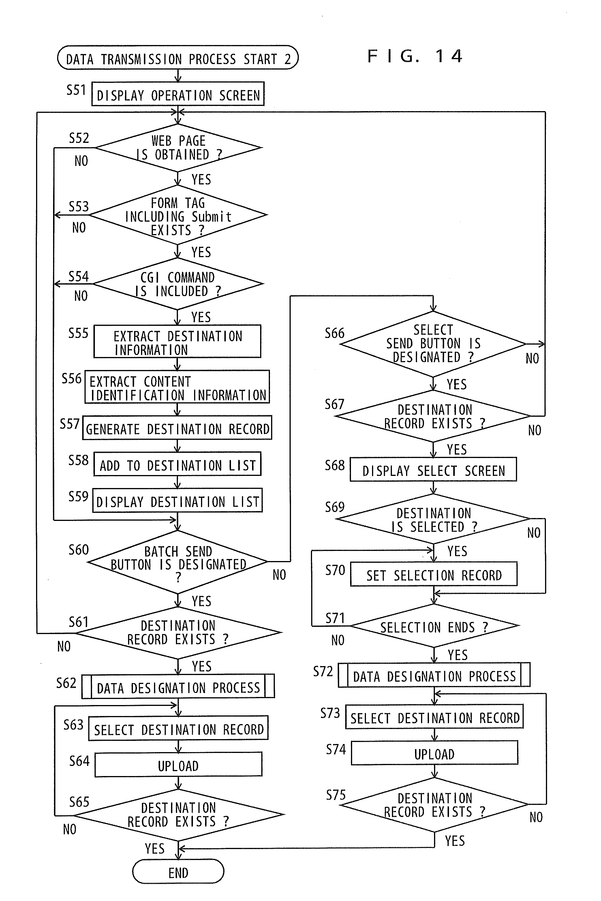 obtaining content written in a markup language; extracting destination information by analyzing said obtained content; displaying said obtained content; generating a set of destination information by successively adding a plurality of destination information extracted from a plurality of contents displayed in said step of displaying content; and transmitting data based on said generated set of destination information. 18. The computer-readable non-transitory recording medium encoded with a data transmission program according to said step of transmitting includes the step of transmitting said data based on the destination information associated in said step of associating. 19. The computer-readable non-transitory recording medium encoded with a data transmission program according to 20. The computer-readable non-transitory recording medium encoded with a data transmission program according to 21. The computer-readable non-transitory recording medium encoded with a data transmission program according to said step of transmitting includes the step of transmitting said data based on destination information included in the list generated in said step of adding to a list. 22. The computer-readable non-transitory recording medium encoded with a data transmission program according to said step of transmitting includes the step of transmitting data said based on said selected destination information. 23. The computer-readable non-transitory recording medium encoded with a data transmission program according to