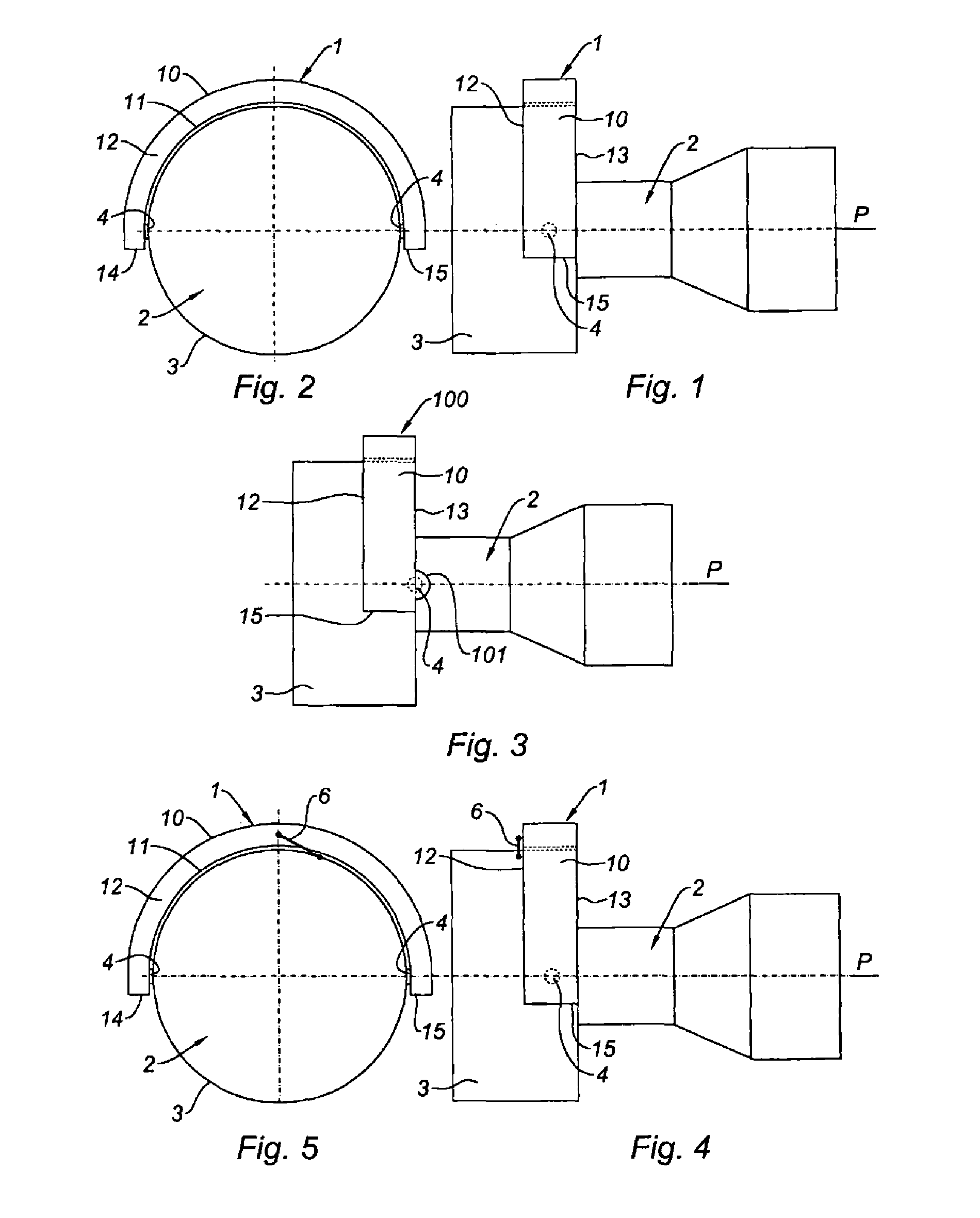 Moreover, each branch of the one-piece structure has an attachment of the engine 4, whereby the attachment structure is fixed to the fan casing 3 of the turbojet engine.