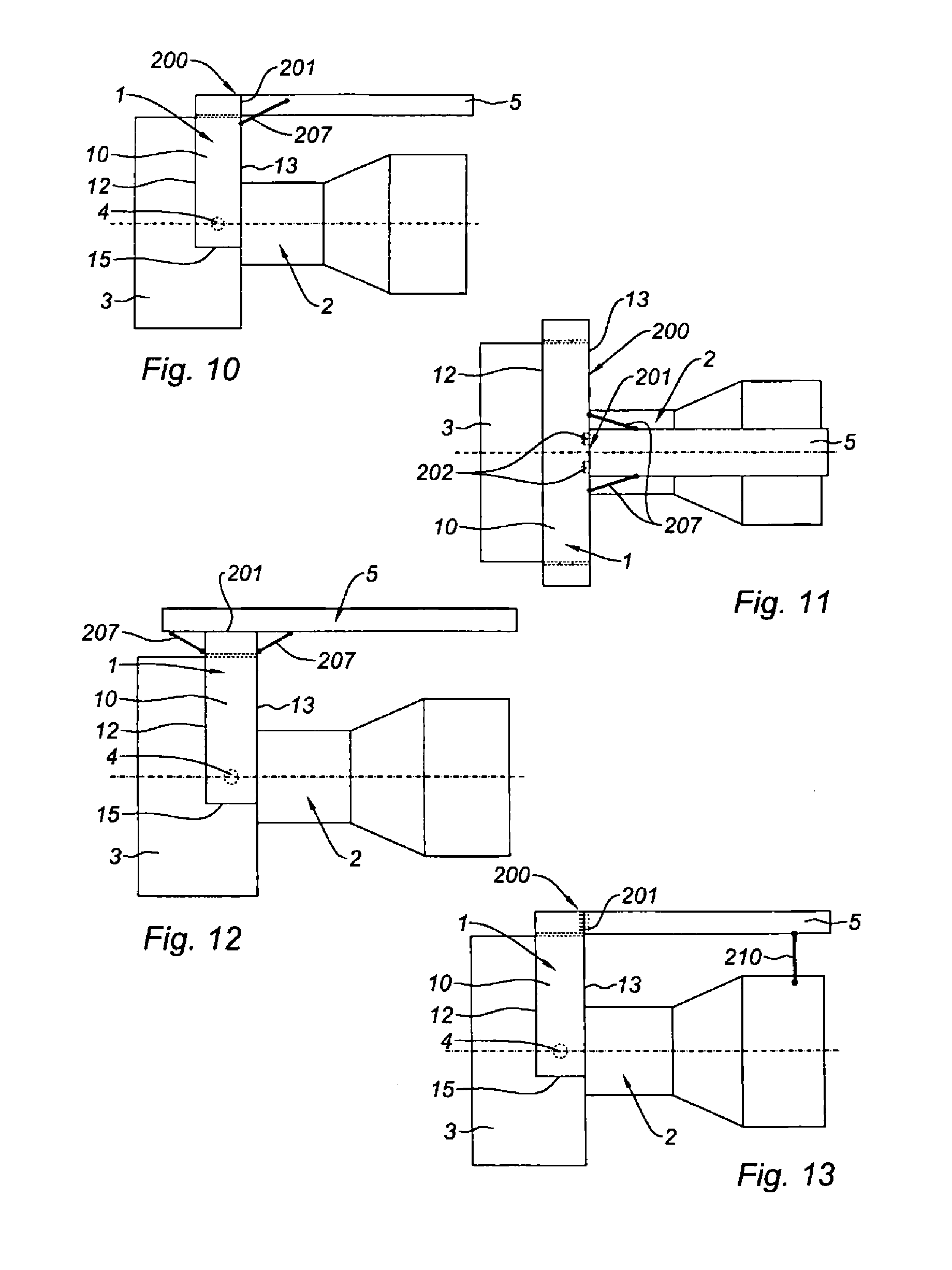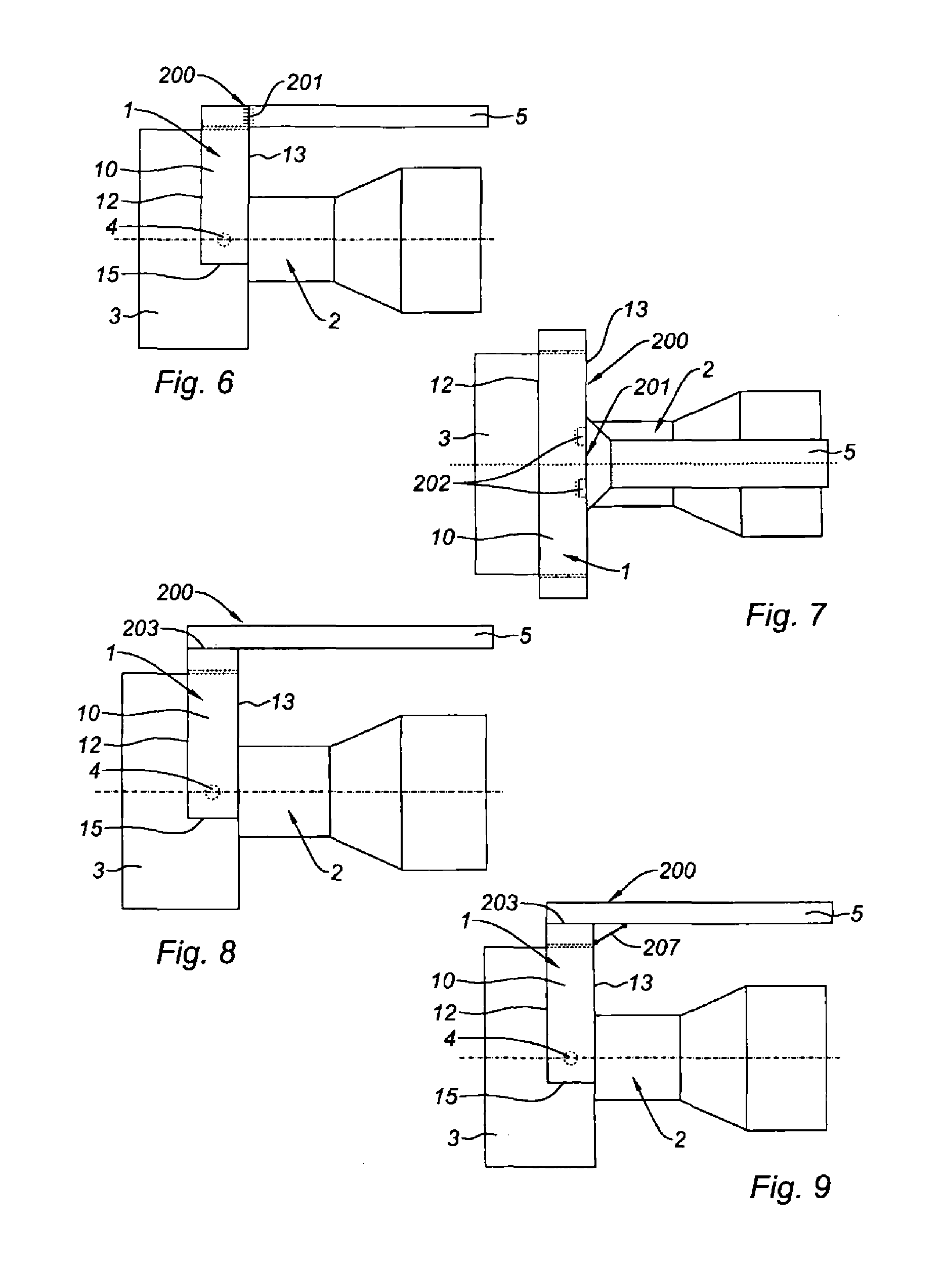 In FIGS. 6 and 7, pylon 5 is connected to the attachment structure 1 through an assembly interface 201 located on a side surface downstream 13 of the attachment structure 1.