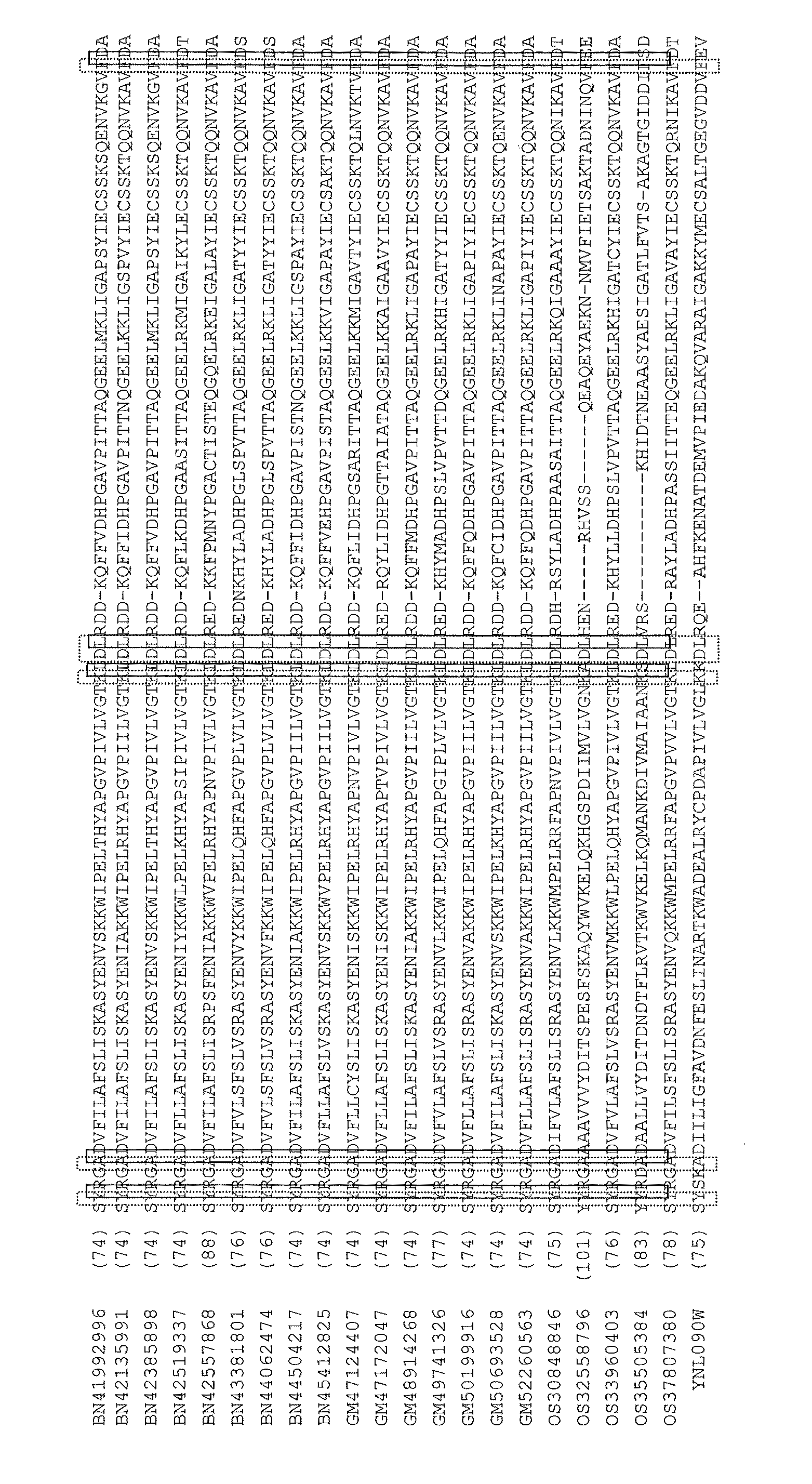 For example a sequence which has a 80% homology with sequence SEQ ID NO: 2 at the protein level is understood as meaning a sequence which, upon comparison with the sequence SEQ ID NO: 2 by the above program algorithm with the above parameter set, has a 80% homology. Functional equivalents derived from one of the polypeptides as depicted in SEQ ID NO: 2, 4, 6, 8, 10, 12, 14, 16, 18, 20, 22, 24, 26, 28, 30, 32, 34, 36, 38, 40, 42, 44, 46, 56, 58, 60, 62, 64, 66, 68, 70, 72, 74, 76, 78, 80, 82, 84, 86, 88, 90, 92, 94, 96, 98, 100, 102, 104, 106, 108, 110, 112, 114, 116, 118, 120, 122, 124, 126, 128, 130, 132, 134, 136, 138, 140, 142, 144, 146, 148, 150, 152, 154, 156, 158, 160, 162, 164, 166, 168, 170, 172, 174, 176, 178, 180, 182, 184, 186, 188, 190, 192, 194, 196, 198, 200, 202, 204, 206, 208, 210, 212, 214, 216, 218, 220, 222, 224, 226, 228, 230, 232, 234, 236, 238, 240, 242, 244, 246, 248, 250, 252, 254, 256, 258, 260, 262, 264, 266, 268, 270, 272, 274, 276, 278, 280, 282, 284, 286, 288, 290, 292, 294, 296, 298, 300, 302, 304, 306, 308, 310, 312, 314, 316, 318, 320, 322, 324, 326, 328, 330, 332, 334, 336, 338, 340, 342, 344, 346, 348, 350, 352, 354, 356, 358, 360, 362, 364, 366, 368, 370, 372, 374, 376, 378, 380, 382, 384, 386, 388, 390, 392 or 394 according to the invention by substitution, insertion or deletion have at least 30%, 35%, 40%, 45% or 50%, preferably at least 55%, 60%, 65% or 70% by preference at least 80%, especially preferably at least 85% or 90%, 91%, 92%, 93% or 94%, very especially preferably at least 95%, 97%, 98% or 99% homology with one of the polypeptides as shown in SEQ ID NO: 2, 4, 6, 8, 10, 12, 14, 16, 18, 20, 22, 24, 26, 28, 30, 32, 34, 36, 38, 40, 42, 44, 46, 56, 58, 60, 62, 64, 66, 68, 70, 72, 74, 76, 78, 80, 82, 84, 86, 88, 90, 92, 94, 96, 98, 100, 102, 104, 106, 108, 110, 112, 114, 116, 118, 120, 122, 124, 126, 128, 130, 132, 134, 136, 138, 140, 142, 144, 146, 148, 150, 152, 154, 156, 158, 160, 162, 164, 166, 168, 170, 172, 174, 176, 178, 180, 182, 184, 186, 188, 190, 192, 194, 196, 198, 200, 202, 204, 206, 208, 210, 212, 214, 216, 218, 220, 222, 224, 226, 228, 230, 232, 234, 236, 238, 240, 242, 244, 246, 248, 250, 252, 254, 256, 258, 260, 262, 264, 266, 268, 270, 272, 274, 276, 278, 280, 282, 284, 286, 288, 290, 292, 294, 296, 298, 300, 302, 304, 306, 308, 310, 312, 314, 316, 318, 320, 322, 324, 326, 328, 330, 332, 334, 336, 338, 340, 342, 344, 346, 348, 350, 352, 354, 356, 358, 360, 362, 364, 366, 368, 370, 372, 374, 376, 378, 380, 382, 384, 386, 388, 390, 392 or 394 according to the invention and are distinguished by essentially the same properties as the polypeptide as shown in SEQ ID NO: 2, 4, 6, 8, 10, 12, 14, 16, 18, 20, 22, 24, 26, 28, 30, 32, 34, 36, 38, 40, 42, 44, 46, 56, 58, 60, 62, 64, 66, 68, 70, 72, 74, 76, 78, 80, 82, 84, 86, 88, 90, 92, 94, 96, 98, 100, 102, 104, 106, 108, 110, 112, 114, 116, 118, 120, 122, 124, 126, 128, 130, 132, 134, 136, 138, 140, 142, 144, 146, 148, 150, 152, 154, 156, 158, 160, 162, 164, 166, 168, 170, 172, 174, 176, 178, 180, 182, 184, 186, 188, 190, 192, 194, 196, 198, 200, 202, 204, 206, 208, 210, 212, 214, 216, 218, 220, 222, 224, 226, 228, 230, 232, 234, 236, 238, 240, 242, 244, 246, 248, 250, 252, 254, 256, 258, 260, 262, 264, 266, 268, 270, 272, 274, 276, 278, 280, 282, 284, 286, 288, 290, 292, 294, 296, 298, 300, 302, 304, 306, 308, 310, 312, 314, 316, 318, 320, 322, 324, 326, 328, 330, 332, 334, 336, 338, 340, 342, 344, 346, 348, 350, 352, 354, 356, 358, 360, 362, 364, 366, 368, 370, 372, 374, 376, 378, 380, 382, 384, 386, 388, 390, 392 or 394. Functional equivalents derived from the nucleic acid sequence as depicted in SEQ ID NO: 1, 3, 5, 7, 9, 11, 13, 15, 17, 19, 21, 23, 25, 27, 29, 31, 33, 35, 37, 39, 41 43, 45, 55, 57, 59, 61, 63, 65, 67, 69, 71, 73, 75, 77, 79, 81, 83, 85, 87, 89, 91, 93, 95, 97, 99, 101, 103, 105, 107, 109, 111, 113, 115, 117, 119, 121, 123, 125, 127, 129, 131, 133, 135, 137, 139, 141, 143, 145, 147, 149, 151, 153, 155, 157, 159, 161, 163, 165, 167, 169, 171, 173, 175, 177, 179, 181, 183, 185, 187, 189, 191, 193, 195, 197, 199, 201, 203, 205, 207, 209, 211, 213, 215, 217, 219, 221, 223, 225, 227, 229, 231, 233, 235, 237, 239, 241, 243, 245, 247, 249, 251, 253, 255, 257, 259, 261, 263, 265, 267, 269, 271, 273, 275, 277, 279, 281, 283, 285, 287, 289, 291, 293, 295, 297, 299, 301, 303, 305, 307, 309, 311, 313, 315, 317, 319, 321, 323, 325, 327, 329, 331, 333, 335, 337, 339, 341, 343, 345, 347, 349, 351, 353, 355, 357, 359, 361, 363, 365, 367, 369, 371, 373, 375, 377, 379, 381, 383, 385, 387, 389, 391 or 393 according to the invention by substitution, insertion or deletion have at least 30%, 35%, 40%, 45% or 50%, preferably at least 55%, 60%, 65% or 70% by preference at least 80%, especially preferably at least 85% or 90%, 91%, 92%, 93% or 94%, very especially preferably at least 95%, 97%, 98% or 99% homology with one of the polypeptides as shown in SEQ ID NO: 2, 4, 6, 8, 10, 12, 14, 16, 18, 20, 22, 24, 26, 28, 30, 32, 34, 36, 38, 40, 42, 44, 46, 56, 58, 60, 62, 64, 66, 68, 70, 72, 74, 76, 78, 80, 82, 84, 86, 88, 90, 92, 94, 96, 98, 100, 102, 104, 106, 108, 110, 112, 114, 116, 118, 120, 122, 124, 126, 128, 130, 132, 134, 136, 138, 140, 142, 144, 146, 148, 150, 152, 154, 156, 158, 160, 162, 164, 166, 168, 170, 172, 174, 176, 178, 180, 182, 184, 186, 188, 190, 192, 194, 196, 198, 200, 202, 204, 206, 208, 210, 212, 214, 216, 218, 220, 222, 224, 226, 228, 230, 232, 234, 236, 238, 240, 242, 244, 246, 248, 250, 252, 254, 256, 258, 260, 262, 264, 266, 268, 270, 272, 274, 276, 278, 280, 282, 284, 286, 288, 290, 292, 294, 296, 298, 300, 302, 304, 306, 308, 310, 312, 314, 316, 318, 320, 322, 324, 326, 328, 330, 332, 334, 336, 338, 340, 342, 344, 346, 348, 350, 352, 354, 356, 358, 360, 362, 364, 366, 368, 370, 372, 374, 376, 378, 380, 382, 384, 386, 388, 390, 392 or 394 according to the invention and encode polypeptides having essentially the same properties as the polypeptide as shown in SEQ ID NO: 