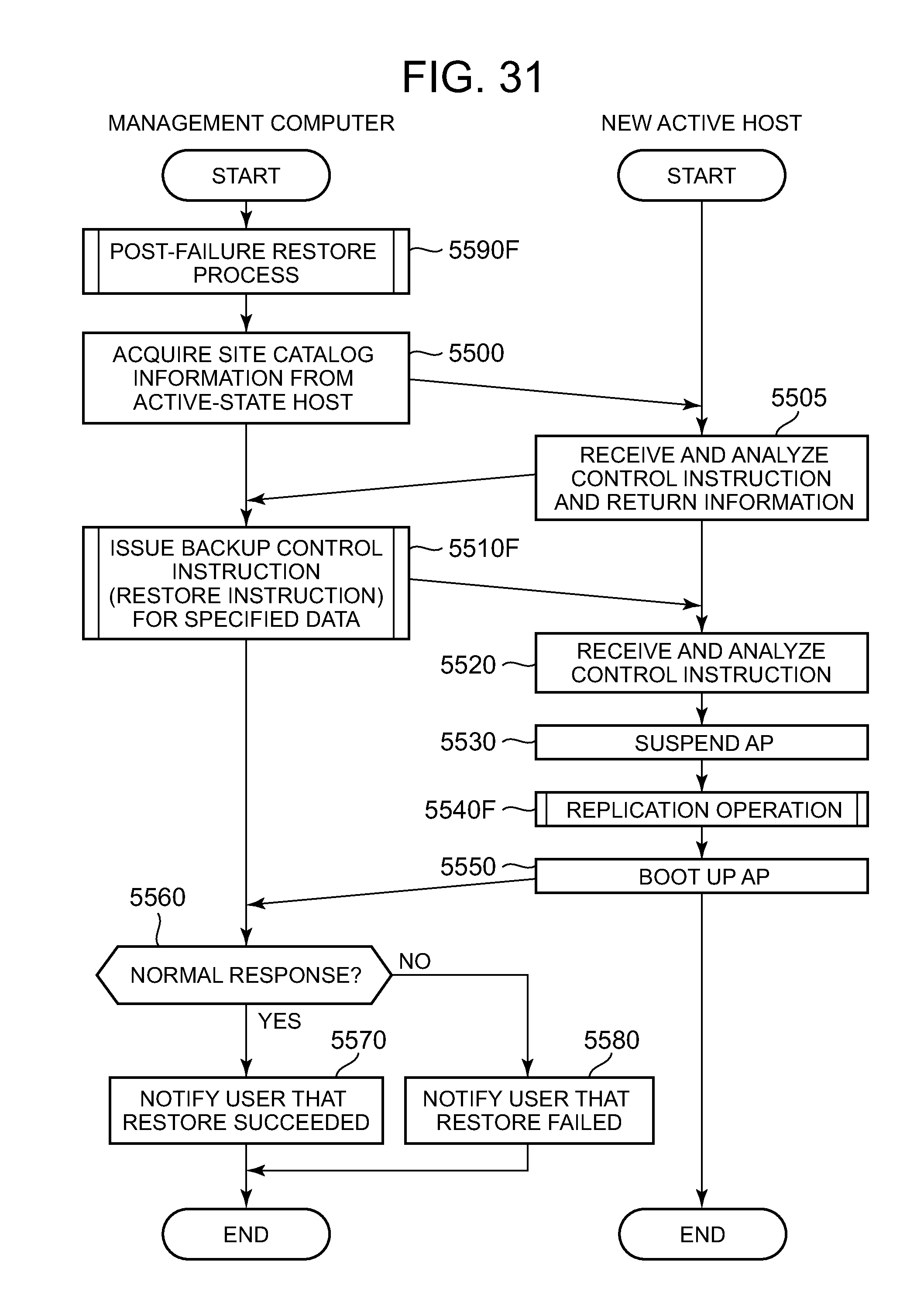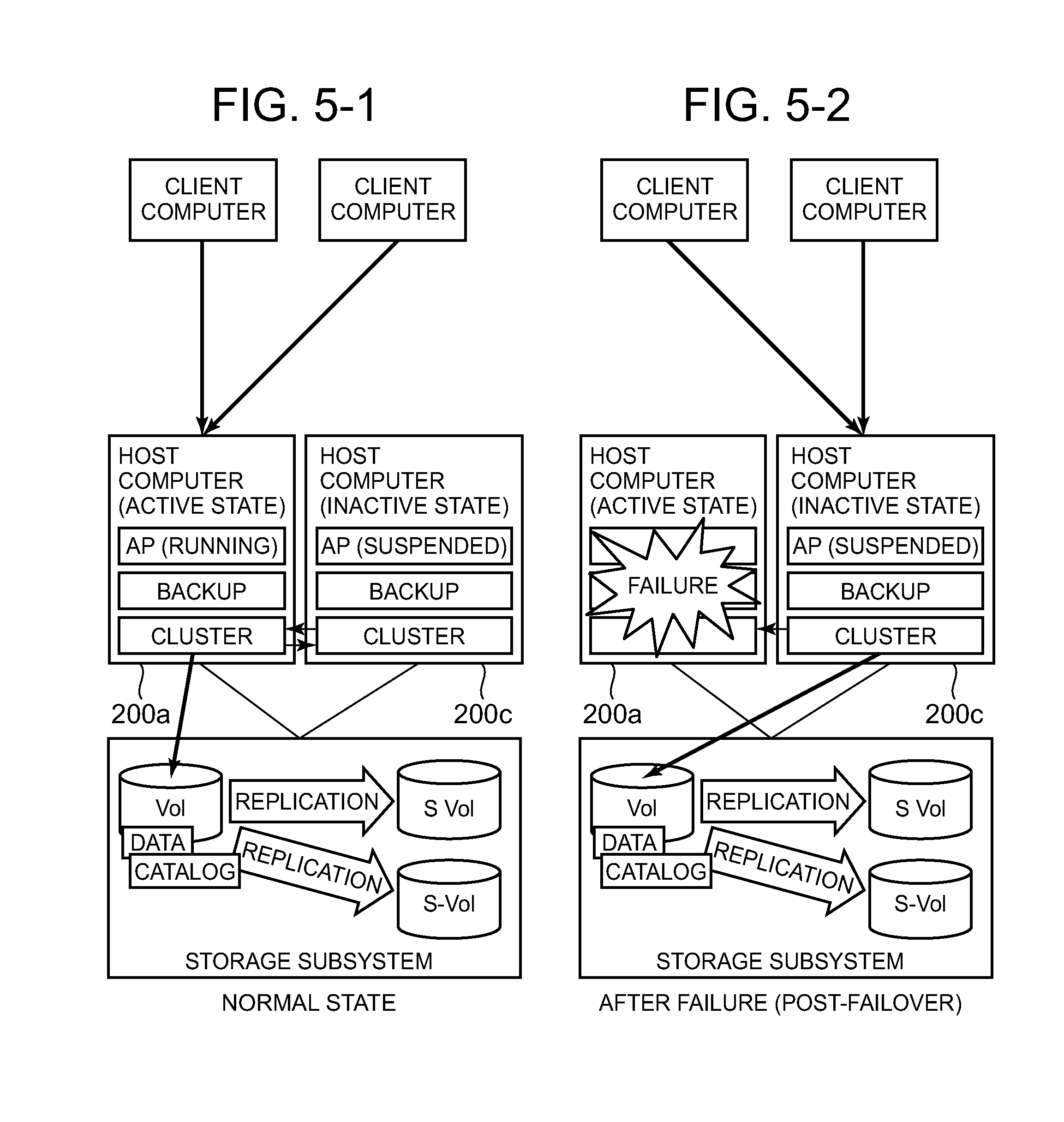 (Step 8040) The secondary storage subsystem 1000 (Step 8050) Next, the primary storage subsystem 1000 Furthermore, the primary storage subsystem 1000 The secondary storage subsystem 1000 (1-8-2) Regular Copy Process by Storage Subsystem When the initial copy process has ended, the primary and secondary storage subsystems 1000 start the operation of a continuation process of the remote copy (hereinafter, called the regular copy). In other words, the primary and secondary storage subsystems 1000 start a regular copy operation after the data of the primary logical volume and the data of the secondary logical volume are identical. Specifically, the primary storage subsystem 1000 The primary storage subsystem 1000 Next, the primary storage subsystem 1000 (Step 8250) Next, the primary storage subsystem 1000 Specifically, the copy-source primary storage subsystem 1000 Next, the primary storage subsystem 1000 Next, the primary storage subsystem 1000 Next, the primary storage subsystem 1000 (Step 8260) Next, the primary storage subsystem 1000 (Step 8270) The secondary storage subsystem 1000 Then, the storage subsystems 1000 end the processing of the regular copy corresponding to the one I/O request. The preceding explanation has explained a management system that manages a plurality of computers and a storage system, which provides a plurality of logical volumes and which is configured from one or more apparatuses, this management system comprising a port for coupling to the above-mentioned plurality of host computers, a memory for storing cluster information, a processor for detecting a failover that has occurred in the above-mentioned plurality of computers and for updating the above-mentioned cluster information, and an input/output device for receiving a backup setting request comprising a virtual host identifier for input use, an application instance identifier for input use, and a backup schedule input value. Furthermore, it was explained that the above-mentioned processor: (A) references the above-mentioned cluster information, thereby specifying an active-state host computer corresponding to the above-mentioned virtual host identifier for input use, and an inactive-state computer corresponding to the above-mentioned active-state host computer included in the above-mentioned plurality of host computers; (B) specifies a first storage subsystem included in the above-mentioned storage system, and a first logical volume provided by the above-mentioned first storage subsystem, which are accessed by the above-mentioned active-state host computer, by executing an application program identified by the above-mentioned application instance identifier for input use; (C) determines whether the above-mentioned inactive-state host computer is able to access the above-mentioned first storage subsystem and the above-mentioned first logical volume; (D) in a case where the above-mentioned inactive-state host computer is not able to access the above-mentioned first logical volume, selects a second storage subsystem included in the above-mentioned storage system that is accessible from the above-mentioned inactive-state host computer, and sends to the above-mentioned first storage subsystem a replication establishment instruction for disaster recovery use that makes the above-mentioned first logical volume a copy source, and makes a second logical volume provided by the above-mentioned second storage subsystem a copy destination; and (E) causes the above-mentioned active-state host computer to control a replication process for backup use, which, in accordance with the above-mentioned backup schedule input value, makes the above-mentioned first logical volume the copy source and makes one or more third logical volumes included in the above-mentioned first storage subsystem the copy destination (s) by sending to the above-mentioned active-state host computer via the above-mentioned port a backup schedule registration instruction comprising backup schedule instruction information created on the basis of the above-mentioned backup schedule input value. Furthermore, it was explained that the above-mentioned processor: (F) may acquire replication process information from the above-mentioned active-state host computer, thereby storing the creation time of backup data created in accordance with the above-mentioned backup schedule input value and the identifier (s) of the above-mentioned one or more third logical volumes that store the above-mentioned backup data in the above-mentioned memory as catalog information for management use; and (G) may reference the above-mentioned catalog information for management use, thereby displaying on the above-mentioned input/output device one or more creation times of the backup data corresponding to the above-mentioned application program specified by the above-mentioned virtual host identifier for input use and the above-mentioned application instance identifier for input use. Further, it was also explained that in a case where the above-mentioned inactive-state host computer becomes the next active-state host computer by taking over the processing of the above-mentioned application program from the above-mentioned active-state host computer in accordance with a failover, the above-mentioned processor: (H) may acquire next information for the control of the backup replication process based on the above-mentioned backup schedule input value, which the above-mentioned next active-state host computer inherited from the above-mentioned active-state host computer; (I) in accordance with this next information, may store in the above-mentioned memory as the above-mentioned catalog information the creation time of the next backup data created under the control of the active-state host computer and the identifier(s) of the one or more third logical volumes that store the above-mentioned backup data; and (J) may reference the above-mentioned catalog information for management use, thereby