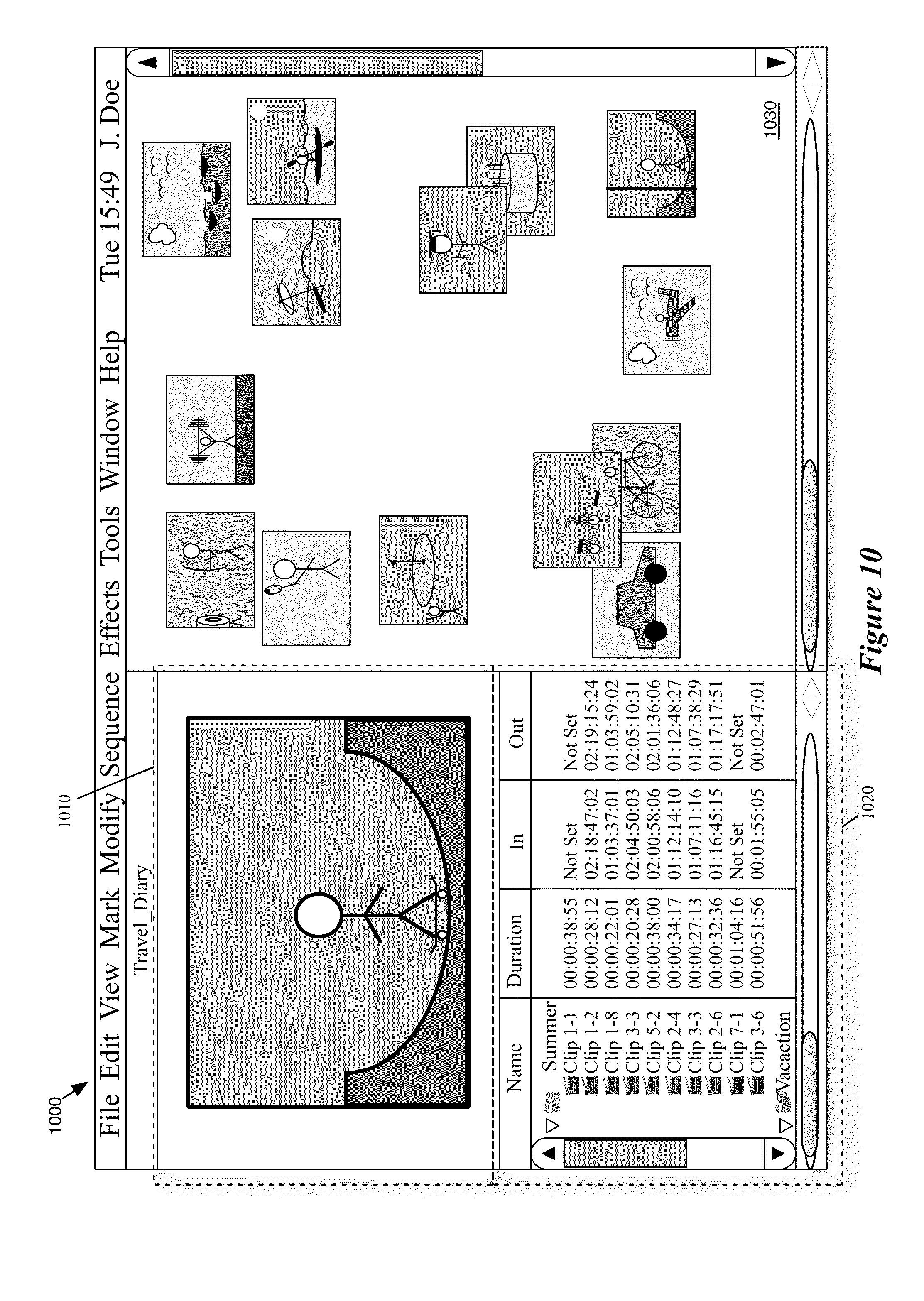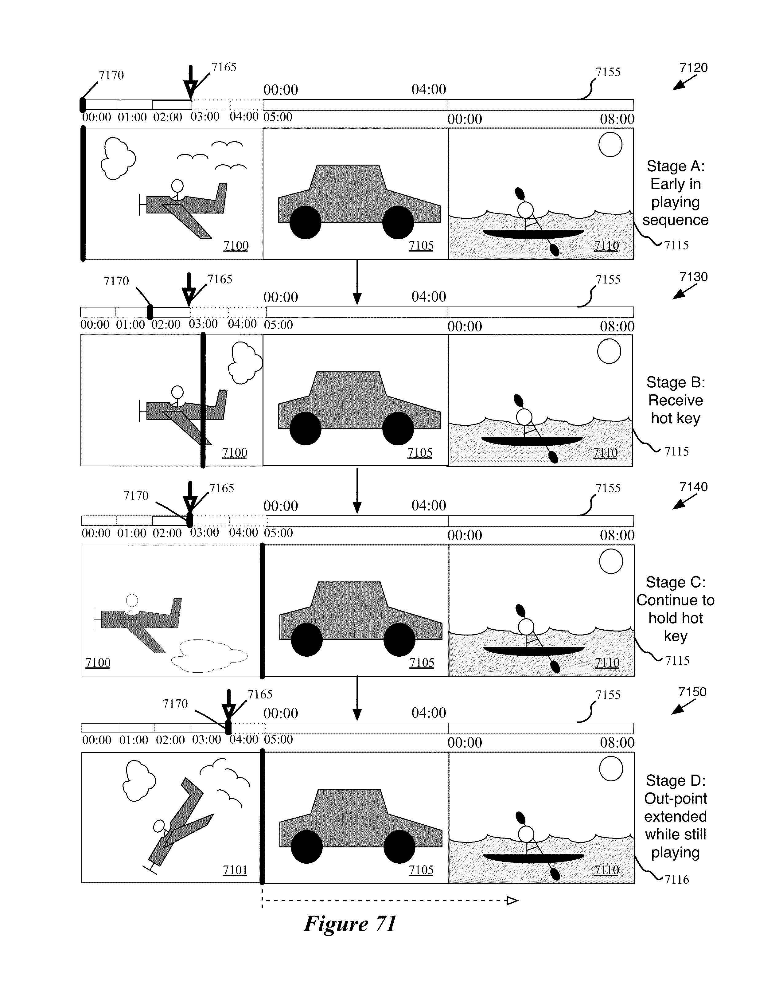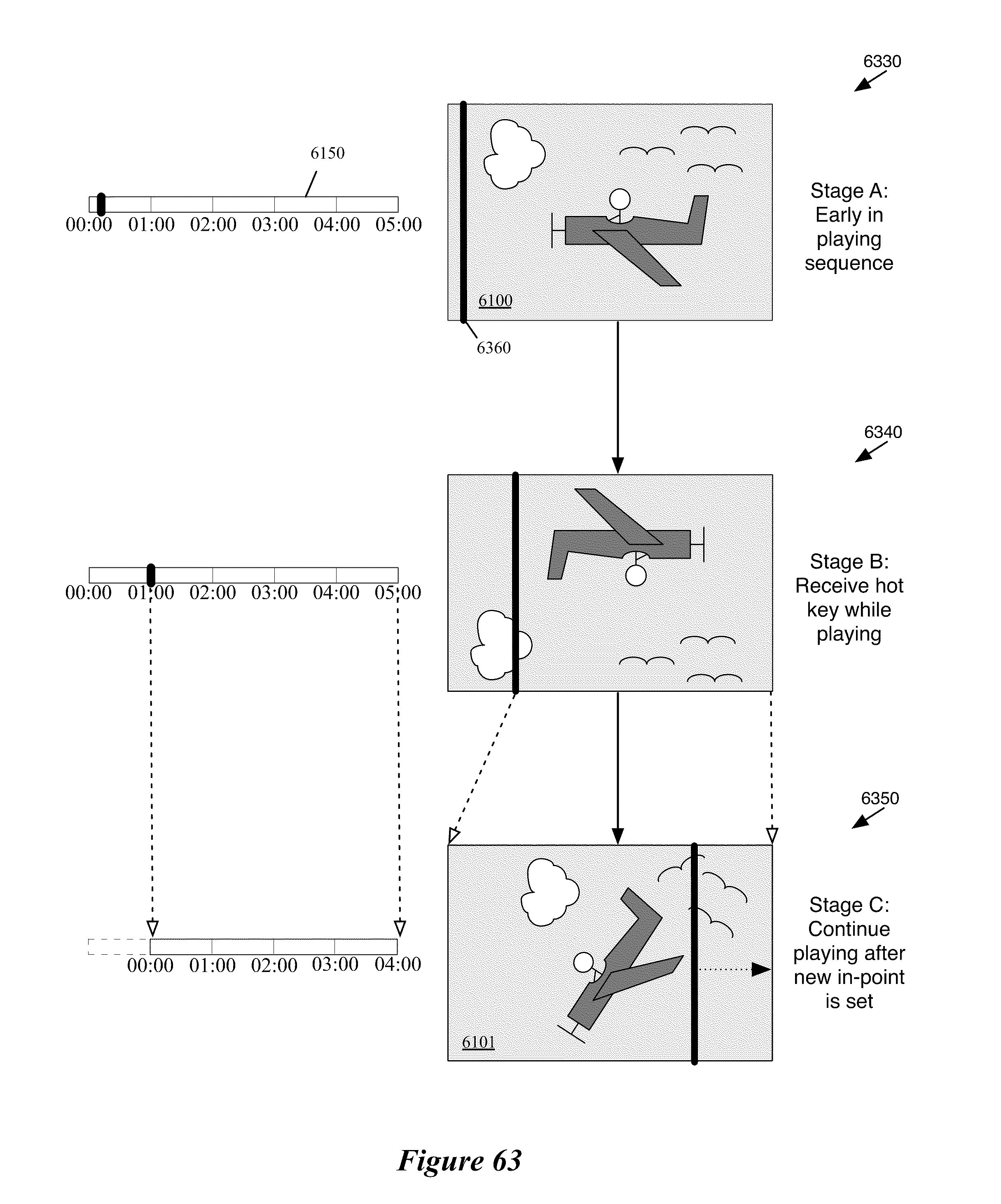 a single contiguous display area for organizing media clips and compositing media clips to create media presentations; and a viewing area for playing back a media clip. 2. The non-transitory computer-readable medium of 3. The non-transitory computer-readable medium of 4. The non-transitory computer-readable medium of 5. The non-transitory computer-readable medium of wherein each of a plurality of media clips is a video clip, wherein a video clip has a thumbnail representation in the contiguous display area, wherein the video clip's content is playable in the video clip's thumbnail. 6. The non-transitory computer-readable medium of 7. The non-transitory computer readable medium of 8. The non-transitory computer-readable medium of 9. The non-transitory computer-readable medium of 10. The non-transitory computer-readable medium of wherein within the display area, each media clip has a graphical representation, wherein the GUI further comprises a set of tools for marking with a visual marker a portion of a first media clip while the first media clip is being played back, wherein the marked portion of the first media clip represents a portion of media content associated with the first media clip. 11. The non-transitory computer-readable medium of 12. The non-transitory computer-readable medium of 13. A method of defining a media-editing application for creating media presentations, said application comprising a graphical user interface (GUI), the method comprising: