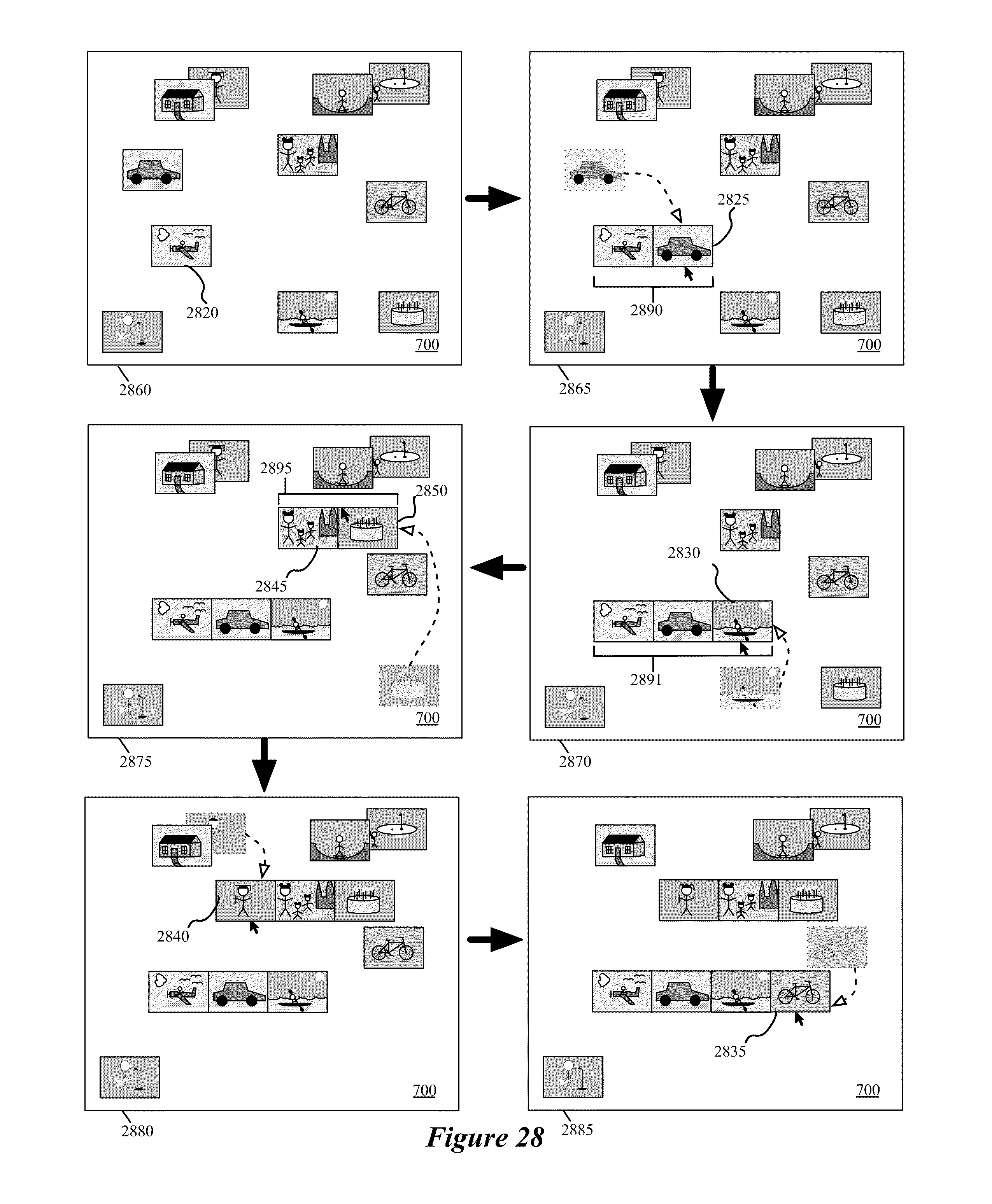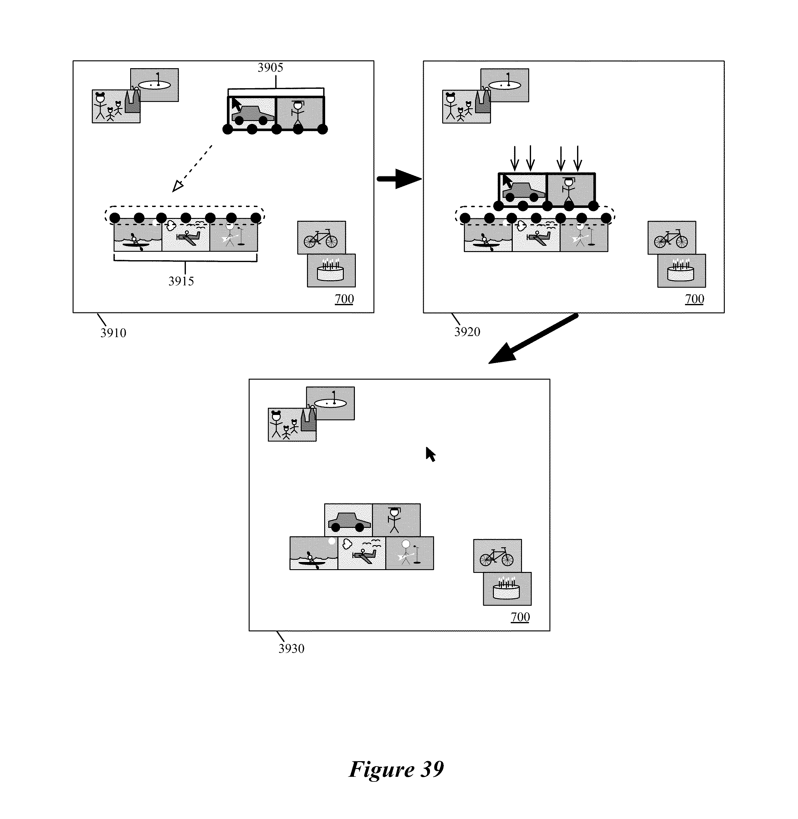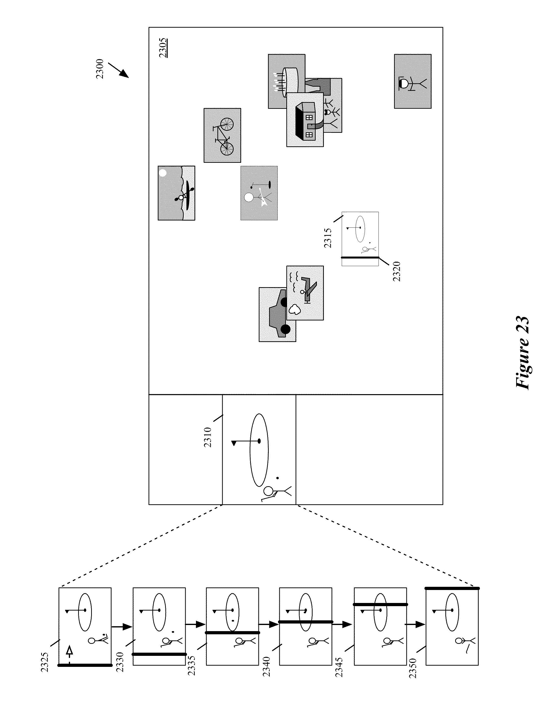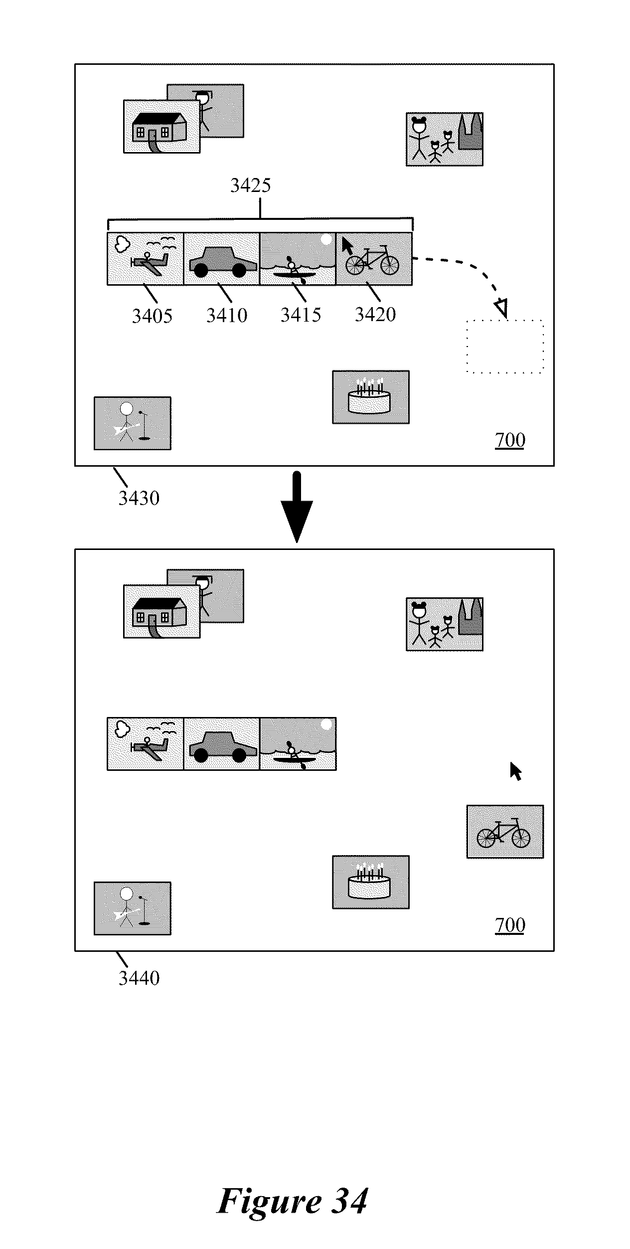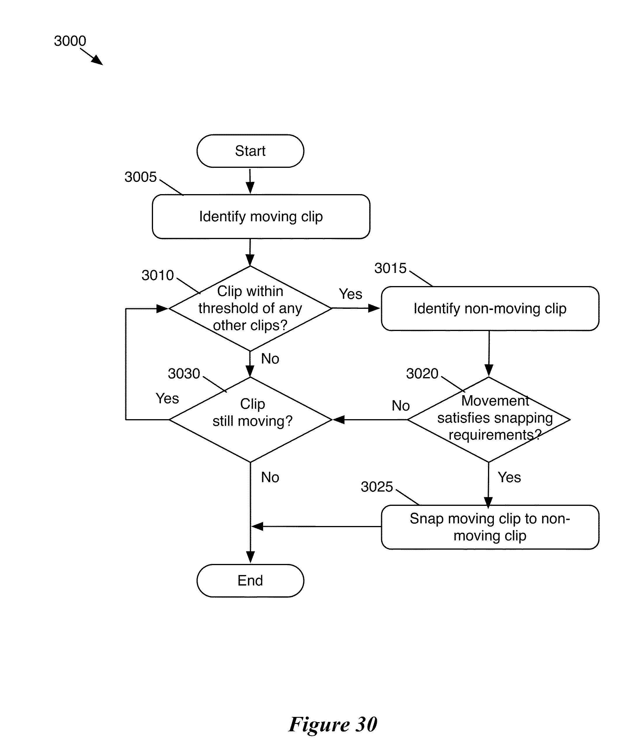 Digital graphic design, image editing, audio editing, and video editing applications (hereafter collectively referred to as media content editing applications or media-editing applications) provide graphical designers, media artists, and other users with the necessary tools to create a variety of media content. Examples of such applications include Final Cut Pro® and iMovie®, both sold by Apple Inc. These applications give users the ability to edit, combine, transition, overlay, and piece together different media content in a variety of manners to create a resulting media project. The resulting media project specifies a particular sequenced composition of any number of text, audio, image, and/or video content elements that is used to create a media presentation. Various media-editing applications facilitate such composition through electronic means. Specifically, a computer or other electronic device with a processor and computer readable storage medium executes the media content editing application. In so doing, the computer generates a graphical interface whereby designers digitally manipulate graphical representations of the media content to produce a desired result. One difficulty in media-editing is that a user cannot easily try out different ideas of compositing media content elements and see the resulting media presentations. For example, to create a media presentation, contents in the form of media clips need to be brought into a media project, which usually has a timeline and multiple tracks. The timeline and multiple tracks necessarily creates positional relationships between the media clips placed in the tracks. Understanding the meaning or effect of placing a media clip on a particular track at a particular position of the timeline requires familiarity and the sophistication associated with the complex applications and tends to overwhelm or discourage untrained users. Moreover, there is a sense of commitment or structure in a timeline that does not encourage experimentation or “playing around.” For a media-editing application that creates composite presentations, some embodiments of the invention provide a novel two-dimensional free-form space (e.g., display area) that allows a user to both visually organize media clips and composite media clips in order to create composite presentations. To visually organize media clips in the free-form space, some embodiments allow the user to add, remove, visually arrange and rearrange, and minimize the media clips. Also, the media clips in the space can be placed at any location within the entire space when the user is visually organizing the media clips. To composite media clips in the free-form space, some embodiments also allow the user to create sequences of media clips, reorder the media clips within sequences, stack sequences, and add or remove media clips from sequences. In some embodiments, the media clips or created sequences of such media clips can be placed at any location within the entire space when the user is organizing and compositing media clips. Some embodiments provide a free-form space that allows the user to place media clips (and sequences of media clips) in regions within the space that overlap each other at the same or different instances in time. In some embodiments, a free-form space does not limit the placement of media clips within the free-form space. That is, the media clips can be placed at any location within the free-form space of such embodiments, as mentioned above. In some embodiments, the free-form space is a trackless space that allows the user to place media clips and sequences of media clips without being constrained by such tracks (e.g., the media clips and sequence of media clips do not have to be aligned along tracks). In other words, the free-from space in some embodiments does not include tracks, such as those included in a typical timeline-based compositing area of a media-editing application that is for compositing media presentations. In typical media editing applications, adjacent tracks are non-overlapping regions in which media clips can be placed without the media clips overlapping each other. As mentioned above, the free-form space of some embodiments media clips and sequences to be placed in regions that overlap at the same or different instances in time. Rather than use tracks, the free-form space of some embodiments is a gridded space that includes gridlines on which the media clips align. Some embodiments define the gridlines of the space as fine as the pixels of a display device displaying the space. In such embodiments, the free-form space is referred to as gridless display area since a media clip placed in any position in the free-form space aligns with the pixel gridlines. Other embodiments, however, define the gridlines of the space more coarse. For the space of some embodiments, the positional relation between two items in the space (e.g., between two clips, between a sequence and a clip, between two sequences) does not necessarily define any relationship between the two items. For instance, because a timeline does not span along this space in some embodiments, the positional relationship between two items in this space does not necessarily define a temporal relationship between them. As another example, in some embodiments, the positional relationship between two items does not necessarily define a logical relationship between the two items. However, for some items in the space, the positional relationship does define a relationship when two items have been somehow associated with each other (e.g., through user action). For example, as described above, a user can create a sequence of media clips (e.g., by concatenate together several media clips). In such a concatenated sequence, these media clips do have a temporal positional relationship with each other. Moreover, when two sequences are concatenated or composited together in this space, the sequences (and the media cl