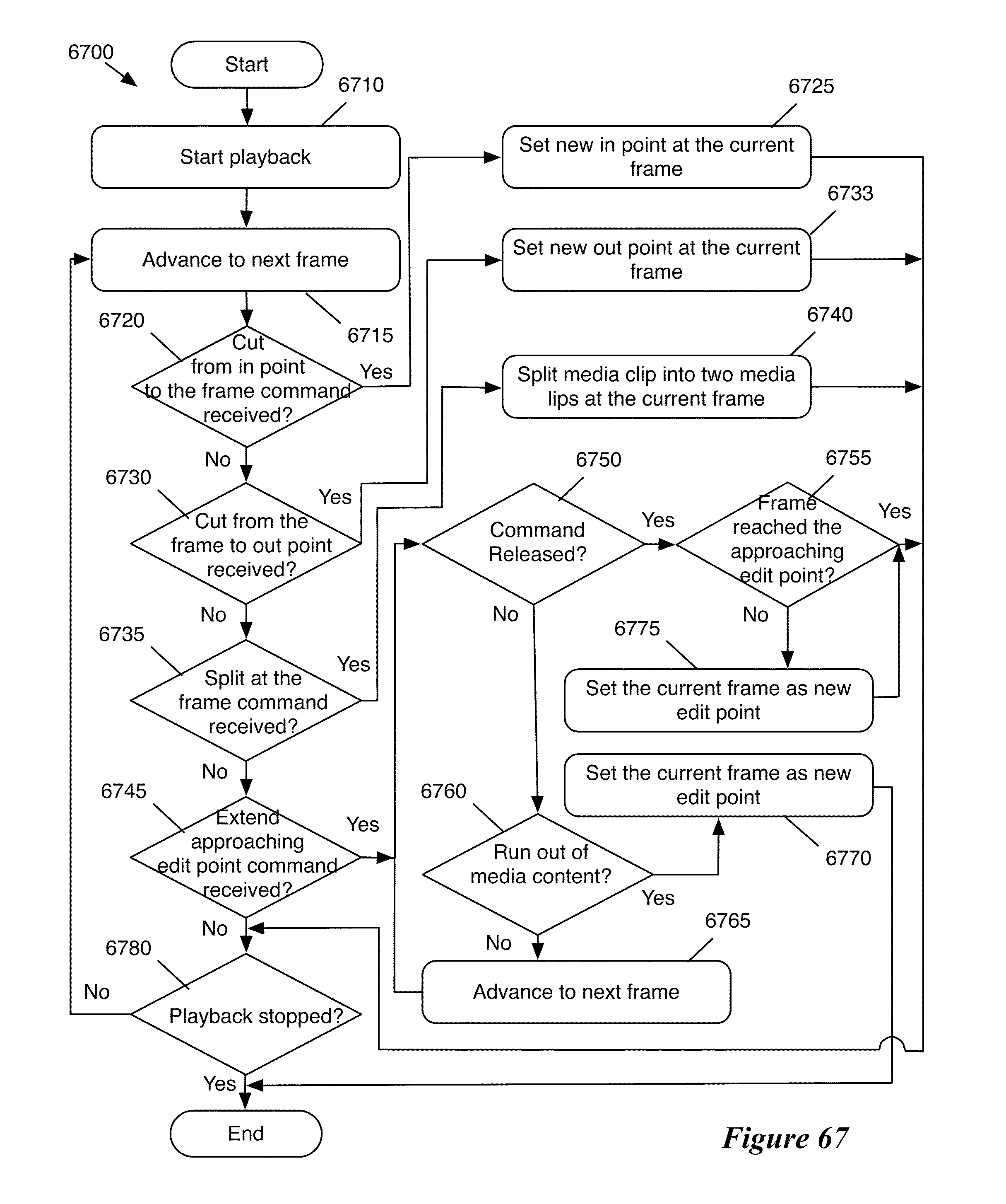 displaying a trackless display area for compositing media clips to form a composite media presentation; and displaying a viewing area for playing back the composite media presentation. 20. The non-transitory computer-readable medium of 21. The non-transitory computer-readable medium of 22. The non-transitory computer-readable medium of 23. The non-transitory computer-readable medium of while a first media clip is being played back, receiving instructions to mark with a selectable visual marker a portion of the first media clip, wherein the marked portion of the first media clip represents a portion of media content associated with the first media clip; receiving selection and movement of the visual marker of the first media clip; in response to the selection and movement of the visual marker, extracting the marked portion from the first media clip to create a second media clip, wherein the second media clip represents media content that is the portion of the media content associated with the first media clip. 24. The non-transitory computer-readable medium of wherein the display area allows more than one set of media clips to be concatenated to form more than one sequence of the media clips that are concurrently displayed in the display area; wherein the media clips within each sequence have a temporal relationship to one another, but two different sequences that do not abut in the display area do not have a temporal relationship with one another.