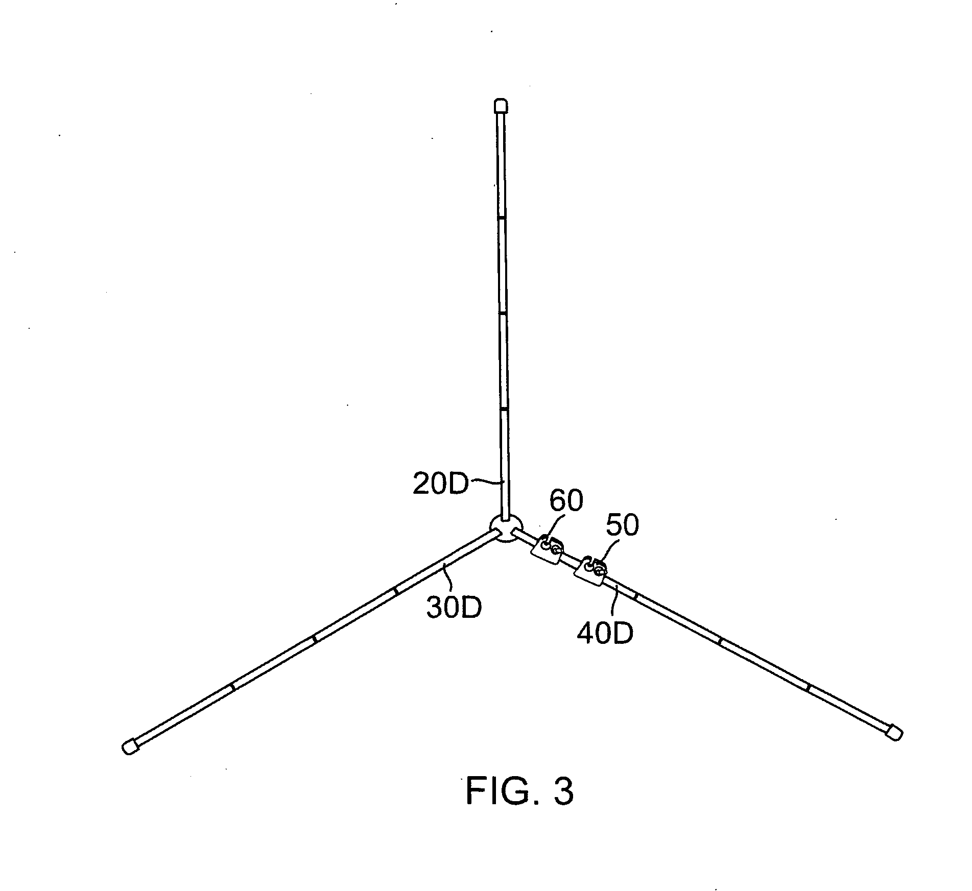 The Kester patent discloses a photographic light stand which embodies the concept of having a tripod grouping of legs which can have at least two components which are held together by a shock cord which is comparable to a bungee cord so that when in the open condition they can immediately open. The device is also used to hold photographic lights. The Kalish patent discloses a portable easel system which includes the concept of having a multiplicity of leg sections which are retained together and then can open and expand to a full leg with an internal elastic cord. Referring to Column 4 Line 51 through Line 60 the patent states: