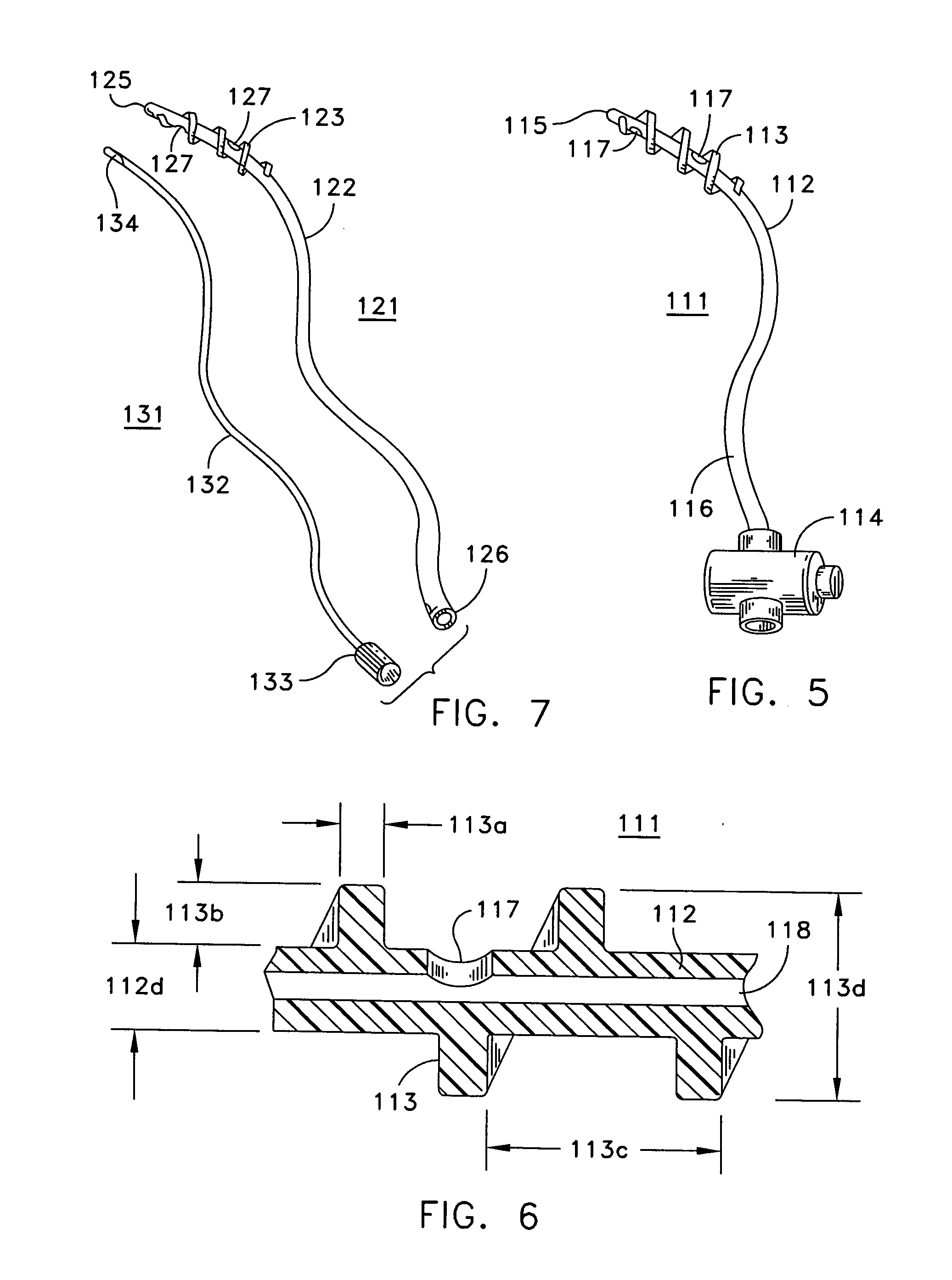 a body having a distal end and a proximal end, a longitudinal axis extending between said distal end and said proximal end, and a lumen extending from said distal end to said proximal end; an external thread disposed over said distal end of said body, said external thread having a sufficient structural integrity, and a sufficient surface profile, such that when said tube is disposed in the wall of a bodily conduit, rotation of said tube about said longitudinal axis will result in longitudinal motion of said tube into said bodily conduit; and a flange disposed on said body proximal to said external thread, said flange being adapted to act as a stop to prevent further movement of said body into the bodily conduit when said flange contacts said wall of the bodily conduit. 11. An access device for accessing a bodily conduit, said conduit fitting comprising: