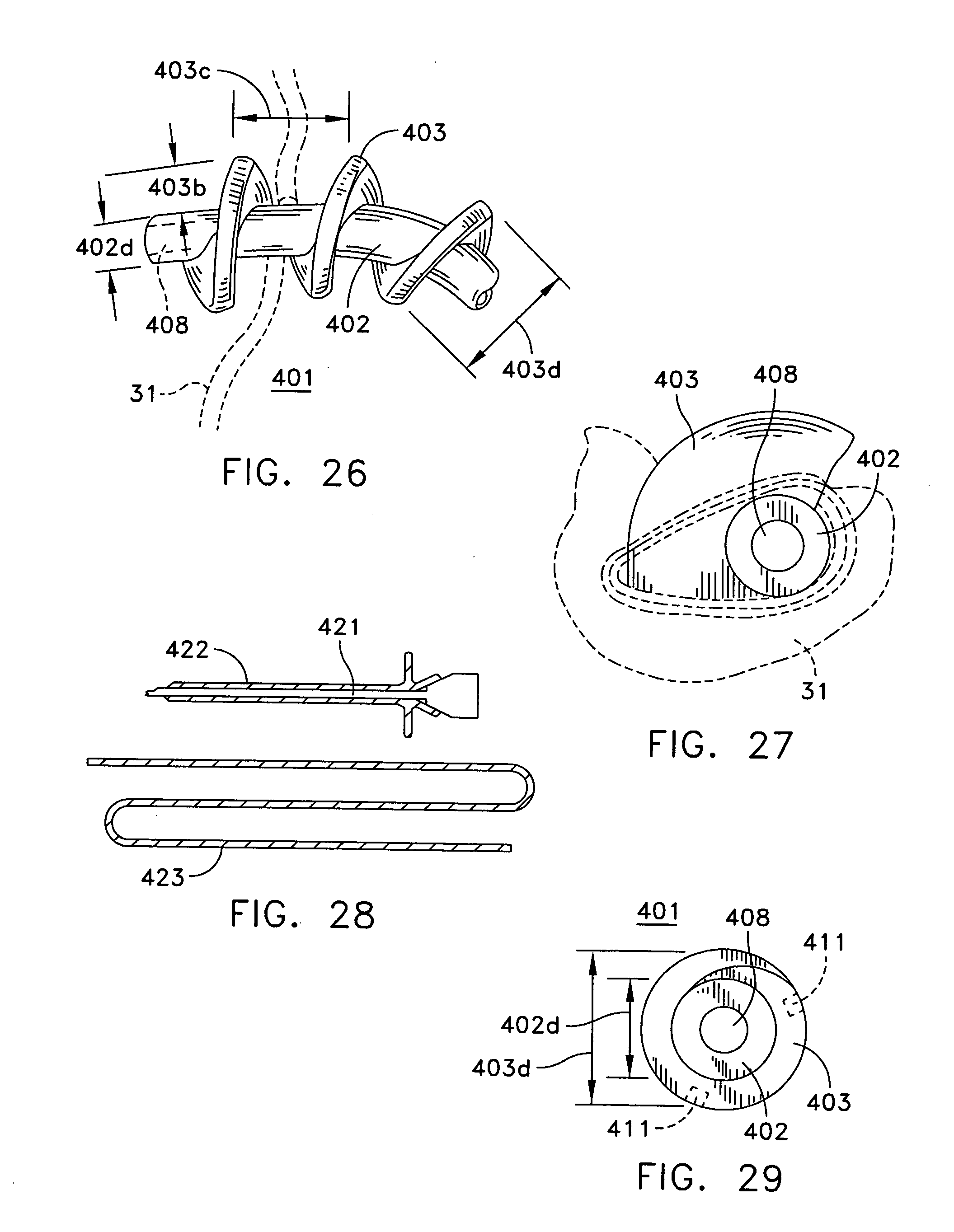 The inner layer of circular muscle is present throughout the colon. The outer longitudinal muscle in the wall of the colon is fined into three bands, the teniae coli. These bands start at the base of the appendix and run in the wall of the colon down to the rectum, where they diffuse into the muscular coat. The three teniae cause the colon to have a triangular appearance endoscopically; this is especially prominent in the ascending and transverse colon. The haustra are outpouchings of the colon, separated by folds. In the descending colon the endoscopic appearance is often tubular. Most experienced colonoscopists use similar endoscopic techniques. Air is introduced to inflate the colon, but as little as possible to prevent overdistension. The pushing pressure on the endoscope is gentle to avoid stretching the colonic wall or mesentery (the connective tissue that holds the colon like a fan) which can cause pain, a vagal episode, or a perforation. The lumen is kept in view at all times; little or none of the examination is performed blindly, because the colonoscopist is pushing a stiff instrument through delicate tissue. A variety of in and out maneuvers are used to “accordian” the colon on the colonoscope, keeping the colonoscope as free of loops as possible. In the difficult colon, special maneuvers such as the creating of an alpha loop in the sigmoid colon are used to pass the sharply angulated sigmoid/descending colon junction. This maneuver may require fluoroscopic guidance and training in the technique. The colonoscope is advanced to the cecum under direct visualization. The detailed examination of the mucosa is usually performed as the colonoscope is slowly removed from the cecum. To inspect the whole length of the large intestine requires a highly skilled practitioner, which makes the procedure costly. Even still, the procedure can be very painful for the patient, making sedation necessary. This is due to the inherent deficiencies in the “push-to-advance” design. In summary, there are problems in making present push-in catheters, dilators, and occluders stiff enough for penetration and flexible enough to make the turns without undue risk of trauma to the wall of the passageway when being pushed in; and once installed, comfortable enough to wear for an extended period of time. The problems with stent encrustation and removal are well known. Self-administration is inhibited by all of the short-comings of the prior art. Further injury, infection and discomfort can result from unskilled or improper technique. The problems with colonoscopy have been previously described. The long history of push-in catheters/dilators and occluders has gradually crystallized into an industry-wide, self-perpetuating, fundamental assumption that catheters are to be mainly pushed through bodily passageways, albeit with some rotational easing. This “fact” is so widely perpetuated and pervasive in the commercially-available products and medical practices as to have stifled original thinking in this art. This, in spite of the well-recorded shortcomings of pain, trauma, risk of rupture, and failed, aborted or incomplete procedures, and the need for skilled practitioners and special equipment for monitoring and safeguarding against the inherent problems. For the purposes of this disclosure, including the appended claims, the terms “distal”, “distally”, and “distal end”, as they relate to the devices and methods described herein, refer to the end of the device further from, or in the direction away from, a practitioner who might be applying the device or method to the subject. Stated otherwise, the aforementioned terms refer to the end of the device closer to, or in the direction towards, the subject's interior. The terms “proximal”, “proximally”, and “proximal end”, as they relate to the devices and methods described herein, refer to the end of the device closer to, or in the direction towards, the practitioner who might be applying the device or method, rather than to the subject. Objects of the invention include providing and employing screw-based means for rotational advancement and anchoring of catheters, probes, occluders, stents, and dilators into genitourinary and gastrointestinal passageways such as the urethra, ureter, esophagus and fallopian tube, and for the emplacement of suprapubic catheters for draining genitourinary organs such as the bladder, whereby the subject device is applied through a natural body orifice or surgically created opening and is drawn through the passage by the longitudinal pull of a helix on the walls of the passage or organ as the device is rotated. This technology is a radical departure from the 4000 year old traditional “push-to-advance” methodology previously discussed. Flexible, thin-wall indwelling and intermittent catheters and related devices and delivery stylets, made possible by this rotate-to-advance form of emplacement, are less traumatic and easier for the medical practitioner or patient to use. The catheter of the invention eliminates the problems of conventional devices by using helix or rotational technology that provides controlled insertion and flexibility to negotiate the urethra. The helix design accomplishes a pre-dilatation of the passageway at a steady rate that relaxes the sphincter and lessens or prevents spasm. Once placed, the device is anchored by the radial displacement and close pitch of the helix, preventing longitudinal migration due to body movement or fluid flow. In another embodiment, the helix is located on the shaft under a Foley-type balloon and disappears when the balloon is inflated. The flexible, reinforced shaft need be only about half the wall thickness of conventional Foley catheters, which means a smaller outer diameter (OD) catheter can be used. The helix advances the shaft and dilates the urethra as the catheter is inserted. Once the bladder is reached, the balloon is inflated with sterile wa