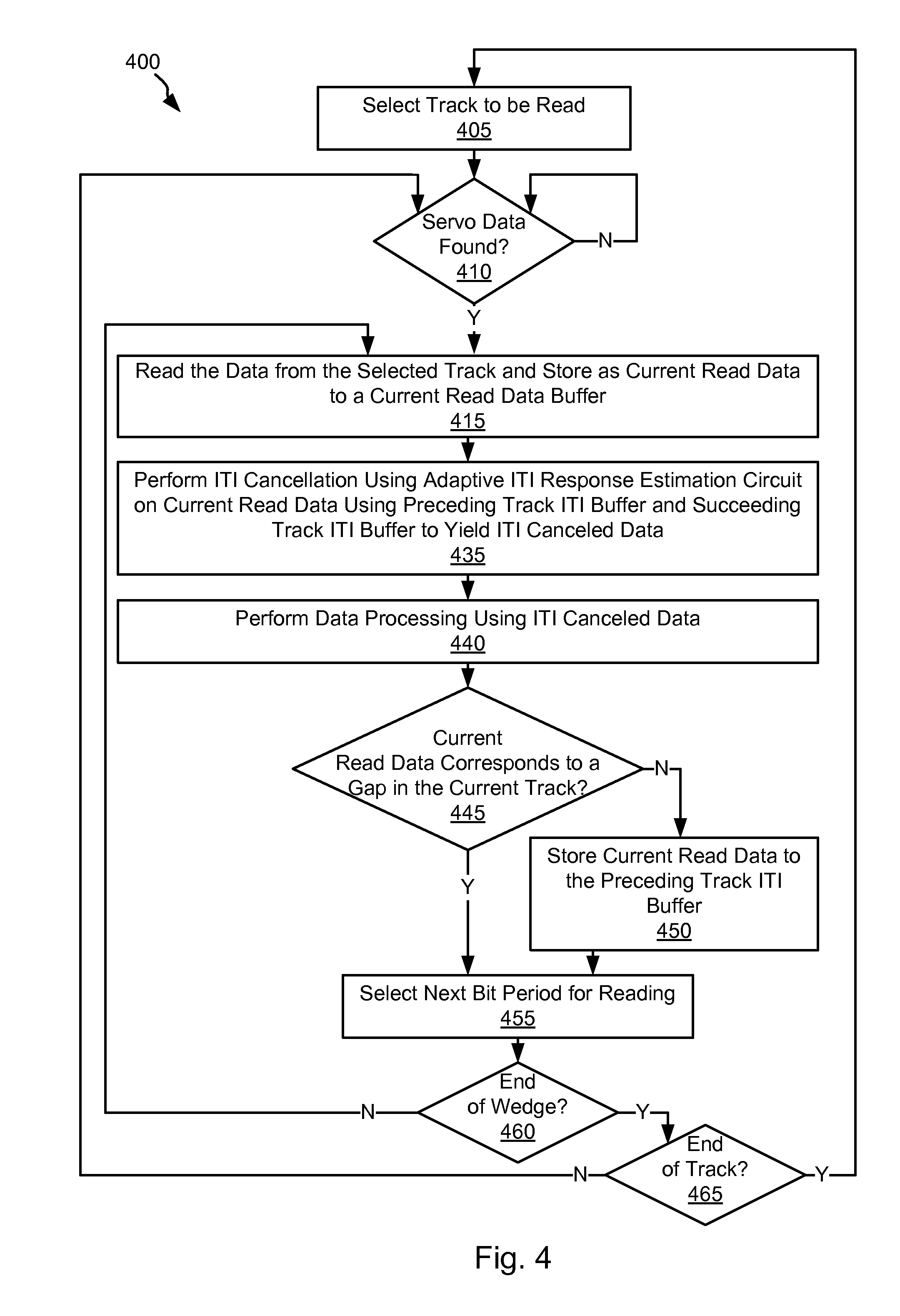The present application claims priority to (is a non-provisional of) U.S. Pat. App. No. 61/453,676, entitled “Systems and Methods for Track to Track Interference Compensation”, and filed Mar. 17, 2011 by Mathew et al.; U.S. Pat. App. No. 61/453,680, entitled “Systems and Methods for Handling Sector Gaps in Inter-track Interference Compensation”, and filed Mar. 17, 2011 by Mathew et al.; U.S. Pat. App. No. 61/382,117, entitled “Estimation and Cancellation of ITI in SMR”, and filed Sep. 10, 2010 by Mathew et al. The entirety of the aforementioned provisional patent application is incorporated herein by reference for all purposes. The present inventions are related to systems and methods for data processing, and more particularly to systems and methods for processing data retrieved from a storage medium. Data storage systems often store data arranged in tracks. Hence, for at least the aforementioned reasons, there exists a need in the art for advanced systems and methods for inter-track interference compensation. The present inventions are related to systems and methods for data processing, and more particularly to systems and methods for processing data retrieved from a storage medium. Various embodiments of the present invention provides data processing circuits that include: a data buffer, an inter-track interference response circuit, and an inter-track interference signal estimator circuit. The data buffer is operable to store a previous track data set. The inter-track interference response circuit is operable to estimate an inter-track interference response from the previous track data set based at least in part on the previous track data set and a current track data set. The inter-track interference signal estimator circuit is operable to calculate an inter-track interference from the previous track data set based at least in part on the previous track data set and the inter-track interference response from the previous track data set. In some instances of the aforementioned embodiments, the circuit further includes an inter-track interference cancellation circuit operable to cancel the inter-track interference from the previous track data set to yield a compensated output. In various cases, the circuit is implemented as part of an integrated circuit. In one or more cases, the circuit is deployed as part of a hard disk drive. In one or more embodiments of the present invention, the inter-track interference response from the previous track data set is estimated using an adaptive feedback approach. In other embodiments, the inter-track interference response from the previous track data set is estimated using a correlation. In one or more instances of the aforementioned embodiments, the data buffer is a first data buffer. In such instances, the circuit further includes a second data buffer operable to store a next track data set. The inter-track interference response circuit is further operable to estimate an inter-track interference response from the next track data set based at least in part on the next track data set and the current track data set, and the inter-track interference signal estimator circuit is further operable to calculate an inter-track interference from the next track data set based at least in part on the next track data set and the inter-track interference response from the next track data set. In one or more cases, the circuit further includes an inter-track interference cancellation circuit operable to cancel both the inter-track interference from the previous track data set and the inter-track interference from the next track data set to yield a compensated output. In particular instances of the aforementioned embodiments, the circuit may be deployed as part of a hard disk drive including a storage medium. In some such cases, the previous track data set is derived from a first track on the storage medium that is adjacent to a second track from which the current track data set is derived, and the next track data set is derived from a third track on the storage medium that is adjacent to the second track. Other embodiments of the present invention provide methods for cancelling inter-track interference. The methods include: receiving a data set derived from a current track on a storage medium; accessing a previous track data set from a storage medium, where the previous track data set was derived from a previous track on the storage medium; calculating an estimated inter-track interference response from the previous track data set based at least in part on the previous track data set and the current track data set; calculating an inter-track interference from the previous track data set based at least in part on the previous track data set and the inter-track interference response from the previous track data set; and cancelling the inter-track interference from the previous track data set to yield a compensated output. In some instances of the aforementioned embodiments, the methods further include: accessing a next track data set from a storage medium, where the next track data set was derived from a next track on the storage medium; calculating an estimated inter-track interference response from the next track data set based at least in part on the next track data set and the current track data set; calculating an inter-track interference from the next track data set based at least in part on the next track data set and the inter-track interference response from the next track data set; and cancelling the inter-track interference from the next track data set to yield the compensated output. Yet other embodiments of the present invention provide storage devices that include: a storage medium, a read/write head assembly disposed in relation to the storage medium, and a read channel circuit. The read channel circuit is operable to receive an information set from the storage medium via the read/write head assembly, and includes: a front end circuit, a da