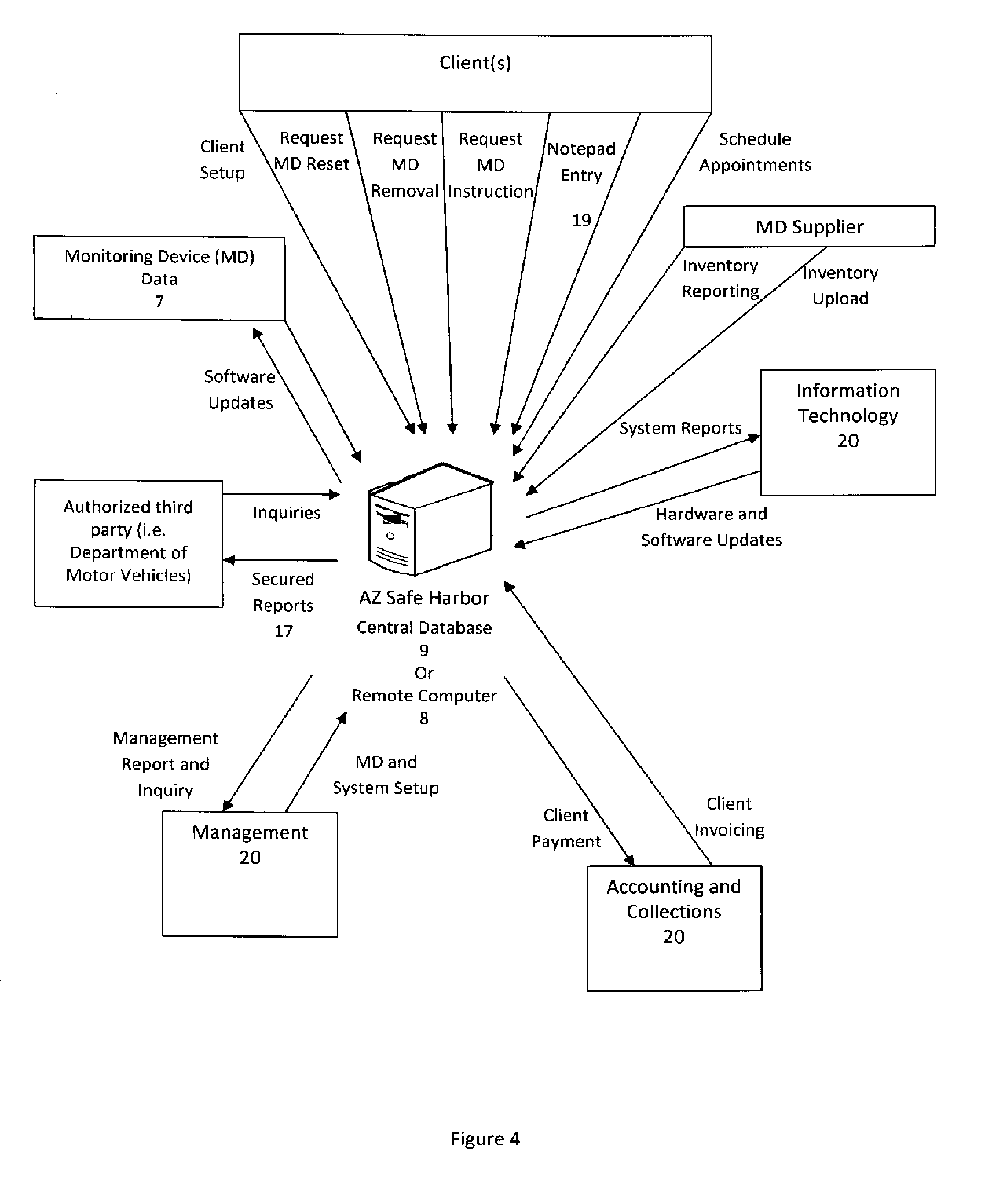 This application is a continuation in part of U.S. patent application Ser. No. 12/390,995 titled Methods for Providing Secure and Transparent Cached Ignition Interlock Data” filed Feb. 23, 2009 and incorporates the disclosure of such application by reference. Vehicle operation by persons under the influence of alcohol is a well known safety hazard in the United States and throughout the world. Thousands of deaths per year in the United States are attributable to drivers operating vehicles under the influence of alcohol. To address this problem, the state of Arizona, like most states, has established laws that criminalize operation of a vehicle and other machinery with a blood alcohol concentration (“BAC”) greater than a preset value (e.g., 0.08% BAC). Once a person has received a citation for driving under the influence of alcohol, and depending on the outcome of their court case, they may be required to submit to test via a monitoring device to prove that they are not drinking. These tests may be required to be performed in the home, the car, and even randomly during the day. The monitoring devices come in many forms and are commercially available from a number of companies. One such monitoring device is commonly known as the breath alcohol ignition interlock devices (“BIID” or “IID”) and/or systems. These IIDs have been developed to be directly connected to a vehicle's ignition system and are designed to prevent automobiles and other machinery from being operated by inebriated individuals. To reduce the rate of recidivism of driving under the influence, the state of Arizona and other states require the installation of an IID in the vehicle and other machinery of individuals convicted of driving under the influence of alcohol. IIDs may comprise semiconductor sensors, commonly referred to as a Taguchi cell, infrared absorption sensing systems, and/or fuel cells to sense and quantify the amount of alcohol in a driver's breath. Most modern IIDs use an ethanol-specific fuel cell for a sensor. See U.S. Pat. No. 4,487,055, U.S. Pat. No. 6,026,674, U.S. Pat. No. 6,167,746, and/or U.S. Pat. No. 7,204,335. A fuel cell sensor is an electrochemical device in which alcohol undergoes a chemical oxidation reaction at a catalytic electrode surface (platinum) to generate an electric current. This current is then measured and converted to an alcohol equivalent reading. Although fuel cell technology is not as accurate or reliable as infrared spectroscopy technology used in evidentiary breathalyzers, they are less expensive and specifically tailored to quantify ethyl alcohol (drinking alcohol). Among manufacturers of IIDs are Smart Start Inc., LifeSafer Interlock, SOS, Ignition Interlock Systems, Intoxalock and Monitech. A list of federally-approved IID devices is maintained by the National Highway Traffic Safety Administration (“NHTSA”) in its NHTSA Conforming Products List. Typically, in order to start a vehicle equipped with an HD, the driver must first blow into the breath analyzer installed in the vehicle or machinery. Conventional IIDs measure the alcohol content of the breath and calculate BAC readings on the alcohol content of gas present in the alveoli of the lungs by approximating, through the use of software algorithms, the alcohol content in the bloodstream. If the driver's BAC exceeds a preset limit, the vehicle's ignition is disabled and the vehicle is rendered inoperable. If the driver's BAC is below the preset limit, ignition is permitted and the vehicle may be started. Exemplary ignition interlock devices that utilize breath analyzers are described in, for example, U.S. Pat. Nos. 3,780,311, 3,824,537, 3,831,707, 4,592,443, and 4,697,666. Unfortunately, individuals required to use IIDs have become increasingly sophisticated in attempting to trick the device to register false negatives and, in turn, to allow them to drive intoxicated. For example, individuals have been known to have a sober passenger blow into the device and/or use bogus gas samples from balloons or bicycle pumps. Accordingly, the IIDs have become increasingly sophisticated in ensuring that the person providing a breath sample is the person operating the vehicle or machinery. Routinely, IIDs will require a negative pressure (sucking), a positive pressure (blowing), a series of blowing and/or sucking by the operator, and/or retesting while operating the equipment or vehicle. Another deterrent is the Random Rolling Retest. These are random times when the operator is required to provide additional breath samples. This prevents Drinking while driving. Another reason for this is to ensure that an individual cannot have another person provide the first sample to get the car started and then drive home without that person. Most Manufactures set them from within the first 5 to 15 minutes then every 30 to 60 minutes. Similarly, some of the more onerous IIDs require secondary testing and verification of identity by the operator. For example, along with a breath sample analysis, U.S. Pat. No. 4,158,198 discloses an IID, which incorporates an evaluation of the actual driving by way of a “steady control task” for a designated period of time; U.S. Pat. No. 4,645,939 discloses an IID, which incorporates an evaluation of reflexes using a sequence of time intervals; U.S. Pat. No. 4,723,625 discloses an IID, which incorporates an evaluation of reflexes using a series of test buttons; U.S. Pat. No. 4,738,333 discloses an IID, which incorporates an evaluation of physical tasks, to confirm identity of the driver; and U.S. Pat. No. 6,748,792 and/or United States Patent Publication No. 20070144812 discloses IIDs, which incorporate video cameras to photograph the person giving a breath sample. While the internal hardware and the function of these monitoring devices are well known in the art, the software used to run, maintain, and report BAC results to the courts and government agencies is not well known. This is due to the f