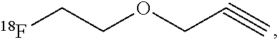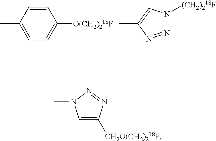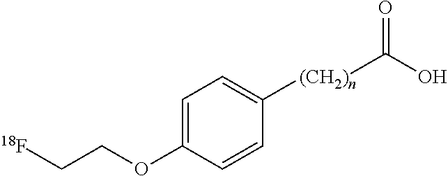 subjecting image data to analysis by an algorithm in a digital computer. 60. A method in accordance with any one of aspects 57-59, further comprising displaying fatty acid triglyceride distribution on a computer display. and Reagents: a: trimethylsilyl diazomethane, T-F, hexane, 2 hr; b: 4-benzyl oxyphenylboronic acid, Pd(OAc)2, [HP(t-Bu)2Me]BF4, KOt-Bu, t-amyl alcohol, argon, RT, 24 hr; c: Pd/c, EtOAc, H2, 6 psi, 5 hr; d: 1-bromo-2-fluoroethane, K2CO3, acetone; e: NaOH, MeOH, CHCl2, water; f: ethane-1,2-diyl bis(4-methylbenzenesulfonate), K2CO3, CH3CN reflux 3 hr; g: [18F]KF/K2.2.2/K2CO3/CH3CN, then NaOH. Myocardial fatty acid (FA) oxidation is believed to be among the heart's most important energy sources. However, the proportional contribution of other substrates to overall oxidative metabolism such as glucose and lactate are both significant and quite variable and dependent upon numerous factors such as the plasma substrate environment, neurohumoral milieu and level of cardiac work. Thus, plasticity in myocardial substrate use can be key to cardiac health. Loss of plasticity resulting in near exclusive use of one substrate has been shown to have a role in the development of ventricular dysfunction in a variety of cardiac disease processes. Myocardial FA metabolism is believed to be dependent on the plasma delivery of FA, either in the form of FA bound to albumin (FA-ALB) or in triglyceride (FA-TG) (either in the form of chlyomicrons (FA-CM) or very low density lipoproteins (FA-VLDL)) with subsequent release of the FA via lipoprotein lipase (LPL) located on capillary endothelial. Furthermore, given the potential adverse effects of either accelerated fatty acid oxidation or excessive lipid accumulation, the present inventors have seen a need for PET radiotracers that can track FA arising from FA-TG. In some embodiments, the inventors disclose18F-FAA with kinetics similar to those of unlabeled palmitate, and furthermore disclose18F-FAA incorporated into the 1-position of a triglyceride. The present inventors have developed imaging approaches that, in some embodiments, further extend our capability to better delineate the etiologies and ramifications of altered myocardial FA metabolism in cardiac disease. The inventors have developed radiotracers the permit assessment of multiple aspects of myocardial FA metabolism. For example, the present inventors have realized that there is no non-invasive method currently available to measure the contribution of FA from TG. They therefore have developed, in some embodiments, radiolabeled VLDL in the R1 position with an18F-FAA (18F-FAA-VLDL). They further disclose its use in cardiac imaging and kinetic characteristics in a rat model system with and without abnormalities in myocardial FA metabolism. They furthermore disclose using the compounds to measure the production of radiolabeled metabolites in blood and myocardial tissue, and determine their whole-body biodistribution. The inventors accordingly disclose radiolabeled tracers that are fatty acid analogs comprising a positron emitter such as18F, or radiolabeled very low density lipoprotein triglycerides (VLDL) comprising a positron emitter such as18F. Some aspects of the present teachings involve replacing the iodo-group of IPPA with a 2-fluoroethoxy group. In some configurations, a 2-fluoroethoxy substitution can also represent an isosteric substitution for the iodo group in p-IPPA. Strategies used for synthesizing some 2-fluoroethoxy analogs of IPPA ( can be synthesized in high radiochemical yield (approx. 85%) from the corresponding tosyl precursor. The methods described herein utilize laboratory techniques well known to skilled artisans, and guidance can be found in laboratory manuals and textbooks such as Sambrook, J., et al., Molecular Cloning: A Laboratory Manual, 3rd ed. Cold Spring Harbor Laboratory Press, Cold Spring Harbor, N.Y., 2001; Spector, D. L. et al., Cells: A Laboratory Manual, Cold Spring Harbor Laboratory Press, Cold Spring Harbor, N.Y., 1998; and Harlow, E., Using Antibodies: A Laboratory Manual, Cold Spring Harbor Laboratory Press, Cold Spring Harbor, N.Y., 1999; Hedrickson et al., Organic Chemistry 3rd edition, McGraw Hill, New York, 1970; Carruthers, W., and Coldham, I., Modern Methods of Organic Synthesis (4th Edition), Cambridge University Press, Cambridge, U.K., 2004; Curati, W. L., Imaging in Oncology, Cambridge University Press, Cambridge, U.K., 1998; Welch, M. J., and Redvanly, C. S., eds. Handbook of Radiopharmaceuticals: Radiochemistry and Applications, J. Wiley New York, 2003. In the experiments described herein, all reagents were purchased from commercial suppliers and used without further purification unless otherwise stated. All reactions can be carried out under standard conditions well known to skilled artisans, such as standard air-free and moisture-free techniques under an inert argon atmosphere with dry solvents. In various embodiments of the present teachings, methods of synthesizing18F-labeled fatty acids based on IPPA can include provided in In other embodiments, two “click” analogs can be synthesized as outlined in Synthesis and Packaging of Radiolabeled Triglycerides. Certain embodiments include radiolabeled TG that can be incorporated into VLDL-TG. These embodiments can involve incorporating an18F-FAA described above into the 1-position of a triglyceride. Examples of structures of the target TG are shown in The present teachings include embodiments in which FAA-triglyceride analogs such as 1,2-pal-[18F]5,1,2-pal-[18F]9 and 1,2-pal-[18F]10 can be synthesized and evaluated as the enantiomeric mixtures, because the 2-position of the TG in some configurations can be a chiral center. Hence, in some configurations, a racemic mixture can be separated into (+)- and (−)-isomers using standard methods known to skilled artisans such as chiral HPLC. Unless results are presented in the past tense, the presentation of experiments does not imply that any prot