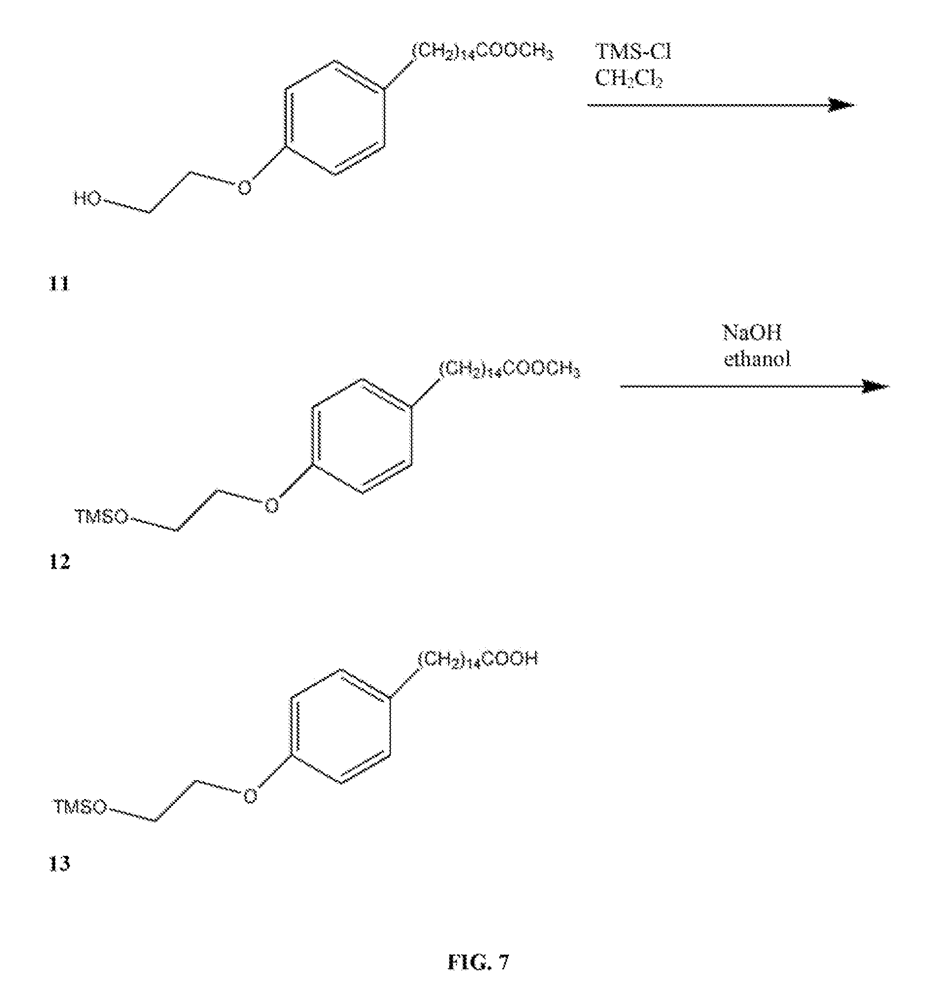 contacting Br—(CH2)14—COOH 1 with trimethyllsilyl diazomethane and THF to yield Br—(CH2)n—COOCH32; contacting the Br—(CH2)n—COOCH32 with 4-benzyloxyphenylboronic acid, Pd(OAc)2, [HP(t-Bu)2Me]BF4, KOt-Bu and t-amyl alcohol to yield and contacting the with Pd/c, EtOAc, H2to yield contacting the with 1-bromo-2-fluoroethane, K2CO3, acetone; followed by NaOH, MeOH, CHCl2, water, to yield 42. A method of synthesizing comprising: contacting Br—(CH2)n—COOH 1 with to form 7;
