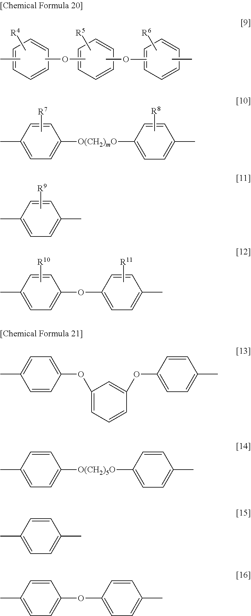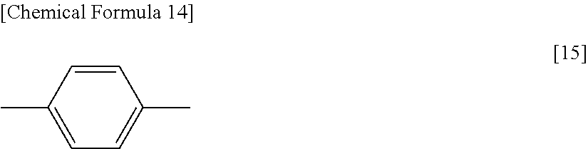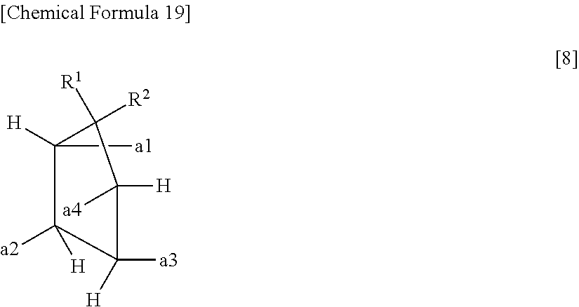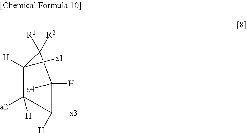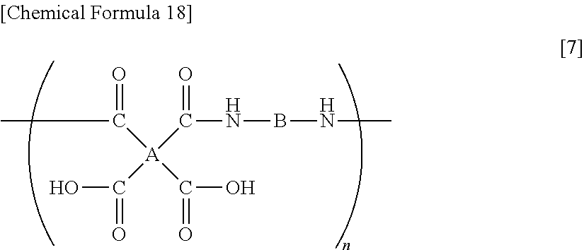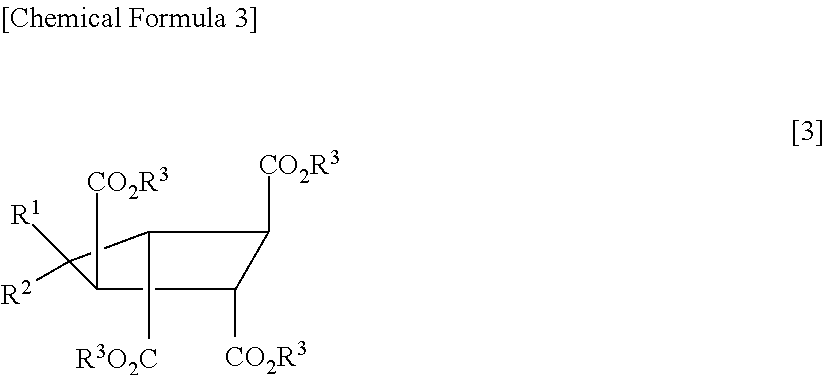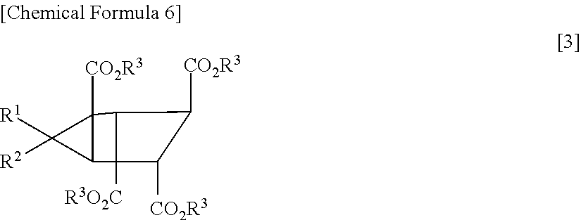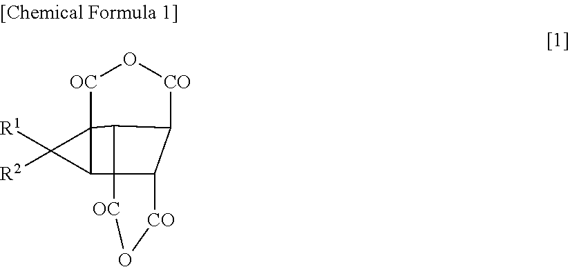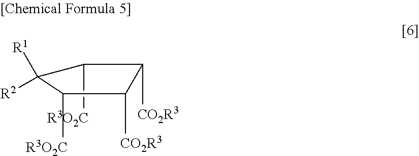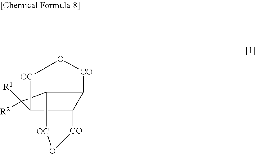 (where R1and R2independently denote a hydrogen atom, halogen atom, or C1-10alkyl group; and a1 to a4 denote the positions for bonding with the carbon atom of the carbonyl group in the formula [7], provided that bonding with the carboxyl group does not take place simultaneously at a1 and a3 and bonding with the carboxyl group does not take place simultaneously at a2 and a4.)