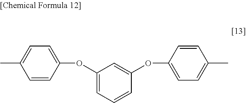 16. The polyamic acid as defined in claim 13 or 14, wherein said B is at least one species selected from the divalent organic groups represented by the formulas [9] to [12].