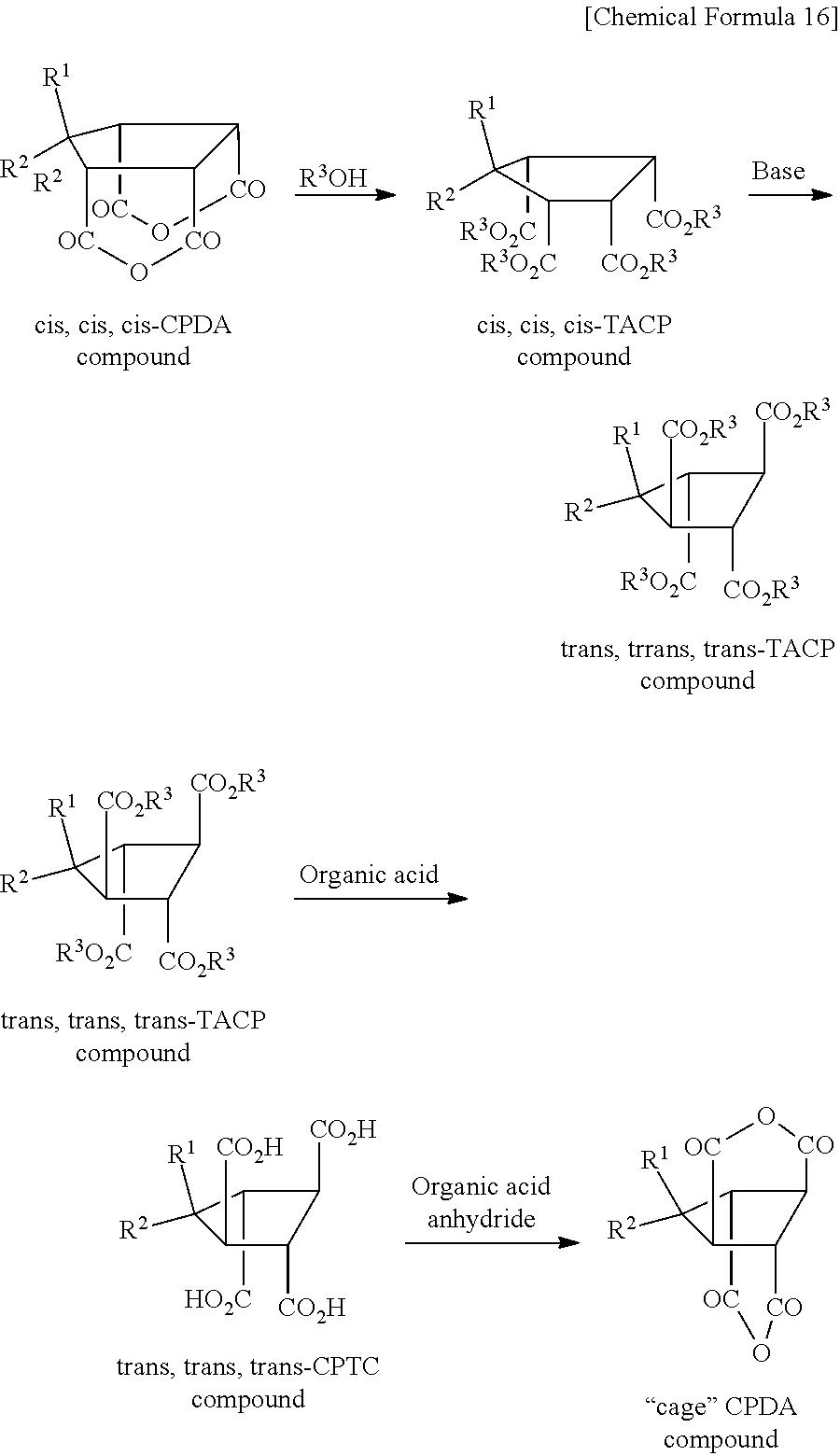 a fourth step of dehydrating the compound represented by the formula [2] above, which was obtained in the third step, thereby giving a cage-shaped 1,2,3,4-cyclopentanetetracarboxylic acid-1,3:2,4-dianhydride represented by the formula [1].