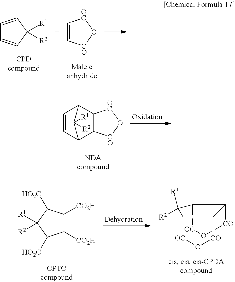 a first step of reacting cis,cis,cis-1,2,3,4-cyclopentanetetracarboxylic acid-1,2:3,4-dianhydride represented by the formula [4].