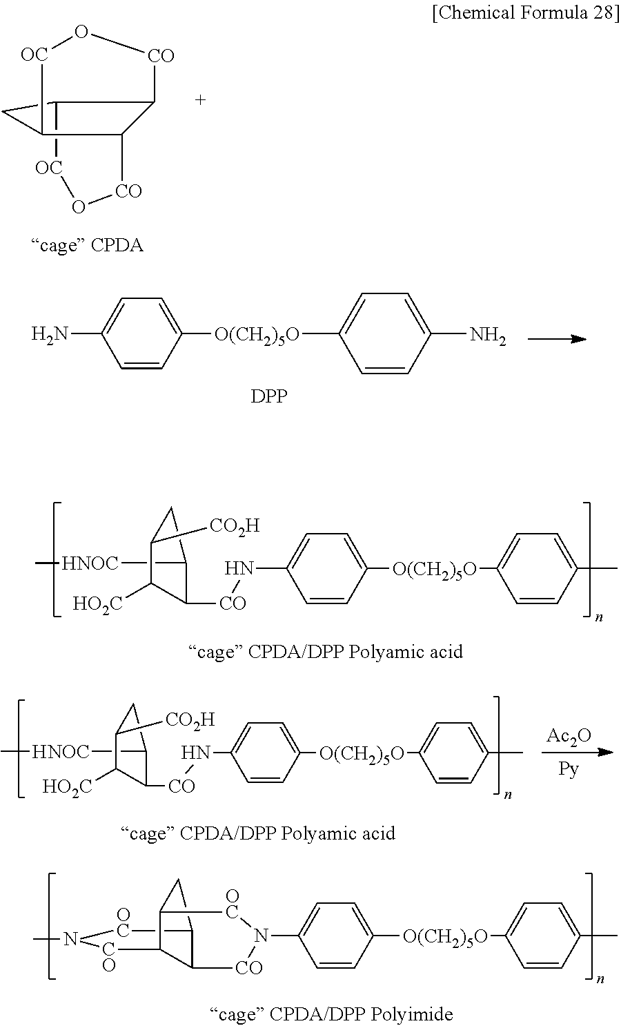 It is noted from Table 1 that the sample of “cage” CPDA-1,3-BAPB polyimide obtained in Examples 5 and 6 are more soluble in organic solvents than the sample of CPDA-1,3-BAPB polyimide despite their higher number-average molecular weight (Mn) and weight-average molecular weight (Mw).