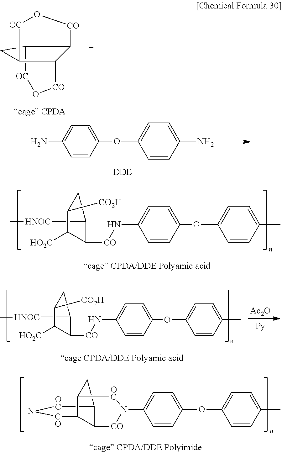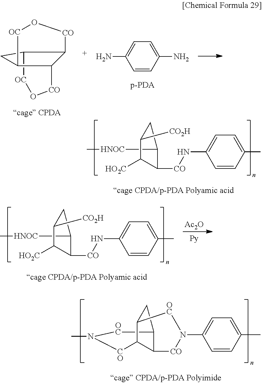 There were placed 1.00 g (5.00 mmol) of 4,4′-diaminodiphenyl ether (DDE) and 8.3 g of NMP in a 50-mL four-neck flask (equipped with a stirrer) immersed in a water bath at 20° C. The reactant was dissolved by stirring at 185 rpm. With stirring continued, the solution was given 1.05 g (5.00 mmol) of “cage” CPDA in small portions. Stirring was continued at 20 to 17° C., for 15 hours. The solution turned into a syrupy viscous solution which wound around the stirrer shaft. After stirring at 50° C. for 2 hours with additional NMP (36.8 g), there was obtained a polyamic acid solution with a solid content of 6 wt %. This solution was found to have a viscosity of 119 mPa·s. The results of GPC analysis indicate that the polyamic acid has a number-average molecular weight (Mn) of 50,129 and a weight-average molecular weight (Mw) of 241,300, with Mw/Mn being 4.81.
