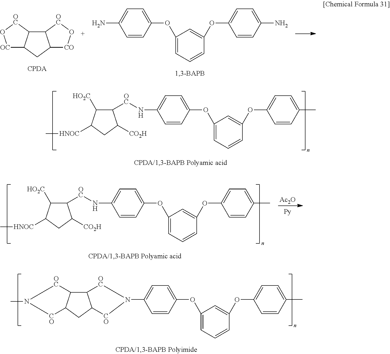 There were placed 2.79 g (10.00 mmol) of 1,3-BAPB and 19.6 g of NMP in a 50-mL four-neck flask (equipped with a stirrer) immersed in a water bath at 25° C., so that 1,3-BAPB was dissolved in NMP. With stirring continued, the solution was given 2.10 g (10 mmol) of 1,2,3,4-cyclopentanetetra-carboxylic acid-1,2:3,4-dianhydride (CPDA) in small portions. The solution was stirred at 25° C. for 24 hours for polymerization. There was obtained a polyamic acid solution with a solid content of 20 wt %. This solution was diluted with DMAc so that the solid content decreased to 8 wt %. The diluted solution was stirred for 5 hours with 10.2 g (100 mmol) of acetic anhydride and further stirred at 100° C. for 2 hours with 7.9 g (100 mmol) of pyridine.