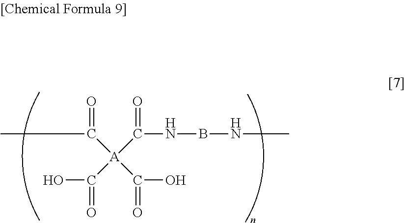 (where A denotes a tetravalent organic group represented by the formula [8] and B denotes a divalent organic group and n is an integer.)