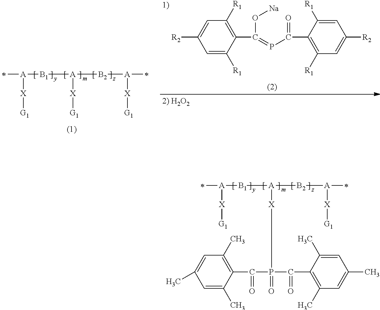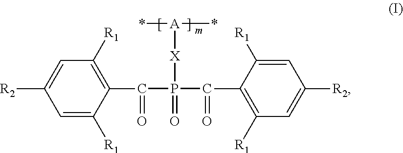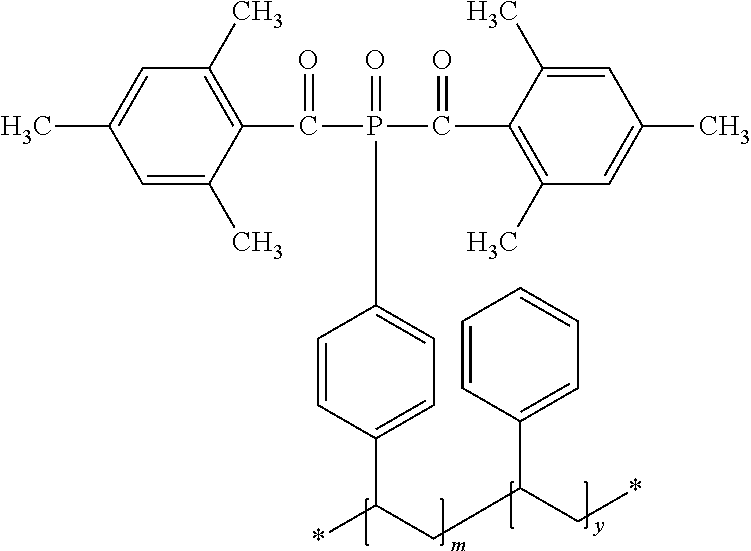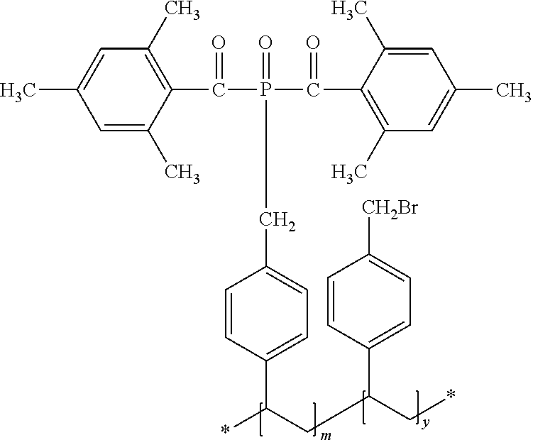 0.78 g (1.71 mmol, 1 eq.) of freshly prepared (4-vinylbenzyl)-bis(2,4,6-trimethylbenzoyl)-phosphine (example 1) and 1.8 mL (1.6 g, 15.4 mmol, 9 eq.) styrene are dissolved in 0.6 mL toluene. 47.6 mg (2% w/w) AIBN are added and the solution is stirred at 60° C. for 50 hours. 5 ml Toluene are subsequently added to the yellow gel which is formed in order to dissolve the polymer. The polymer is then precipitated by the addition of petroleum ether. This procedure is repeated twice before the polymer is filtrated off and washed with petroleum ether. The polymer is dried under vacuum providing 2.121 g of the (4-vinylbenzyl)-bis(2,4,6-trimethylbenzoyl)-phosphine/styrene co-polymer. Conversion: 87.4%.