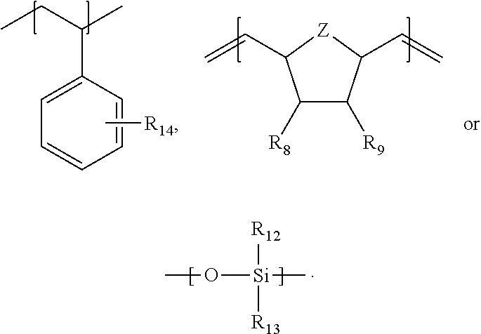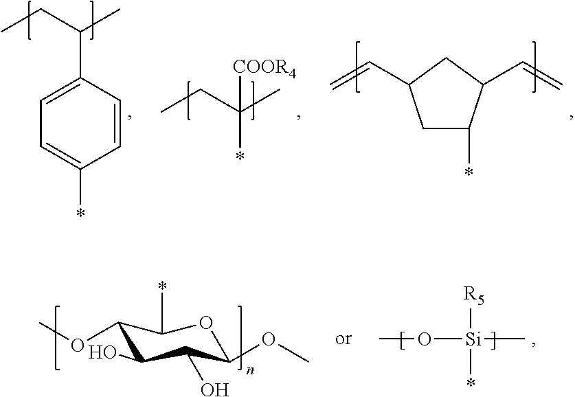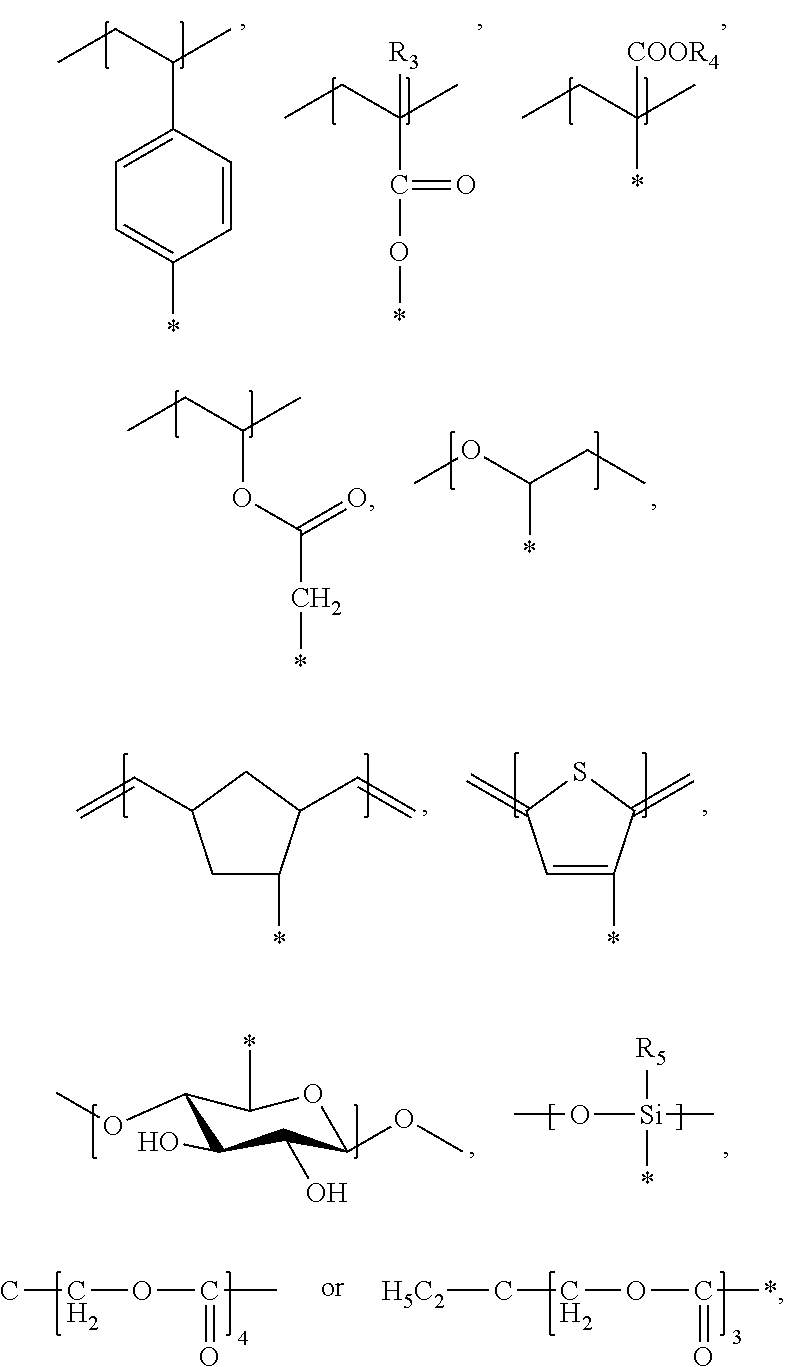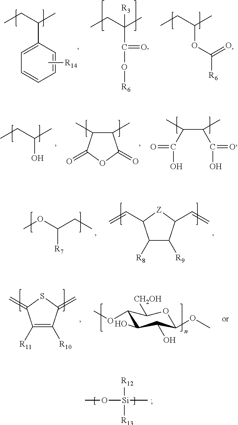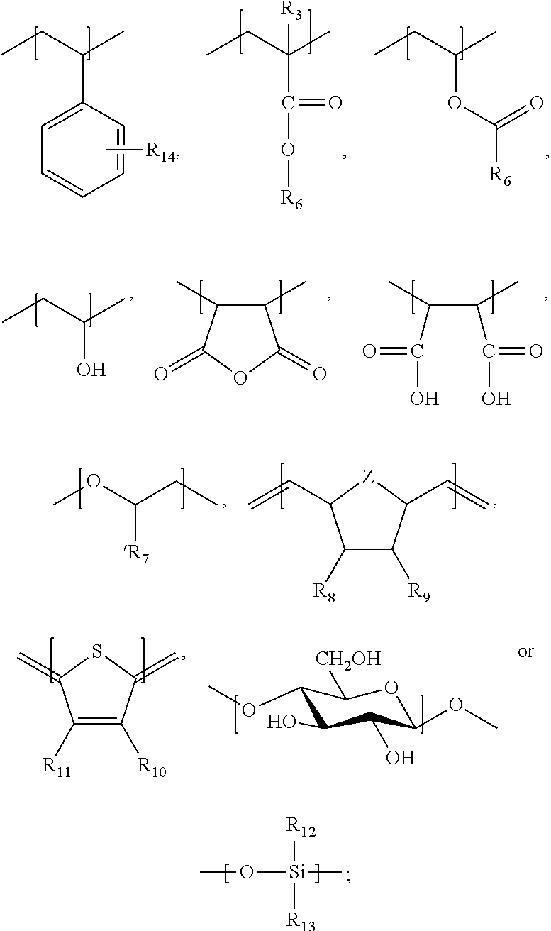 wherein A, B1and B2are incorporated into the same polymer backbone via random or block polymerization;