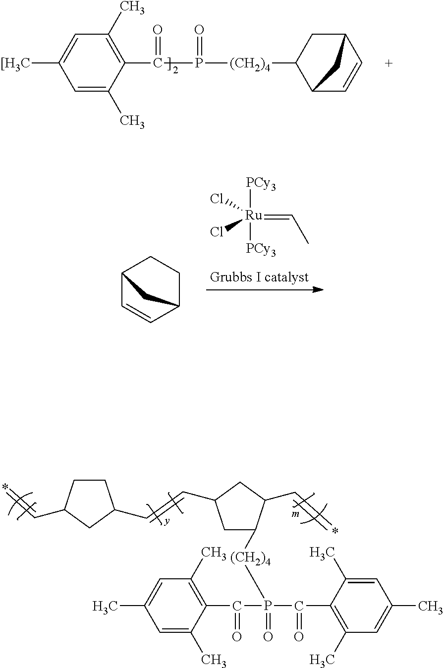 A drop of a 5% (by mass) solution of the (5-norbornen-2-butyl)-4-bis(2,4,6-trimethylbenzoyl)phosphine oxide/norbornene copolymer of example 48 in chloroform is placed on a silicon wafer to give a thin film. A copper net (0.14 mm mesh) is placed as a mask on this thin film. Subsequently a few drops of ethylacrylate are added on top of the net. After irradiation with a mercury medium pressure lamp for 10 minutes, the copper net is removed, leaving a structured surface with a polyacrylate coating in the areas exposed to light and lines of non-covered silica in the areas masked by the net structure.