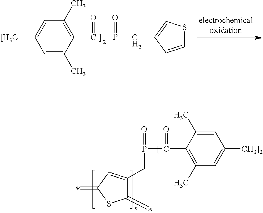 A drop of poly(3-(triethoxysilyl)propyl)bis(2,4,6-trimethylbenzoyl)phosphine oxide (example 31) dissolved chloroform is placed on a silicon wafer and the solvent is evaporated to give a thin film. A few drops of ethyl acrylate are added on top of the film, and half of the silicon wafer is covered with an alu foil. The wafer is then exposed to the irradiation of a high pressure mercury lamp. The part covered by the alu foil shows the polysiloxane polymer, while the part exposed to light is covered by an acrylic polymer.