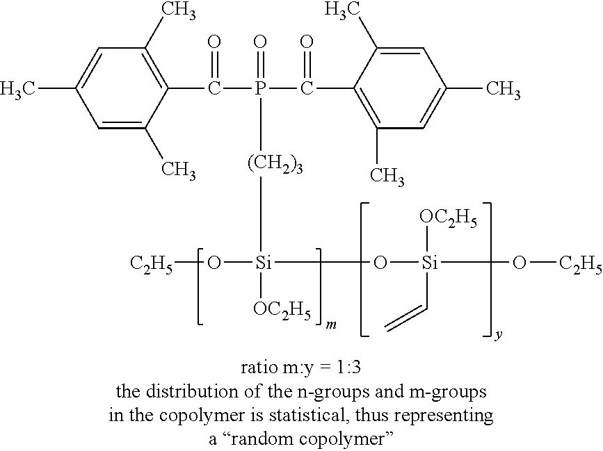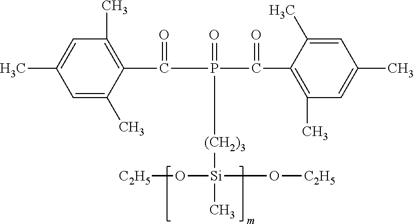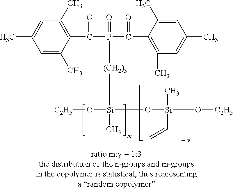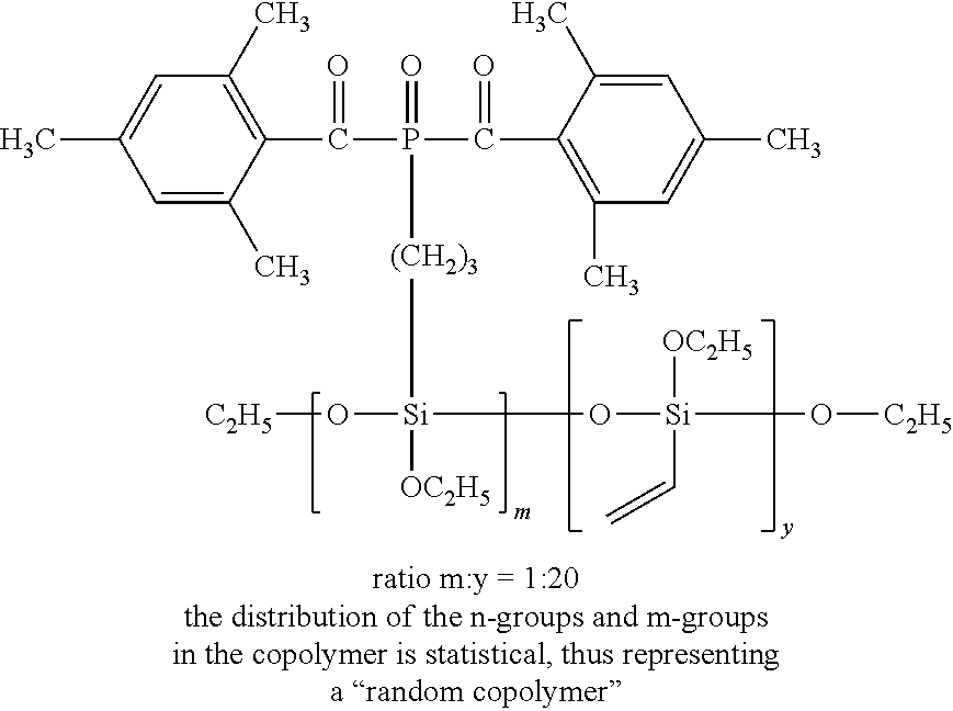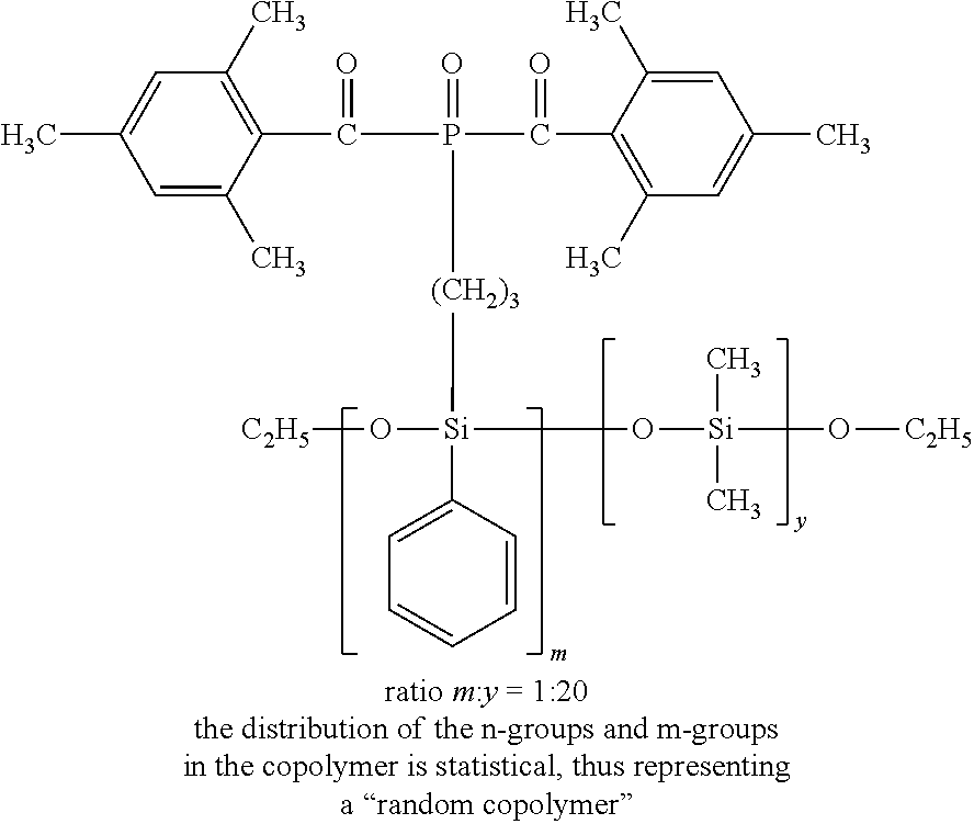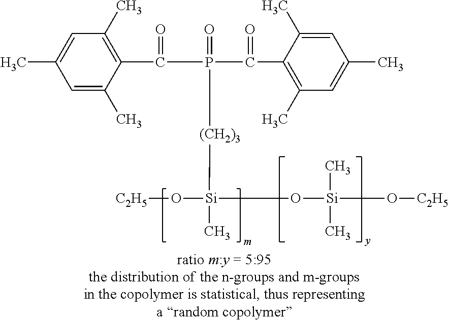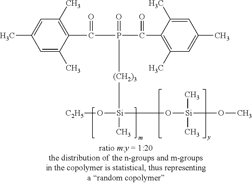 2% by weight of (3-(diethoxymethylsilyl)propyl)-bis(2,4,6-trimethylbenzoyl)phosphine oxide/diethoxydimethylsilan copolymer (example 38) are dissolved in the formulation by mixing at 50° C. for one hour.