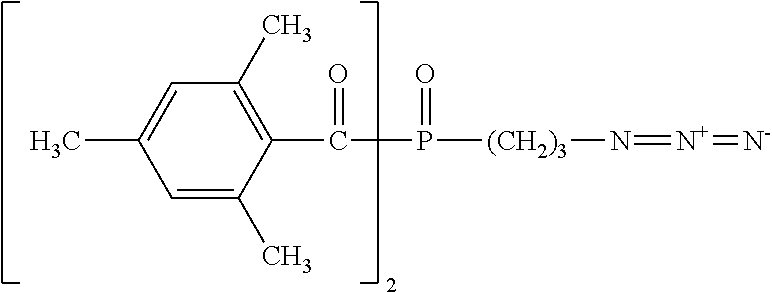 A copper net is placed on the wafer coated with poly(3-(triethoxysilyl)propyl)bis(2,4,6-trimethylbenzoyl)phosphine oxide (example 31) prepared as in example A6-a). A few drops of acrylonitril are added and the sample is irradiated with a medium pressure mercury lamp. After removal of the copper net, SEM analysis shows a structured surface with poly(acrylnitrile) pots in the irradiated zones (diameter: approximately 50 μm) and a polysiloxane coating in the shadowed areas.