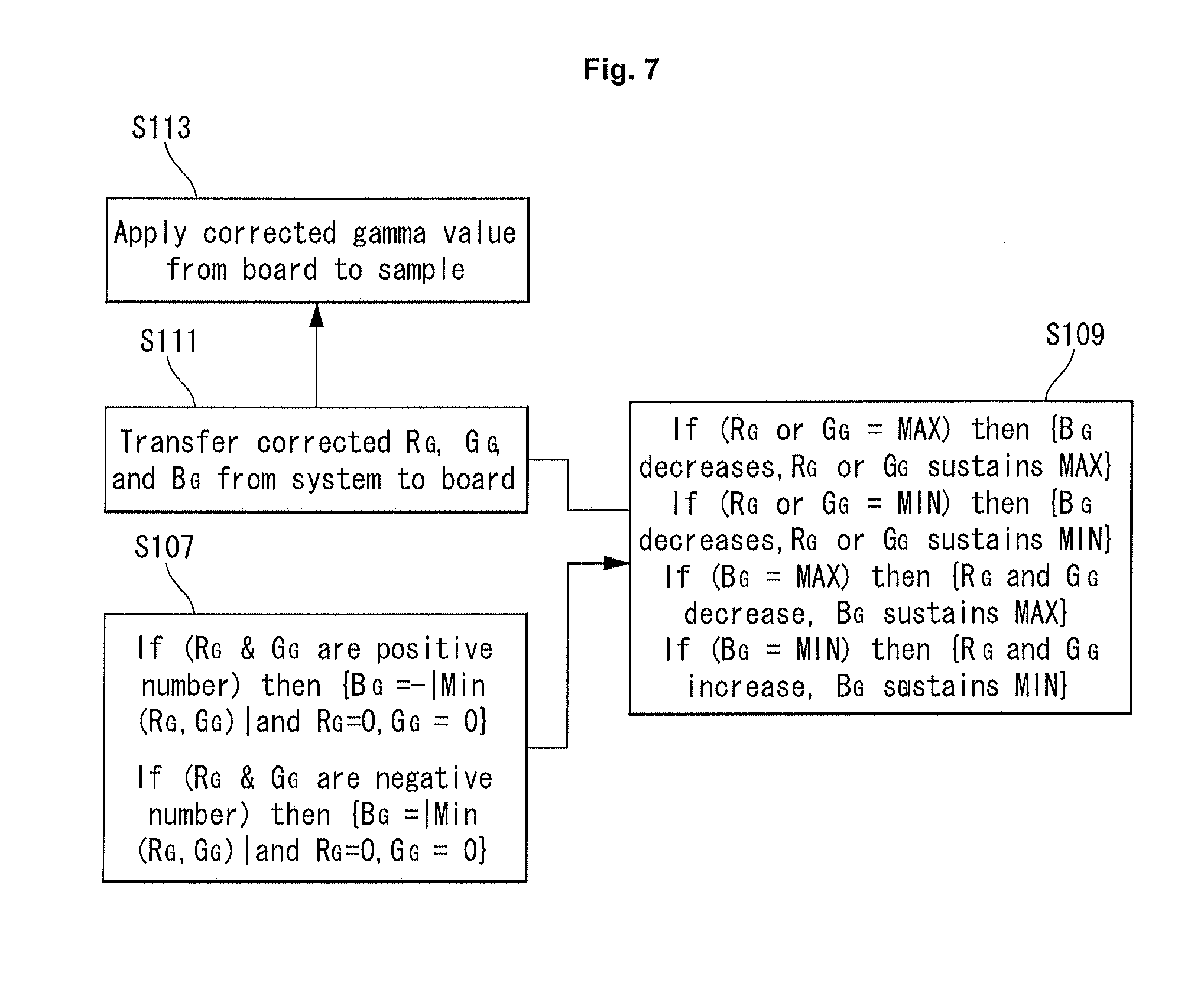 A figure illustrating step of determining (S105) illustrates that an allowable error of the fluctuation value RG of R gamma and the fluctuation value GG of G gamma is 0, but the allowable error is set as α, which is a value of 1 or less comprising a decimal point instead of 0, and this can be changed according to a request characteristic of a product. However, in the implementation, for a better understanding, it is described as the allowable error is 0.