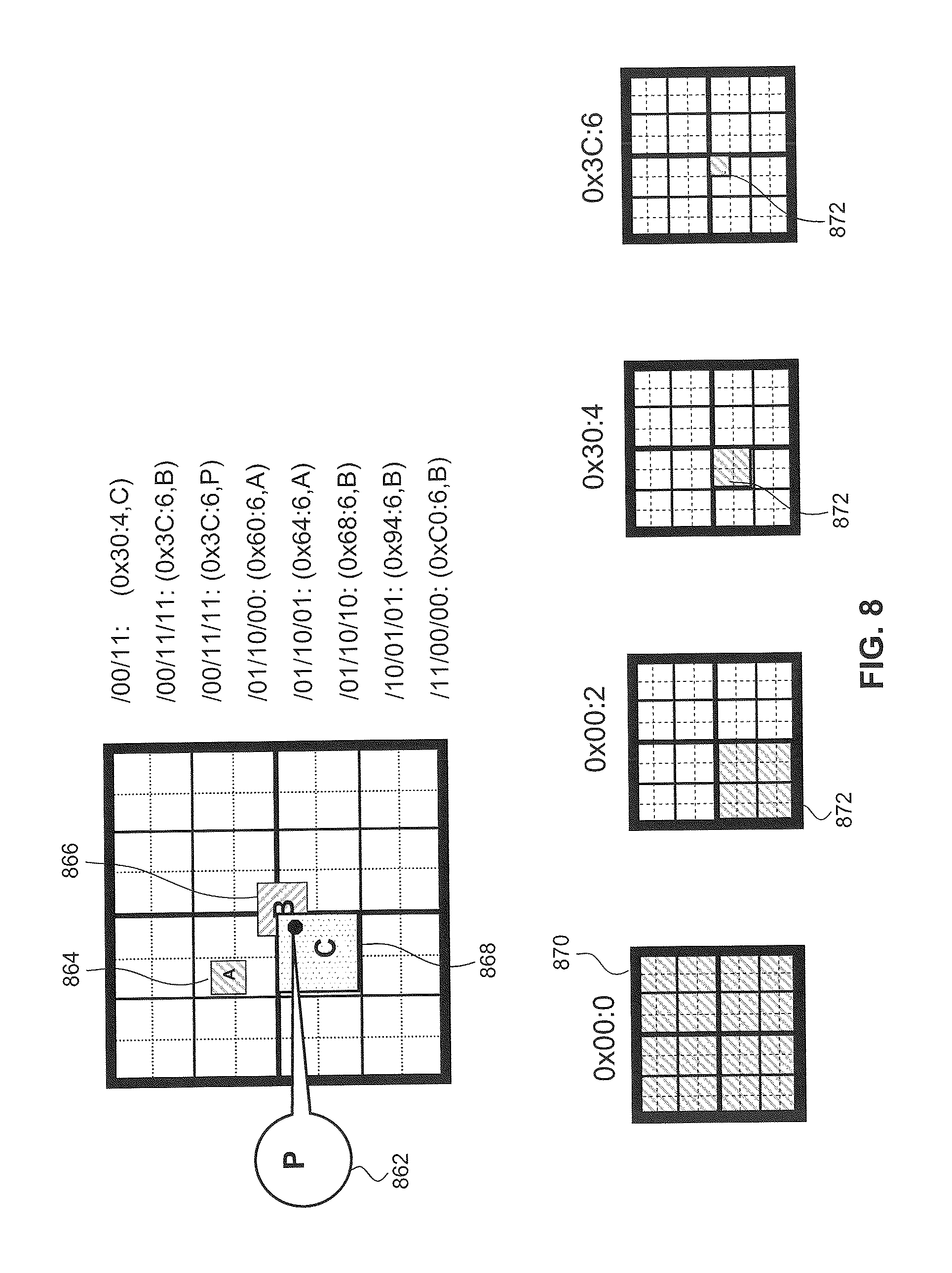 This can be extended to ranges: X IN ([4,4], [7,10), (21,30)), wherein the ranges should be non-overlapping so that duplicates in result rows are avoided. In this way duplicate data in result set 262 are avoided. In an embodiment, combining ranges is considered, even if this could return extra rows from the spatial index 240. Extra rows can be rejected by post-filters, such as filter 230. This reduces index probes at the cost of extra rows. According to an embodiment, a range width can be chosen, wherein the range width indicates the number of probes vs. number of leaves. In one embodiment, this choice of range width is made at run-time by execution unit 220. For example, execution unit 220 may estimate the number of rows in ranges based on trails. In an embodiment of the present invention, range decomposition could be done using histograms. For example, range decomposition can be done at query execution time using storage statistics, wherein the storage statistics are represented as histograms. The simplest strategy for executing a query with object o, for example, query object 978, is to approximate query o as block b=B In the definition of QWITHIN(b) shown in Table 4, the depth of block b′ is a property of the index (determined by key length, such as the Morton key length). The use of block b′ is necessary to handle decomposed data objects, such as geometry objects 252 because if a data object o′ contains o (which implies As shown in Block b=B For example, let O={o1, : : : , on} be any decomposition of query object o. The translation of fundamental queries to index range plans from Table 4 can be extended to decomposition O as follows: It is notable that within queries never benefit from query object decomposition. An exemplary algorithm for optimal query decomposition is provided in Table 5 below. According to an embodiment of the invention depicted in Since the tessellation for an object covers the object, there must be a tile in the object that covers a particular point, such as point 862. An object, such as polygon 864 is associated with smallest enclosing tile. As shown in Although the preceding section defines how each possible decomposition of the query object yields a different index range query, it does not provide guidance as to which decomposition to select. The choice of query decomposition can greatly affect query performance, but the choice is difficult to make heuristically. This is because while overly coarse-grained decompositions may incur high scanning costs, overly fine-grained decompositions can be equally expensive due to a large number of separate index probes. In order to minimize execution cost, in an embodiment, database system 100 must choose the decomposition of the query object that yields the optimal index range plan, where optimality is defined relative to the abstract plan-costing function COST(P) provided by the database system 100. Algorithm 2 in table 5 above illustrates a high-level description of an algorithm that performs this task. According to an embodiment, this algorithm can be applied to queries over any linearized quadtree index, independent of the chosen linearization or whether or not data objects are decomposed. The final plan output by Algorithm 2 corresponds to a particular query decomposition, but this chosen decomposition is identified by the plan-costing function. This is crucial, because the cost function can encapsulate knowledge specific to the data objects (e.g., number of data objects, statistical distribution of key values) as well as the current system context (e.g., system load, how much of a spatial index 240 is in memory, etc.). In this way, algorithm 2 automatically adapts to changes in the underlying data or system context (to the degree that these changes are reflected in the cost model for database system 100). While Algorithm 2 provides a high-level description of an algorithm for selecting the optimal execution plan for a query, in some contexts, it may be too abstract to implement efficiently. In particular, a query could have a very large number of distinct decompositions (super-exponential in the maximum index key size), but Algorithm 2 enumerates them exhaustively. As well, naively applying the formulae from Table 4 and the discussion of Algorithm 3 provided in Table 6 below illustrates an efficient, detailed implementation of Algorithm 2 specific to the case of a quadtree index based upon a Morton key encoding which contains non-decomposed data objects. Algorithm 3 includes the following three enhancements: