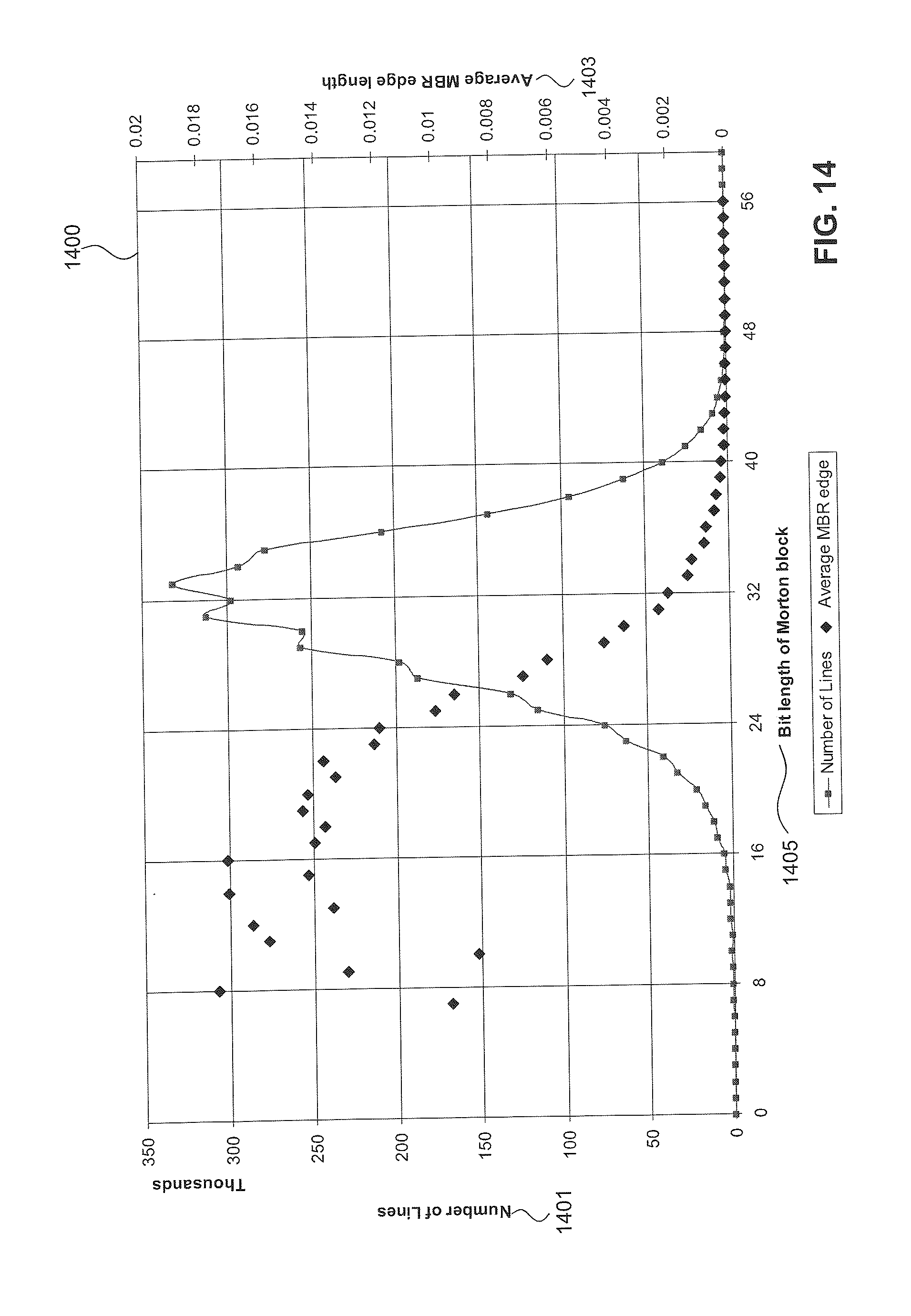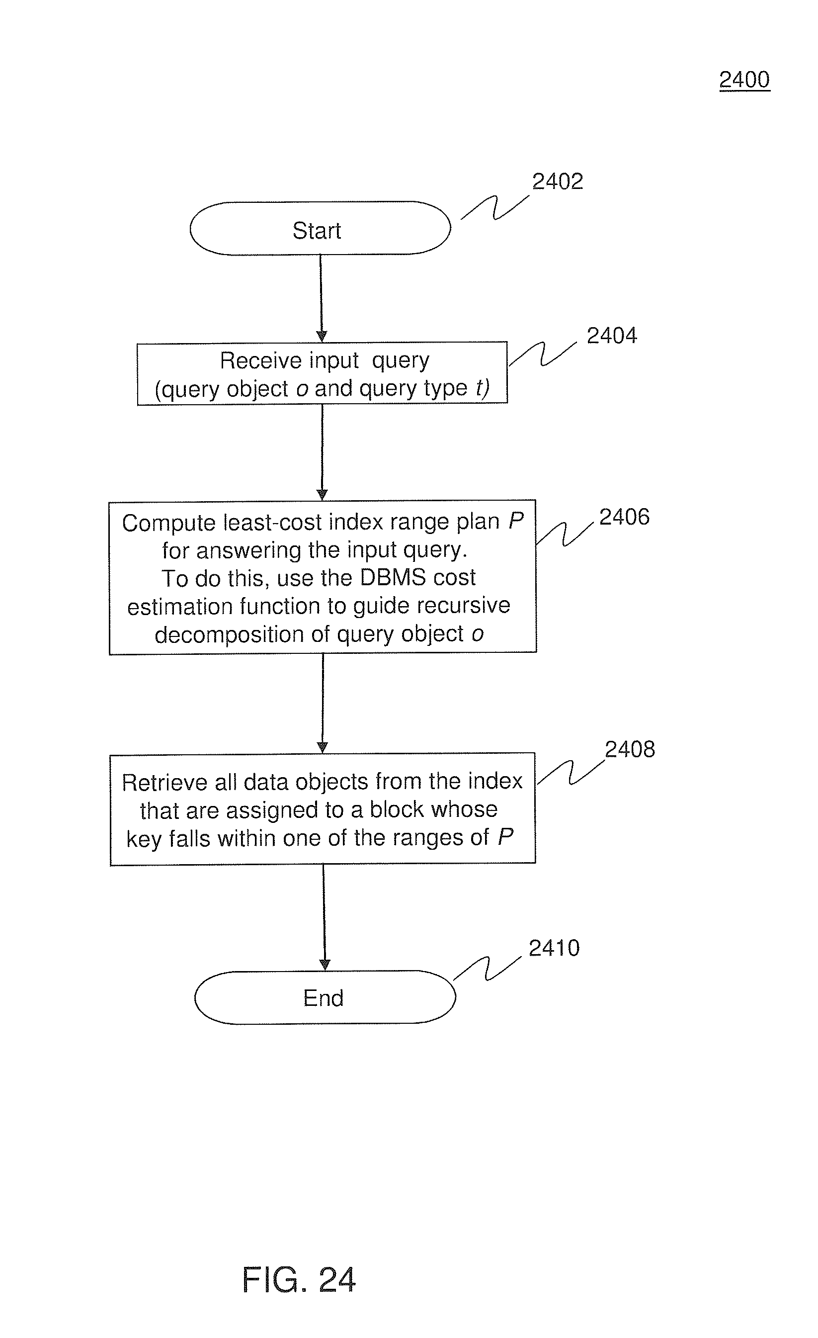 In an embodiment, query object decomposition assists in reducing (or eliminating) the need for tuning parameters for spatial indexes 240, because parameters governing geometry object tessellation are chosen dynamically at query execution time, rather than specified at index creation time. In an embodiment, a column definition has a unique identifier (i.e., an SRID) with space bounds such that all geometries in the column are within the known bounds. Optimal tessellation depends on the data stored in database storage 134. In an embodiment, data geometry objects 252 are not decomposed (i.e., are assigned to the single smallest block). Instead, query objects are decomposed according to the data distribution as described above with reference to While tuning parameters are largely avoided as a result of implementing the query object decomposition discussed above, in order to decompose the query object, in an embodiment, an optimizer is used. In a non-limiting embodiment, the Optimizer of SYBASE™ SQL ANYWHERE™ can be used as the optimizer discussed herein. The optimizer needs certain inputs or knowledge in order to generate efficient probe plans. One such input is the relative selectivity of a spatial predicate 260. For example, this may be based on a 2D histogram, such as the histogram provided in Another input needed by the optimizer is the cost of an index scan (for multiple ranges). For example, in cases where it is easy to generate an upper bounds, that may suffice for use as the cost of the index scan. The optimizer also needs to know the cost of evaluating a precise spatial predicate 260. If the cost is determined to be computationally expensive; the evaluation may be deferred. According to an embodiment, the optimizer may use predicate inference rules. In another embodiment, the predicate matching rules for materialized views may accommodate spatial predicates. Currently available products, such as SYBASE™ SQL ANYWHERE™ support materialized views. A materialized view can be refreshed by complete re-computation and may be defined by any complex query. However, the SQL ANYWHERE™ Optimizer can use only a certain class of materialized views in the view matching process during query optimization. Spatial join estimation can also aid the optimizer in avoiding the need for tuning parameters. According to an embodiment, small objects near large intersections can be found using a secondary code. For example, within the Morton block 1187 containing object 1186, a subordinate hierarchy can be defined. In this embodiment, coordinates are translated by approximately ½ to move major intersections. In another embodiment, a different space filling curve (i.e., besides Morton) can be used as well. The results shown in As shown in scatter plot graph 1290 of As shown in scatter plot 1294, run time 1292 for a query on points with a hot cache was approximately 5 ms+1 μs/row slope. The thousands of rows returned 1294 from the hot cache query are also shown in scatter plot 1294. Row counts indicated in With continued reference to As shown in scatter plot graph 1590 of As shown in scatter plot 1596, run time 1592 for a query on rectangles with a hot cache was approximately 6 ms+2 μs/row slope. The thousands of rows returned 1594 from the hot cache query are also shown in scatter plot 1596. As was the case with the point queries discussed above with reference to The rows truly matching the query on a rectangle are shown as matching rows 1698 displayed on the Y-axis of scatter plot 1697 of Throughout In an embodiment of the invention, spatial index creation interface 1700 illustrated in Although in the exemplary embodiments depicted in In the exemplary embodiment of As shown in As shown in Upon execution of the spatial query, spatial viewer 2360 displays the query results in results pane 2364. After results are displayed, a user can filter or alter the displayed results by selecting one or more of the drop down menus and checkboxes 2366 discussed above. For ease of explanation, database system 100 of Method 2400 begins at step 2402 and proceeds to step 2404 in which in which a search phrase with spatial search terms is received from a client device such as client device 110 In step 2406, a least-cost index range plan P is computed for the query received in step 2404. P is computed based upon input for the query. In the exemplary embodiment illustrated in In step 2408, all data objects from the index that are assigned to a block b whose key falls within one of the ranges of P are retrieved. In an embodiment of the invention, the key of block b is a Morton key (i.e., M After retrieval of all data objects from the index is complete, control is passed to step 2410, where method 2400 for querying a spatial quadtree index ends. Method 2500 begins at step 2501 and proceeds to step 2502 in which a search phrase with spatial search terms is received from a client device such as client device 110 In step 2504, index range plans Pwholeand Pdecompare initialized. In an embodiment, step 2504 is performed by executing steps 1 and 8 of algorithm 3. Plan Pwholedenotes the plan for the whole block b; that is, which does not decompose block b but instead uses a single index range to retrieve all objects assigned to b or any of its descendants. Plan Pdecompdenotes the plan for the decomposition of block b; that is, formed by composing optimal plans which are computed for each component of b's decomposition. After plans Pwholeand Pdecompare initialized, control is passed to step 2506. In step 2506, the index key range [K In step 2508, an evaluation is made regarding whether block b received/determined in step 2502 can be decomposed. In an embodiment, this evaluation is made by executing step 5 of algorithm 3 to determine if the value returned by function In step 2510, block b is decomposed into child blocks b0and b1by partitioning b. In an embodiment, step 2510 is performed by executing step 9 of algorithm 3, which ca