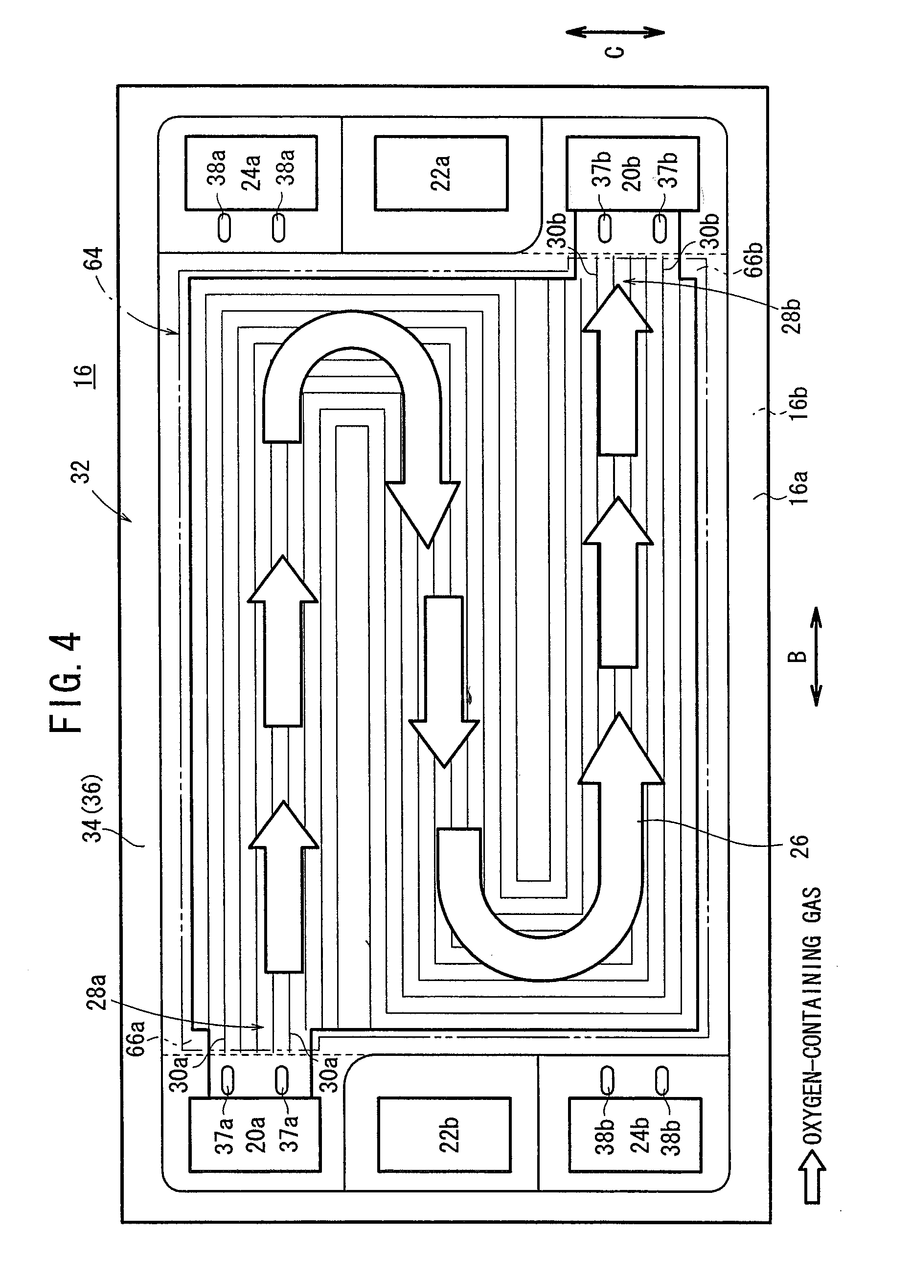 [0054]Then, the fuel gas supplied to, and consumed at the anode 62 is discharged through the fuel gas discharge passage 24b in the direction indicated by the arrow A. Likewise, the oxygen-containing gas supplied to, and consumed at the cathode 64 is discharged through the oxygen-containing gas discharge passage 20b in the direction indicated by the arrow A.