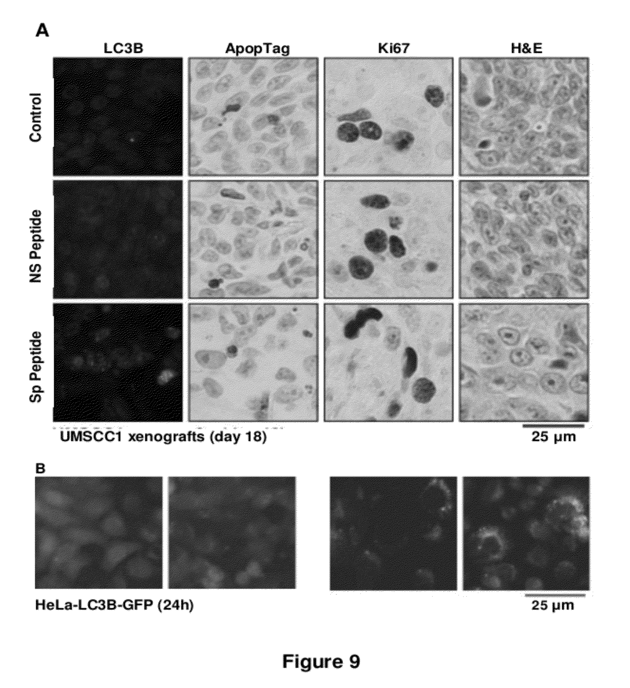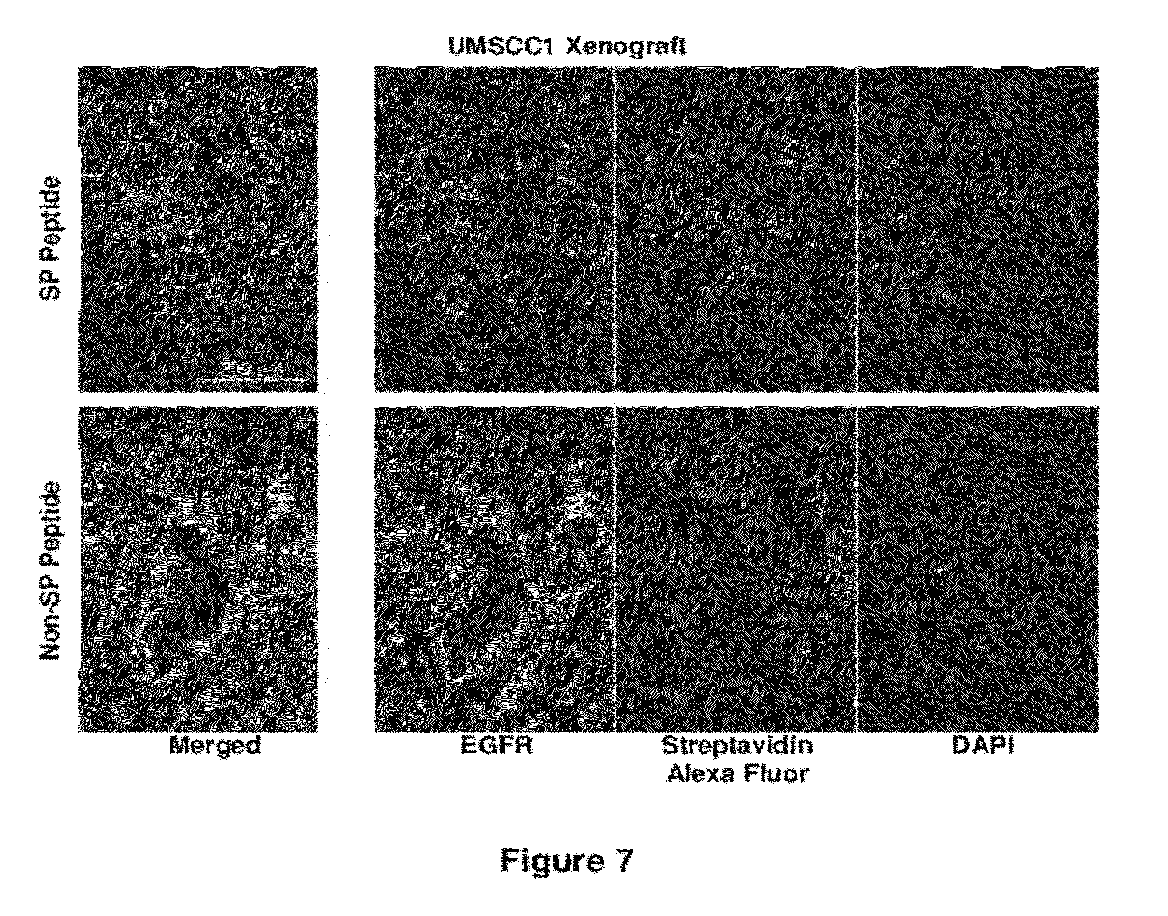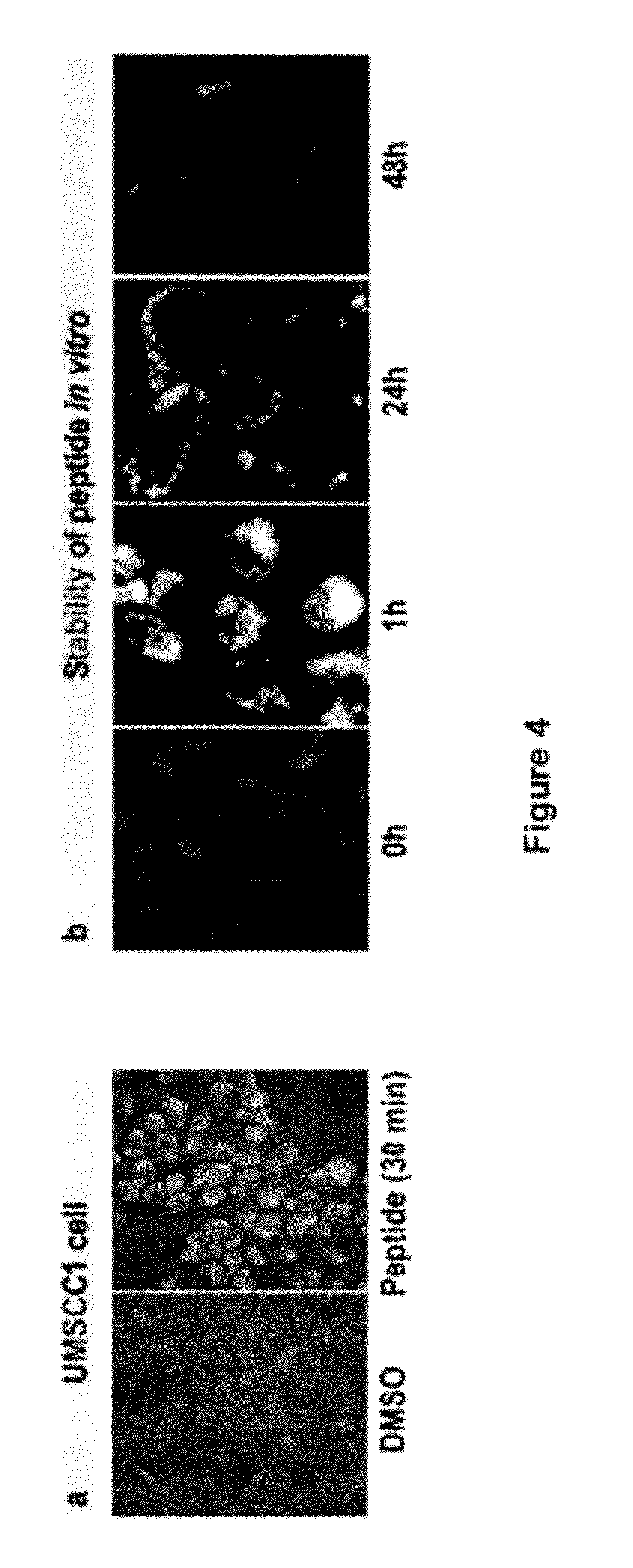 Effect of synthetic peptides on clonogenic survival of UMSCC1 cells: Peptide Sequence Survival Fraction 1 DEAYVMA 0.93 ± 0.1 2 SVDNPHVC 0.77 ± 0.12 3 RLLGIC 0.85 ± 0.16 4 GVGSPYVS 1 ± 0.16 5 DEAYVMASVDNPHVCRLLGIC 1 ± 0.14 6 DEAYVMAGVGSPYVSRLLGIC 1 ± 0.12 7 SVGNPHVC 0.97 ± 0.21 8 NHVPSDVC 1 ± 0.1 a Specific Peptide Biotin-YGRKKRRORRR-SVDNPHVC Non Specific Peptide Biotin-YGRKKRRORRR-NHVPSDVC b Human Cancer H&N Lung UMSCC1 UMSCC10B UMSCC74B A549 H1975 WT-EGFR WT-EGFR WT-EGFR WT-EGFR T790M-EGFR Specific 0.76 ± 0.02 0.63 ± 0.06 0.74 ± 0.15 0.57 ± 0.11 0.40 ± 0.08 Non Specific 1.62 ± 0.04 0.98 ± 0.04 0.88 ± 0.10 0.81 ± 0.09 0.77 ± 0.17 b Human Hamster Cancer Normal Lung Cervical Epithelial Fibroblasts Ovarian H3255 HeLa Het1A MRC5 CHO L858R-EGFR WT-EGFR WT-EGFR WT-EGFR EGFR Specific 0.71 ± 0.05 0.72 ± 0.05 1.02 ± 0.03 1.01 ± 0.04 0.98 ± 0.02 Non Specific 1.0 ± 0.07 0.92 ± 0.08 0.91 ± 0.11 1.04 ± 0.05 1.12 ± 0.14 Example 3