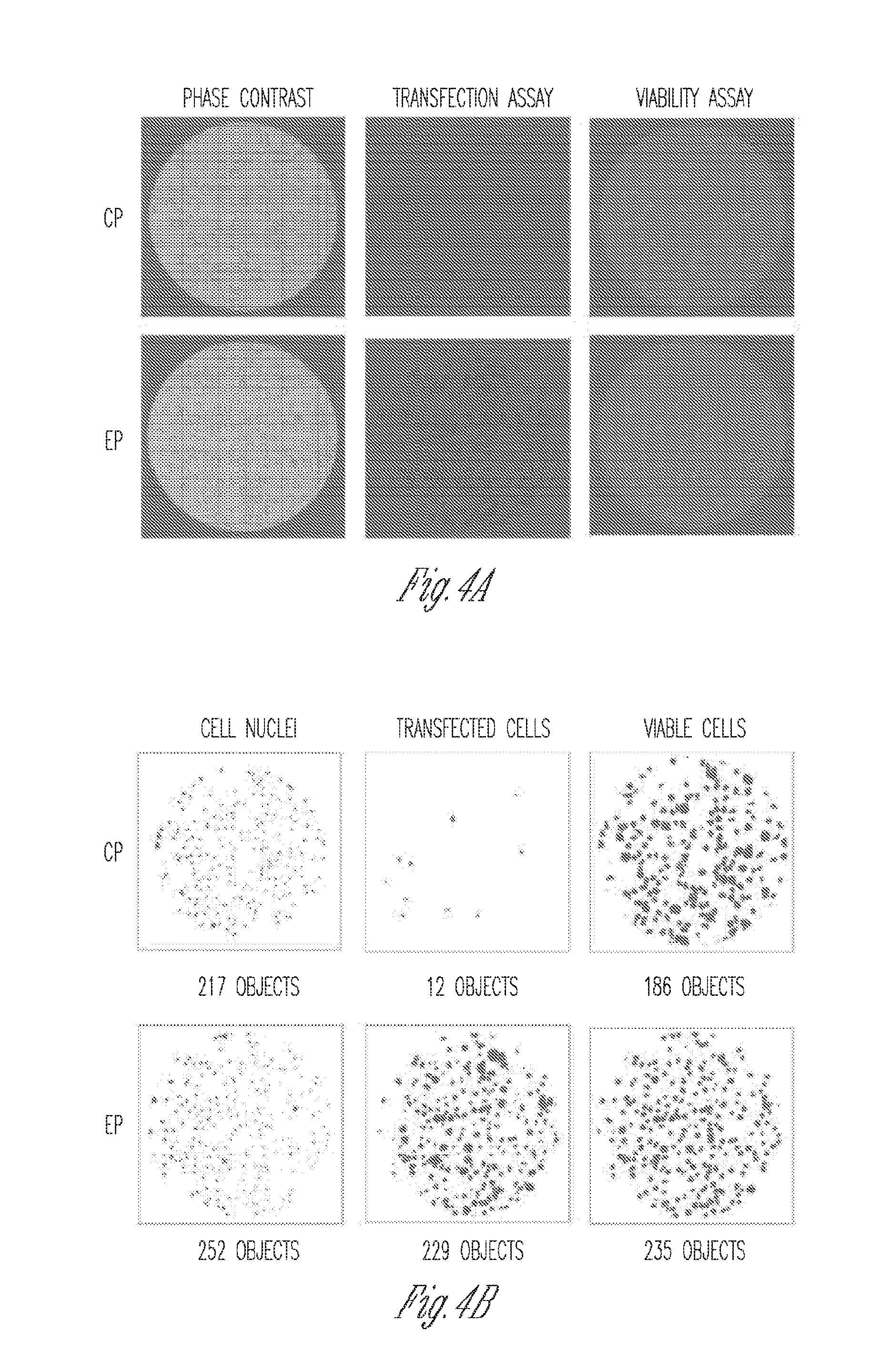 References in the specification to “one embodiment,” “an embodiment,” “an example,” etc., indicate that the embodiment described may include a particular feature, structure, or characteristic, but every embodiment may not necessarily include the particular feature, structure, or characteristic. Moreover, such phrases are not necessarily referring to the same embodiment. Further, when a particular feature, structure, or characteristic is described in connection with an embodiment, it is submitted that it is within the knowledge of one skilled in the art to affect such feature, structure, or characteristic in connection with other embodiments whether or not explicitly described. As used herein, the terms “transfect” and “transfection” mean the introduction of an exogenous molecule into a cell. Any method that causes an exogenous molecule to be introduced into a cell is a transfection method. Any exogenous molecule can be transfected into a cell, including, but not limited to, amino acids, bioactive molecules, polypeptides, nucleic acids, RNA, DNA, viruses, drugs, and nanoparticles as described in detail elsewhere in this document. As used herein, “transfect” and “transfection” are meant to include, but are not meant to be limited to, transduction and transformation. As used herein, the term “electroporation,” also known as electropermeabilization, is the introduction of an exogenous molecule into a cell by use of a significant increase in the electrical conductivity and permeability of the cell plasma membrane caused by an externally applied electrical field. A genome-wide mammalian genomic screening platform is provided according to the invention. This platform provides dramatically reduced screening costs, ease of use, the ability to run screens multiple times to enhance data quality, ease of storage of microfabricated screening substrates, and the ability to avoid chemical transfection. The platform allows the use of prokaryotic cells, eukaryotic cells, single-celled organisms, human cells, primary cells and difficult to transfect cell lines. According to the invention, certain embodiments use electroporation to introduce nucleic acids into mammalian cells. Also, certain aspects of the invention provide the fabrication of a microwell array to create spatially defined regions of microscale cultures and to restrict cell motility. In preferred embodiments according to the invention, the edges of the microwells allow for accurate determination of microscale culture position on the conductive substrate during image acquisition and phenotypic analysis. Section A of The microwells can be created on all types of substrates. In some embodiments, the substrate is composed of different layers (components). In certain embodiments, the substrate is rigid. In other embodiments, the substrate is flexible. In certain embodiments, glass is employed as a base support and a conductive metal is deposited thereon; thus, the two layers provide separate functions. Glass provides the base structure, whereas the conductive metal provides the conductivity. Borosilicate, quartz, soda-lime, and both porous and non-porous glass are contemplated for substrate base use. In alternative embodiments, a metal such as stainless steel is used as the base and for conductivity. In some embodiments, the base support is composed of flexible plastic, silicon, polysilicon, doped silicon or Teflon and the conductive material is a conductive polymer or a gold film. In some embodiments, a composite material containing conductive particles is employed for the base portion. In some embodiments, the substrate base is made of plastic or polymer. Poly-methyl-methacrylate (PMMA), Polystyrene, Polycarbonate, and Prolypropylene are all contemplated for the substrate base material. In some embodiments, the substrate base is made of metal or ceramic. Microwells can be of any shape, for example squares, circles, rectangles or any other desired shape. As mentioned above, the walled frame is mounted onto the substrate to create the microwell array. The walled frame comprises an optically visible material having an array of apertures separated by walls. The walled frame is optically visible such that the walls of the walled frame can be identified by an optical camera. In one example, the walled frame is formed of photo-definable biocompatible polymers. The microwells are formed when the walled frame is placed onto the substrate. Each aperture of the walled frame forms the walls of a microwell and the surface of the substrate forms the bottom of the microwell. Accordingly, each microwell is separated from adjacent microwells by a wall of the walled frame. In some examples the microwell array contains 484 microwells. In some examples the microwell array contains 2,592 microwells. In some examples, the microwell array is expanded to contain 20,736 microwells, which is approximately human genome capacity. In some examples, the microarray is housed in a standard 96 or 384 well plate footprint. The microwell array is mounted onto the side of the substrate having the conductive material (ITO) thereon. Accordingly, the conductive material is located on the bottom of each microwell. In one example, the microwell array is created by placing a laser cut coverlay on the center of a substrate. One example of a suitable coverlay is the FlexTac BGA Rework Stencil 22×22 array having a thickness of 100 μm (produced by CircuitMedic, MA). In one example, the walled frame is mounted to the substrate with an adhesive. For example, the coverlay is adhered to a conductive ITO coated microscope slide using the pre-coated adhesive provided on the backside of the coverlay. In other examples, to obtain precise straight edges and defined geometric features, microfabrication techniques using photopatternable polymers are used to create the walled frame. In the example shown in In one example, a pattern of a highly conductive material (e.g.