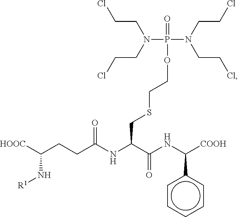 The compounds are stated to be useful drugs for the selective treatment of target tissues that contain compatible GST isoenzymes, and simultaneously elevate the levels of GM progenitor cells in bone marrow. Disclosed embodiments for L include those that generate a drug that is cytotoxic to unwanted cells, including the phosphoramidate and phosphorodiamidate mustards. TLK286, identified in those publications as TER 286 and named as γ-glutamyl-α-amino-β-((2-ethyl-N,N,N,N-tetra(2′-chloro)ethylphosphoramidate)sulfonyl)propionyl-(R)-(−)phenylglycine, is one of these compounds. TLK286 is the compound of the formula TLK286 as the hydrochloride salt has the United States Adopted Name (USAN) of canfosfamide hydrochloride. Lyttle et al., Canfosfamide is an anticancer compound that is activated by the actions of GST P1-1, and by GST A1-1, to release the cytotoxic phosphorodiamidate moiety. Following activation of canfosfamide by GST P1-1, apoptosis is induced through the stress response signaling path-way with the activation of MKK4, JNK, p38 MAP kinase, and caspase 3. In vitro, canfosfamide has been shown to be more potent in the M6709 human colon carcinoma cell line selected for resistance to doxorubicin and the MCF-7 human breast carcinoma cell line selected for resistance to cyclophosphamide, both of which overexpress GST P1-1, than in their parental cell lines; and in murine xenografts of M7609 engineered to have high, medium, and low levels of GST P1-1, the potency of canfosfamide was positively correlated with the level of GST P1-1 (Morgan et al., Canfosfamide hydrochloride, as a single agent, and in combination with other anticancer agents, is currently being evaluated in multiple clinical trials for the treatment of ovarian, breast, non-small cell lung, and colorectal cancers. It has demonstrated significant single agent antitumor activity and improvement in survival in patients with non-small cell lung cancer and ovarian cancer, and single agent antitumor activity in colorectal and breast cancer. Evidence from in vitro cell culture and tumor biopsies indicates that canfosfamide is non-cross-resistant to platinum, paclitaxel, and doxorubicin (Rosario et al., Herr et al., The disclosures of the documents referred to in this application are incorporated into this application by reference. In a first aspect, this invention is compounds of the formula In a second aspect, this invention is compounds of the formula In a third aspect, this invention is compounds of the formula In a fourth aspect, this invention is compounds of the formula In a fifth aspect, this invention is methods of preparing canfosfamide or its salt, comprising deprotecting a compound of the first aspect of this invention, optionally followed by forming a salt of canfosfamide. In a sixth aspect, this invention is methods of preparing compounds of the first aspect of this invention, comprising oxidizing a compound of the second aspect of this invention. In an seventh aspect, this invention is methods of preparing compounds of the second aspect of this invention, comprising reacting a compound of the third aspect of this invention with a 2-(A-sulfonyloxy)ethyl N,N,N′,N′-tetrakis(2-chloroethyl)phosphorodiamidate under basic conditions. In an eighth aspect, this invention is methods of preparing compounds of the third aspect of this invention, comprising deprotecting the sulfur atom of a compound of the fourth aspect of this invention. In a ninth aspect, this invention is pharmaceutical compositions comprising a compound of the first aspect of this invention, methods of treating cancer by administering a compound of the first aspect of this invention, and compounds of the first aspect of this invention for the treatment of cancer and for use in the manufacture of medicaments for the treatment of cancer. Preferred embodiments of this invention are characterized by the specification and by the features of claims 2-4, 6-8, 10-12, 14-18, 20, 21, 23-27, 29-35, 37-42, 44-46, 48-50, and 52-54 of this application as filed. Definitions “Canfosfamide” is the compound of the formula: It has the CAS name Suitable salts (see Berge et al., An “amine-protecting group” is a group capable of protecting the glutamyl α-amine group of An “(optionally substituted benzyl)oxycarbonyl” includes benzyloxycarbonyl and benzyloxycarbonyl substituted on the benzene ring with one or two, typically one, electron-withdrawing substituents, such as halo (typically chloro or bromo), nitro, cyano, and trifluoromethyl. Examples of (optionally substituted benzyloxycarbonyl include benzyloxycarbonyl, halo-benzyloxycarbonyls such as 2- and 4-bromobenzyloxycarbonyl, 2-, 3-, and 4-chlorobenzyloxycarbonyl, and 2,4-dichlorobenzyl-oxycarbonyl, 2-, 3-, and 4-nitrobenzyloxycarbonyl, 4-cyanobenzyloxycarbonyl, and the like. An “(optionally substituted allyl)oxycarbonyl” includes allyloxycarbonyl and allyloxycarbonyl substituted with an electron-withdrawing substituent (such as phenyl optionally substituted with one or two, typically one, electron-withdrawing substituents, or pyridyl) on the 3-position of the group, and 1-isopropylallyloxycarbonyl. Examples of (optionally substituted allyl)oxycarbonyl include allyloxycarbonyl, cinnamyloxycarbonyl, 4-nitrocinnamyloxycarbonyl, 3-(3′-pyridyl)allyloxycarbonyl, and 1-isopropylallyloxycarbonyl. A sulfur-protecting group” is a group capable of protecting the sulfur atom of Amine-protecting groups, including catalytically removable amine-protecting groups, and sulfur-protecting groups, including acidolytically removable sulfur-protecting groups, are well known in the field of organic synthesis and particularly peptide synthesis. Suitable such groups, and the conditions for their removal, are described in books such as Because the compounds of the fourth aspect of this invention contain both an amine-protecting group, especially a catalytically removable amine-protecting group, and a sulfur-protecting grou
