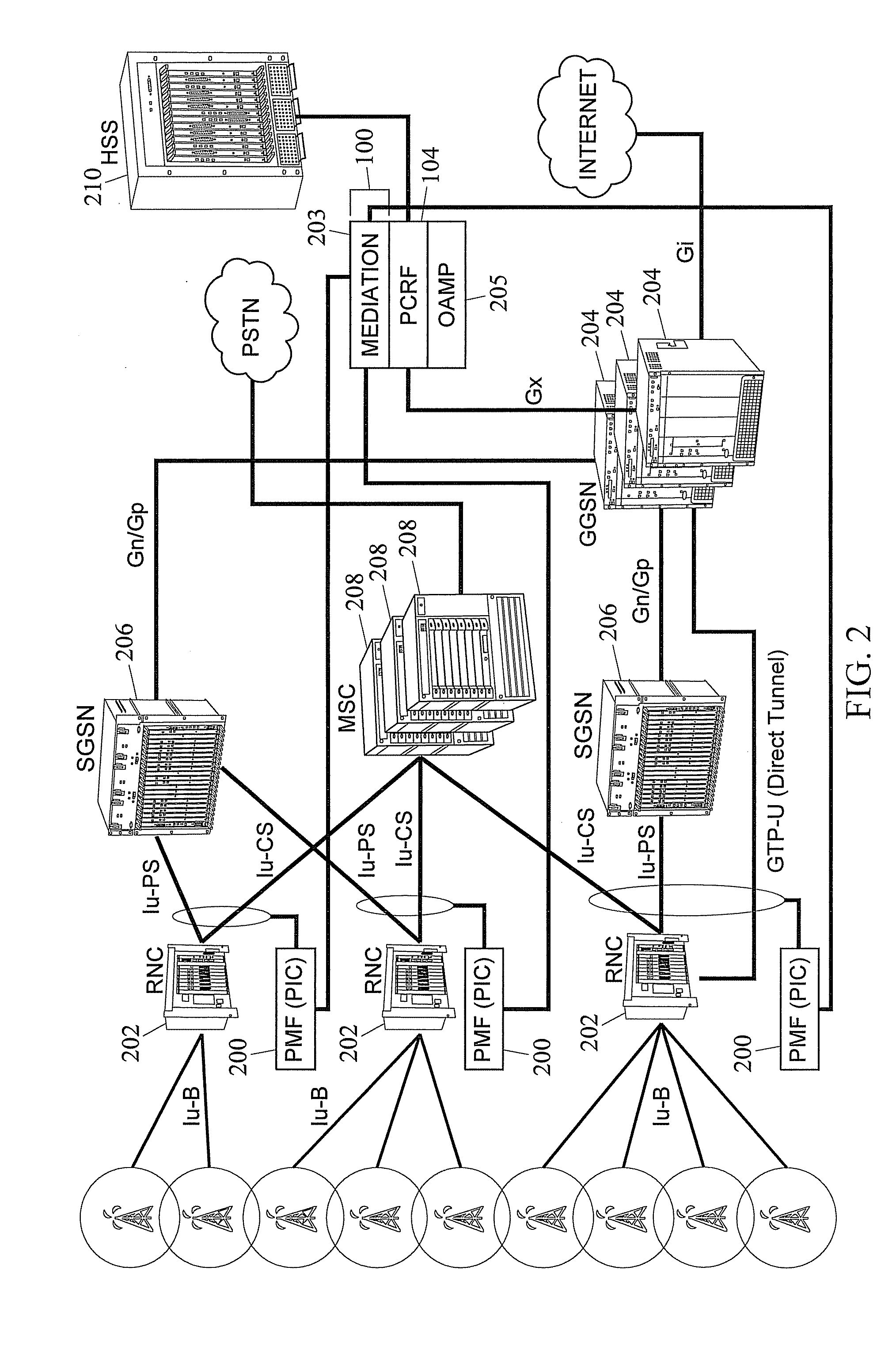 The solution also analyzes the collected data to produce reports that help the service provider plan and tune their radio network resources. One exemplary implementation of the subject matter described herein integrates two network elements: 1. Performance Intelligence Center (PIC), generically referred to herein as the monitoring module. 2. Policy and Charging Rules Function (PCRF), generically referred to herein as the policy server. The function of the PIC or monitoring module is to detect cell congestion and the severity of the congestion using control and/or user plane link probes that monitor, from the wireline side, communications to and from network elements that connect to a radio access network (e.g., GRAN, GERAN, UTRAN, Long Term Evolution, E-UTRAN, Wi-Fi access network, WiMax access network, etc.) and to notify the PCRF when congestion/decongestion conditions occur. The PIC or monitoring module may alternatively monitor messages on the wireless side of the RNC, i.e., between the RNC and the eNode B, without departing from the scope of the subject matter described herein. The function of the PCRF or policy server is to act on the cell congestion data provided by PIC and apply appropriate policies to mitigate the congestion. According to one aspect of the subject matter described herein, a PIC monitoring module and a PCRF work together to detect and mitigate cell congestion in a wireless or radio access network and exemplary architectures and operational scenarios are described in detail below. A new set of policies relating to RAN congestion is added in the PCRF. The policies can be provisioned by the service provider to define rules that are to be applied when congestion occurs. Exemplary rules include adjusting the quality of service (QoS) for subscribers in the congested cells and/or denying new context activations from mobile subscribers. A new messaging infrastructure is implemented for the PIC—PCRF communication. As mentioned in the previous section, one exemplary implementation of the subject matter described herein includes a PIC and a PCRF, as shown in In the illustrated example, probes 200 are co-located with RNCs 202. In an alternate example, probes 200 may be integrated within RNCs 202. The function of PIC 100 is to monitor the Iu packet switched (Iu-PS), Iu circuit switched (Iu-CS) interfaces and general packet radio service tunneling protocol (GTP) direct tunnels between RNC 202 and gateway GPRS support nodes (GGSNs) 204, servicing GPRS support nodes (SGSNs) 206, and mobile switching centers (MSCs) 208, measure network performance and detect congestion of cells. Probes 200 tap the above-mentioned interfaces and acquire all the PDUs being exchanged between RNCs 202 and SGSNs 206 and between RNCs 202 and GGSNs 204 (direct tunnel). PIC 100 uses the collected protocol data untis (PDUs) to compute bandwidth usage per cell site as well as other indications of congestion. PIC 100 notifies PCRF 104 when there is a change in the congestion level. PCRF 104 system receives congestion/decongestion notification messages from the PIC monitoring module (IXP) and applies appropriate subscriber policy control actions. The subscriber policies may be communicated to GGSNs 204 using Diameter messages on the Gx interface. GGSNs 204 enforce the policy rules provisioned by PCRF 104. PCRF 104 may also access/utilize subscriber profile information (e.g., subscriber service level [e.g., Platinum, Gold, Silver], etc.) in the process of making policy decisions. Subscriber profile data may be stored, for example, in a subscriber profile repository (SPR), subscriber data management (SDM) module, a home location register (HLR), or a home subscriber server (HSS). In this example, PCRF 104 supports standard 3GPP-specified interfaces for retrieving subscriber information from HSS 210. In one embodiment, where PCRF 104 is configured to use HSS 210, HSS 210 can be provisioned as the subscriber data source. If HSS 210 is integrated with PCRF 104, PCRF 104 automatically merges information from HSS 210 when a Gx session for a particular IMSI or hardware ID is bound to the PCRF. In one embodiment, PCRF 104 automatically queries HSS 210 at the time of Gx attachment in order to retrieve information regarding the subscriber. In the example illustrated in PIC 100 may monitor message traffic on a wired interface of a radio network control device. For example, PIC 100 may monitor the Iu interface of an RNC. However, all the data needed to compute data usage and detect congestion may not be available from the Iu interface. PIC 100 may not monitor the Iu-b interface (interface between the node B and the RNC) and therefore may not have a view into the radio resource control messages being exchanged between the node Bs and the RNC. Monitoring Iu-b messages in order to determine congestion requires too many probes and is not considered to be a viable approach by most service providers. The lack of Iu-b monitoring is compensated for by employing an approximation-based detection algorithm for identifying RAN congestion. In an exemplary LTE embodiment, a PIC monitoring module may monitor traffic associated with mobile subscribers on communication links associated with an S1-C and/or and S1-U interface between an eNode B and a Mobility Management Entity (MME). In another exemplary embodiment, in order to obtain mobile subscriber identifying information, a PIC monitoring module may monitor control plane traffic (e.g., Update Location Request/Answer, Cancel Location Request/Answer, etc.) associated with mobile subscribers on communication links associated with an S6 interface between an MME and an HSS. In another exemplary embodiment, in order to obtain mobile subscriber identifying information, a PIC monitoring module may monitor control plane traffic (e.g., MAP Update Location, MAP Insert Subscriber Data, MAP Cancel Location, etc.) associated with mobile subscribers on communication links associated with an MAP int