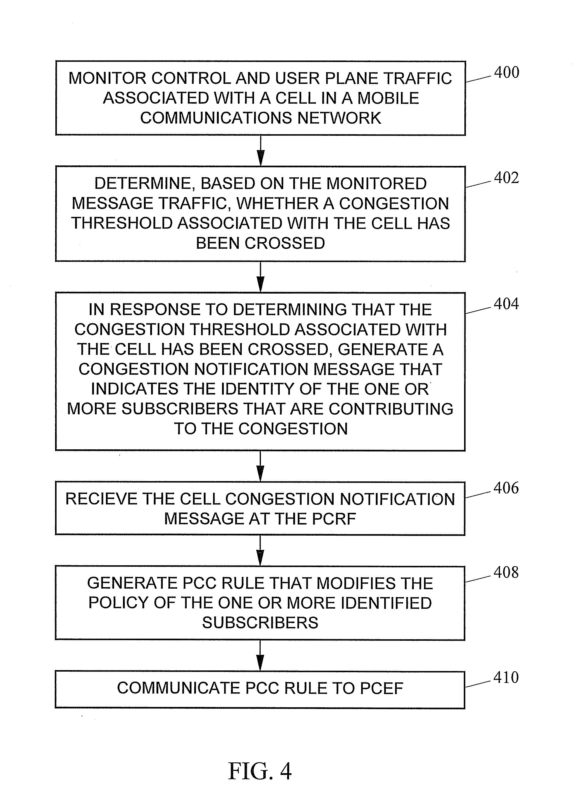 monitoring control and user plane traffic associated with a cell in a mobile communications network; determining, based on the monitored message traffic, whether a congestion threshold associated with the cell has been crossed; in response to determining that the congestion threshold associated with the cell has been crossed, generating a congestion notification message that includes the identity of the one or more subscribers that are contributing to the congestion; receiving the congestion notification message at a policy server; generating a policy control and charging rule that modifies the policy of the one or more subscribers; and communicating the PCC rule to a policy and charging enforcement function (PCEF). 13. The method of 14. The method of 15. The method of 16. The method of 17. The method of 18. The method of 19. The method of 20. The method of 21. The method of 22. The method of 23. A non-transitory computer readable medium having stored thereon executable instructions that when executed by the processor of a computer control the computer to perform steps comprising: