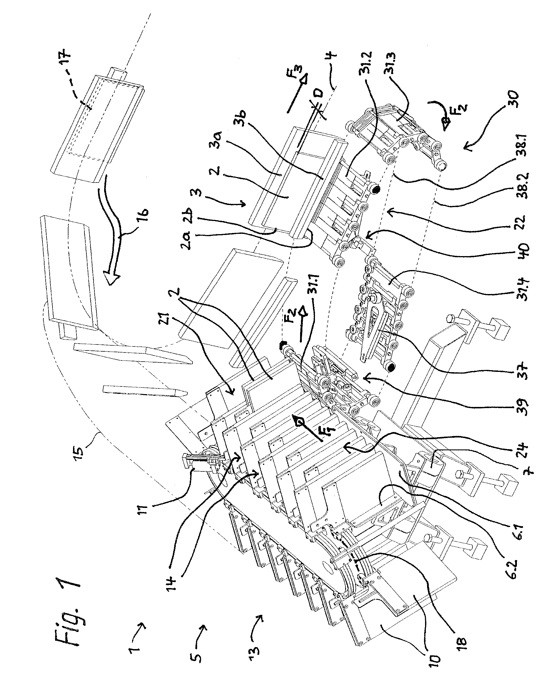 a continuously driven book block conveying device (4) with clamping elements (3) that laterally clamp the sheet stacks (2), with a stack spine edge (2 a vibrator device (5) for aligning the sheet stacks (2), and a transfer conveying device (30) for the synchronous transfer of the sheet stacks (2) to the book block conveying device, wherein the vibrator device (5) includes at least one first vibrating plate (6.1) that is inclined relative to horizontal and on which the sheet stacks (2) are aligned while they stand on their spine edges (2 wherein the transfer conveying device (30) is a clamping conveyor (30, 31.1 . . . 4) for receiving aligned sheet stacks (2) from an inclined, stationary position (21) in the vibrator device (5) and for synchronously, positively transferring (22) said aligned sheet stacks to the continuously driven book block conveying device with said spine edge (2 2. The device according to 3. The device according to 4. The device according to 5. The device according to 6. The device according to 7. The device according to 8. The device according to 9. The device according to 10. The device according to 11. The device according to 12. The device according to 13. The device according to 14. The device according to 15. The device according to
