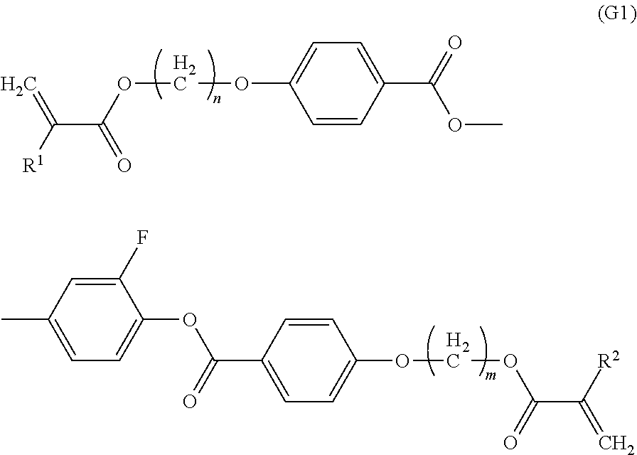 In Liquid Crystal Elements 1 to 5 shown in Tables 1 to 5, the following components were used as polymerizable monomers: F-RM257-O3 (abbreviation) which is a polymerizable monomer represented by the following structural formula (102), in Liquid Crystal Element 1; F-RM257-O4 (abbreviation) which is a polymerizable monomer represented by the following structural formula (103), in Liquid Crystal Element 2; F-RM257-O5 (abbreviation) which is a polymerizable monomer represented by the following structural formula (104), in Liquid Crystal Element 3; F-RM257-O6 (abbreviation) which is a polymerizable monomer represented by the following structural formula (105), in Liquid Crystal Element 4; and F-RM257-O7 (abbreviation) which is a polymerizable monomer represented by the following structural formula (106), in Liquid Crystal Element 5.
