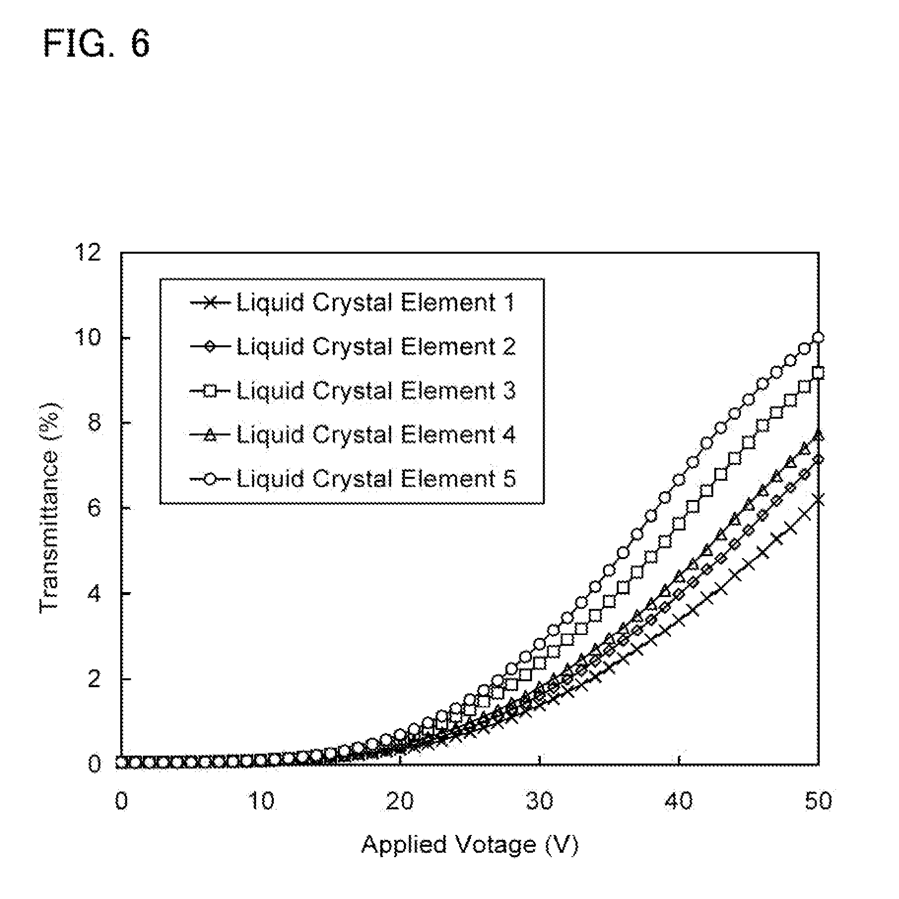 Further, voltage was applied to Liquid Crystal Elements 1 to 5, and the transmittance with respect to an applied voltage was evaluated. The characteristic evaluation was performed with a liquid crystal evaluation system (LCD-7200 produced by Otsuka Electronics Co., Ltd.) under the following conditions: a halogen lamp was used as a light source, the temperature was set to room temperature, and Liquid Crystal Elements 1 to 5 were sandwiched between polarizers in crossed Nicols.