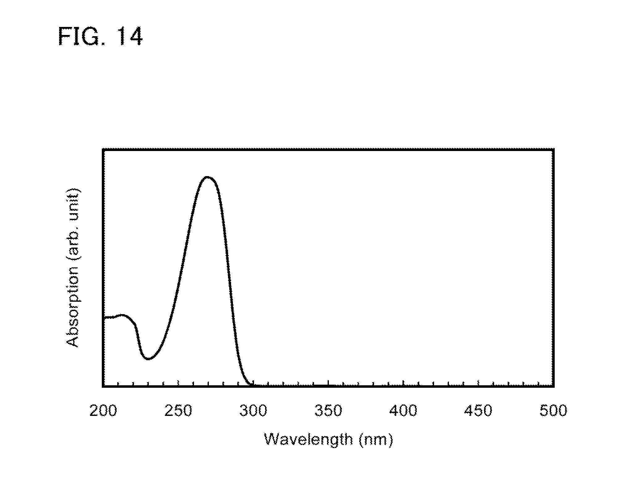 FIG. 14 shows an absorption spectrum of F-RM257-O6 in a dichloromethane solution of F-RM257-O6. The absorption spectrum was measured with an ultraviolet-visible spectrophotometer (V-550, manufactured by JASCO Corporation). The absorption spectrum in FIG. 14 was obtained by subtracting the absorption spectrum of a quartz cell filled with dichloromethane from that of the quartz cell filled with the dichloromethane solution of F-RM257-O6. In FIG. 14, the horizontal axis indicates wavelength (nm) and the vertical axis indicates absorption intensity (arbitrary unit). In the absorption spectrum, an absorption peak was observed at around 269 nm.