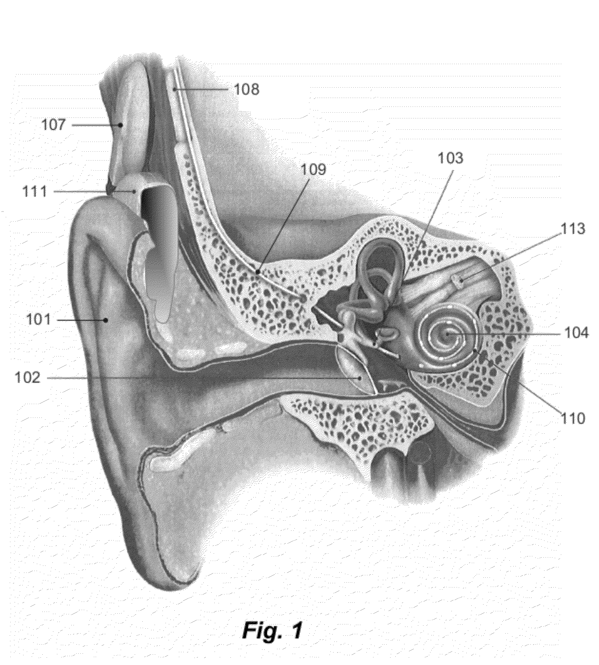 A normal ear transmits sounds as shown in FIG. 1 through the outer ear 101 to the tympanic membrane (eardrum) 102, which moves the bones of the middle ear 103 (malleus, incus, and stapes) that vibrate the oval window and round window openings of the cochlea 104. The cochlea 104 is a long narrow duct wound spirally about its axis for approximately two and a half turns. It includes an upper channel known as the scala vestibuli and a lower channel known as the scala tympani, which are connected by the cochlear duct. The cochlea 104 forms an upright spiraling cone with a center called the modiolar where the spiral ganglion cells of the acoustic nerve 113 reside. In response to received sounds transmitted by the middle ear 103, the fluid-filled cochlea 104 functions as a transducer to generate electric pulses which are transmitted to the cochlear nerve 113, and ultimately to the brain.