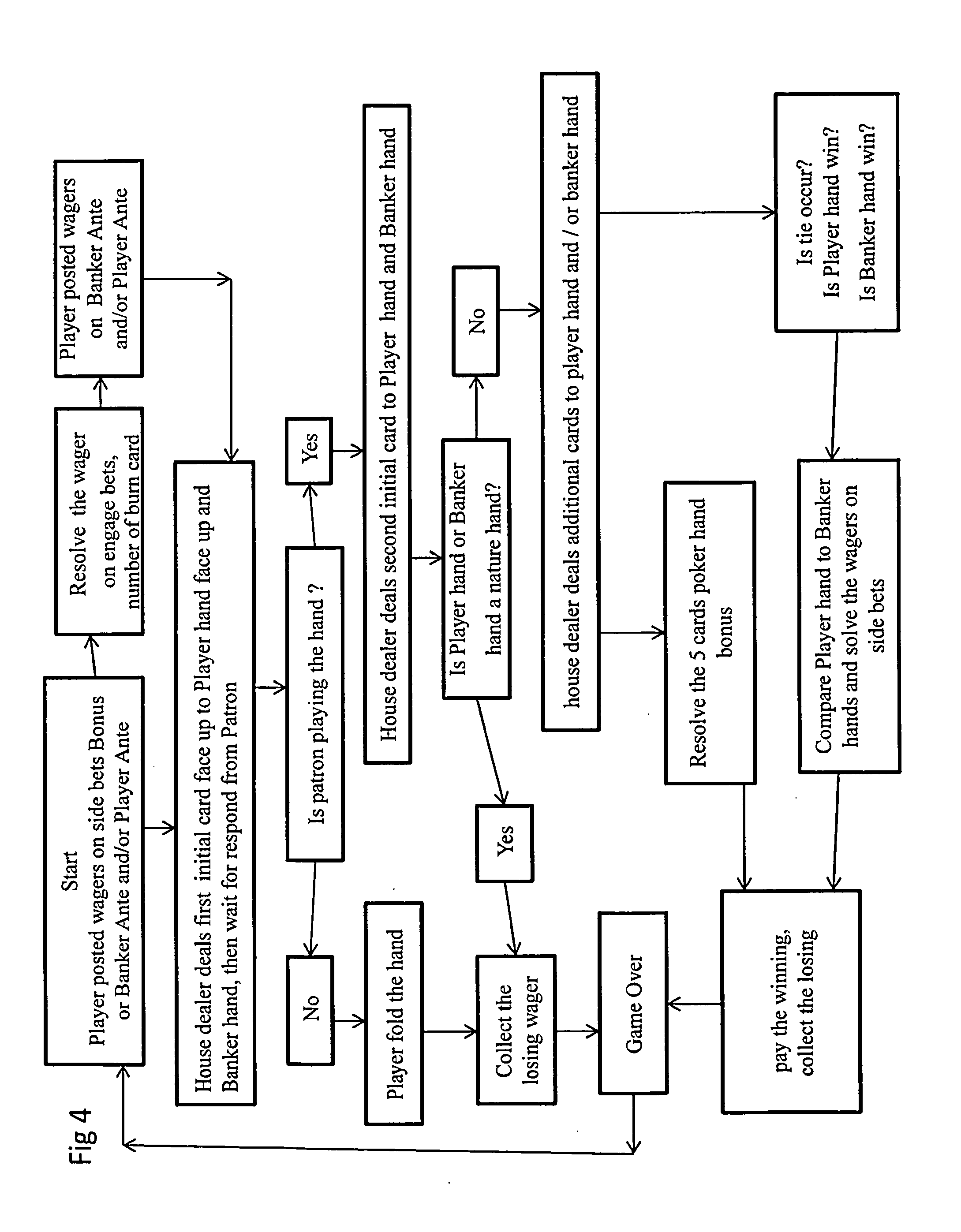 (f) if patron has wager on either Tie or 5 cards poker, but does not want to play the Raise, dealer will collect the wager on ante; and continue deal the game according to the rules of traditional baccarat card game.