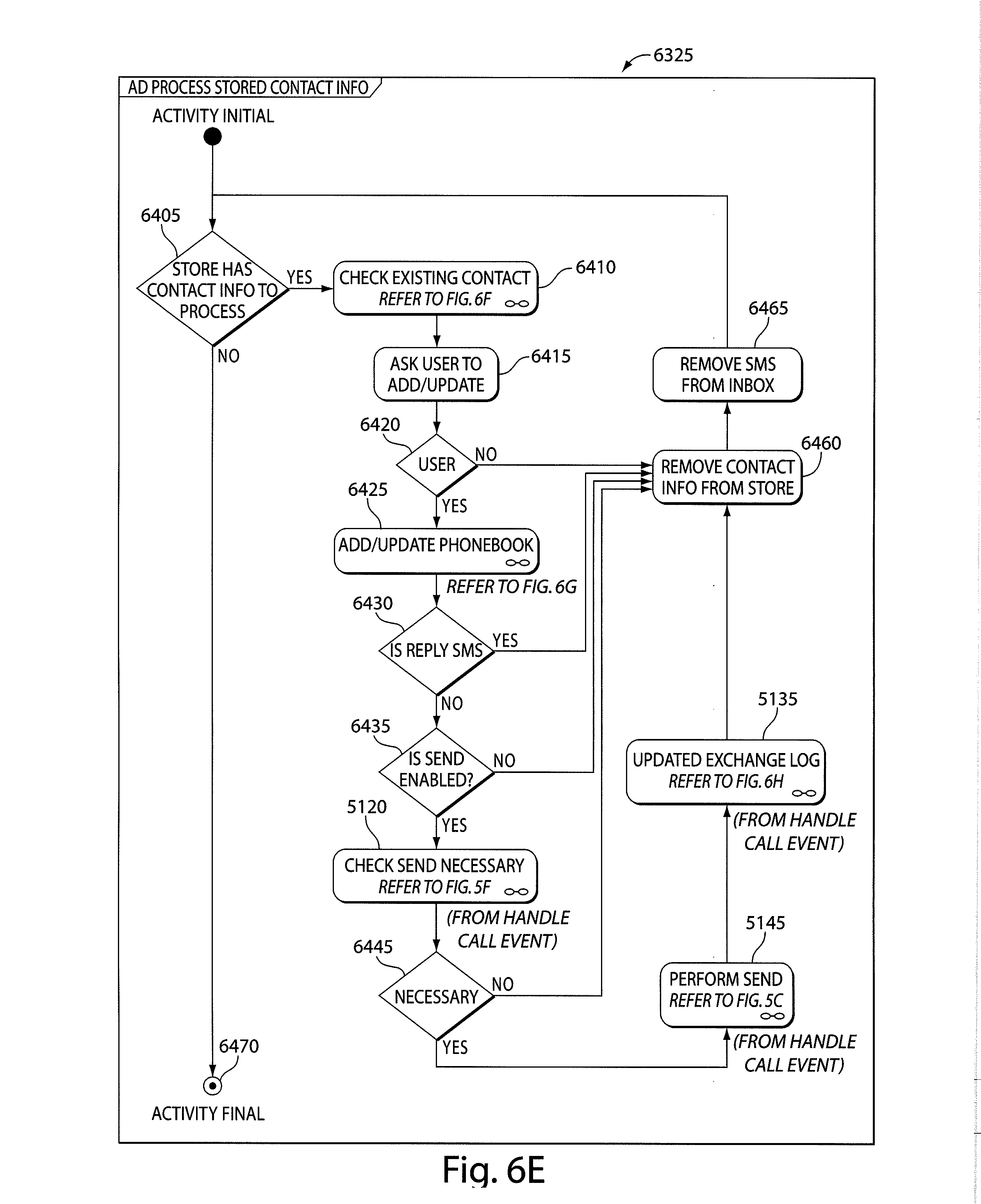 Referring to FIG. 6D, at stage 6310, the second user application module 2091 collects the Folder ID of the event at 6310. At stage 6315, the system checks whether the changed SMS is in the inbox. If the changed SMS is in the inbox, the application module 2091 checks whether there are more entries within the inbox at 6320. If not, the application module 2091 processes the stored contact information, at stage 6325 (see FIG. 6E and associated description). If there are more entries within the inbox, at stage 6330, the application module 2091 collects the next entry. At stage 6335, the application module 2091 stores the first SMS and then returns to the SMS inbox and checks for the next available SMS. Once the entry is InStore, at stage 6340, the application module 2091 removes the entry from the Store and parses the contact information, at stage 6345. At stage 6350, the application module 2091 determines whether the contact information is a CallerXchange SMS. If it is not, the application module 2091 returns to stage 6320. If the contact information is a CallerXchange SMS, the application module 2091 stores the contact information, at stage 6355 (see FIG. 6E and associated description). Once the final SMS is processed at 6325, the application module proceeds to stage 6360.