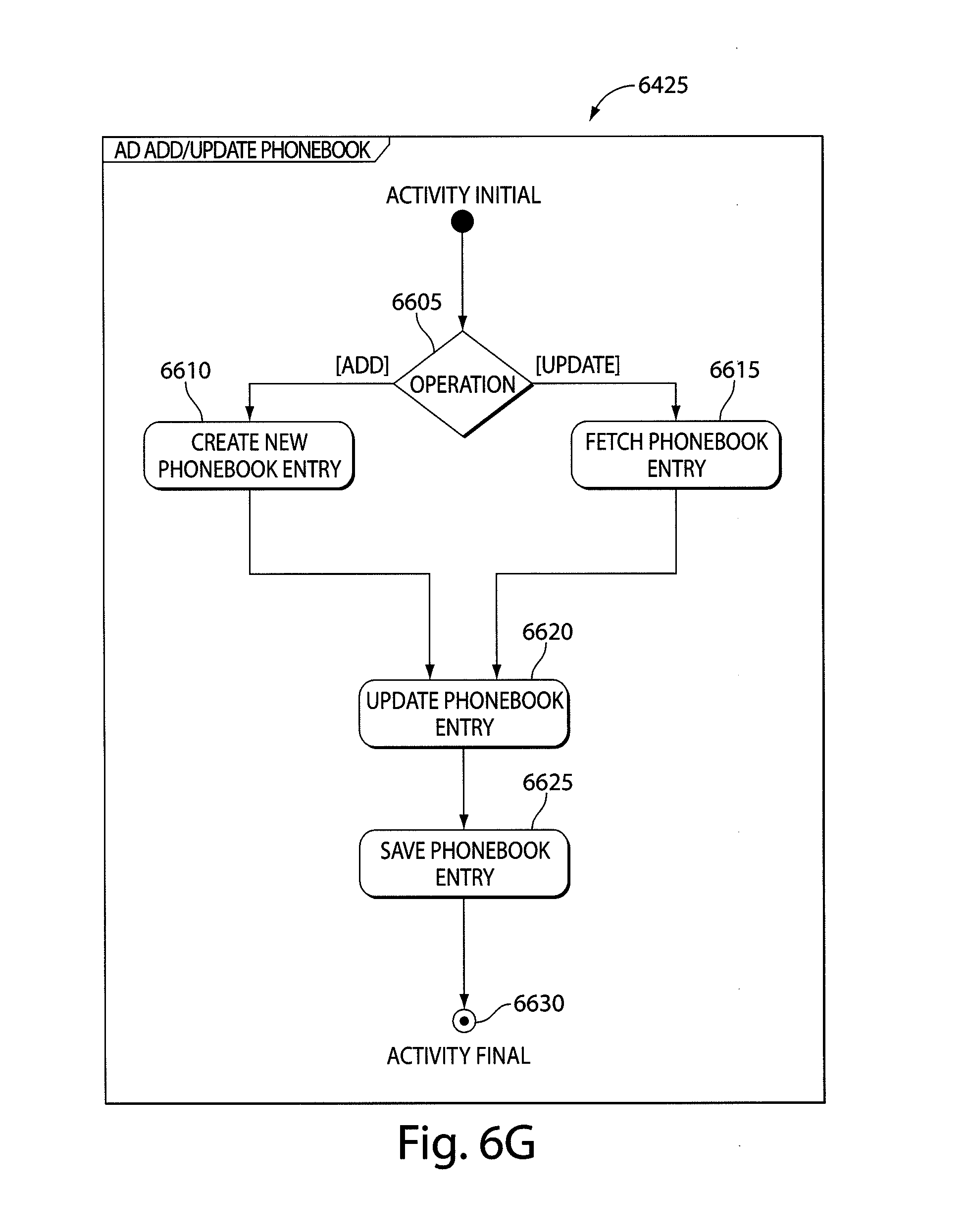 Contact information can be inserted or updated in the second user phonebook module 2055. Referring to FIG. 6G, the second user selects “Add” or “Update” at stage 6425 in FIG. 6E, reflected by stage 6605 in FIG. 6G. The first user contact entry is stored or updated in the second user phonebook module 2055. If the first user does not exist as a contact in the second user phonebook module 2055 and the second user adds the first user to the phonebook, then a new phonebook entry is created, at stage 6610. If the first user already exists in the second user phonebook and the second user wants to update the first user's contact information, at stage 6615, the second user application module 2091 fetches a phonebook entry. If the new record is created or updated successfully, the second user application module 2091 displays a message, for example, “first user added to phonebook” or “first user contact data updated.” At stage 6625, the added or updated contact information is saved and the second user application module 2091 returns to the Process Stored Contact Information (see FIG. 6E and associated description) via 6630. If the second user application module 2091 can not create the new entry within the second user phonebook module 2055, the phone displays a “phonebook full” message through the Show Dialog Proactive Command 3130.
