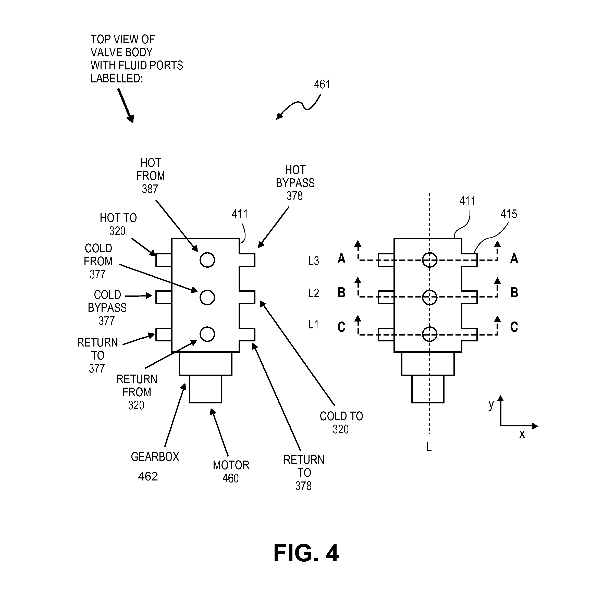 a valve body having at least two sets of ports, the sets disposed at different longitudinal lengths of the valve body, each set of ports including at least three ports disposed at different angular positions in the valve body to couple to the supply and return lines; a rotor disposed in the valve body, the rotor having at least two sections stacked along the longitudinal length, each section comprising three fluid channels in longitudinal alignment with one of the sets of ports; and apportioning the relative amounts of heat transfer fluid at the first and second temperatures by rotating the rotor over angular positions to fluidly couple together pairs of ports in each of the sets of ports synchronously as a function of the rotor's angular position. 16. The method of 17. The method of 18. The method of 19. The method of a valve body having three sets of ports, wherein a first set of ports includes: